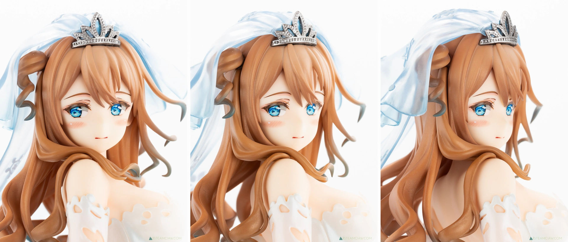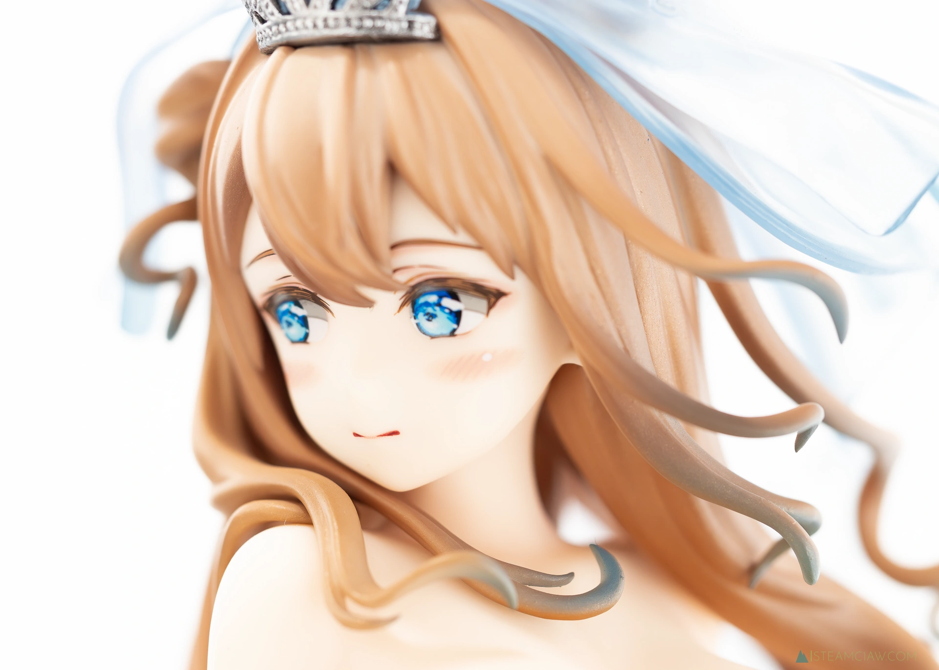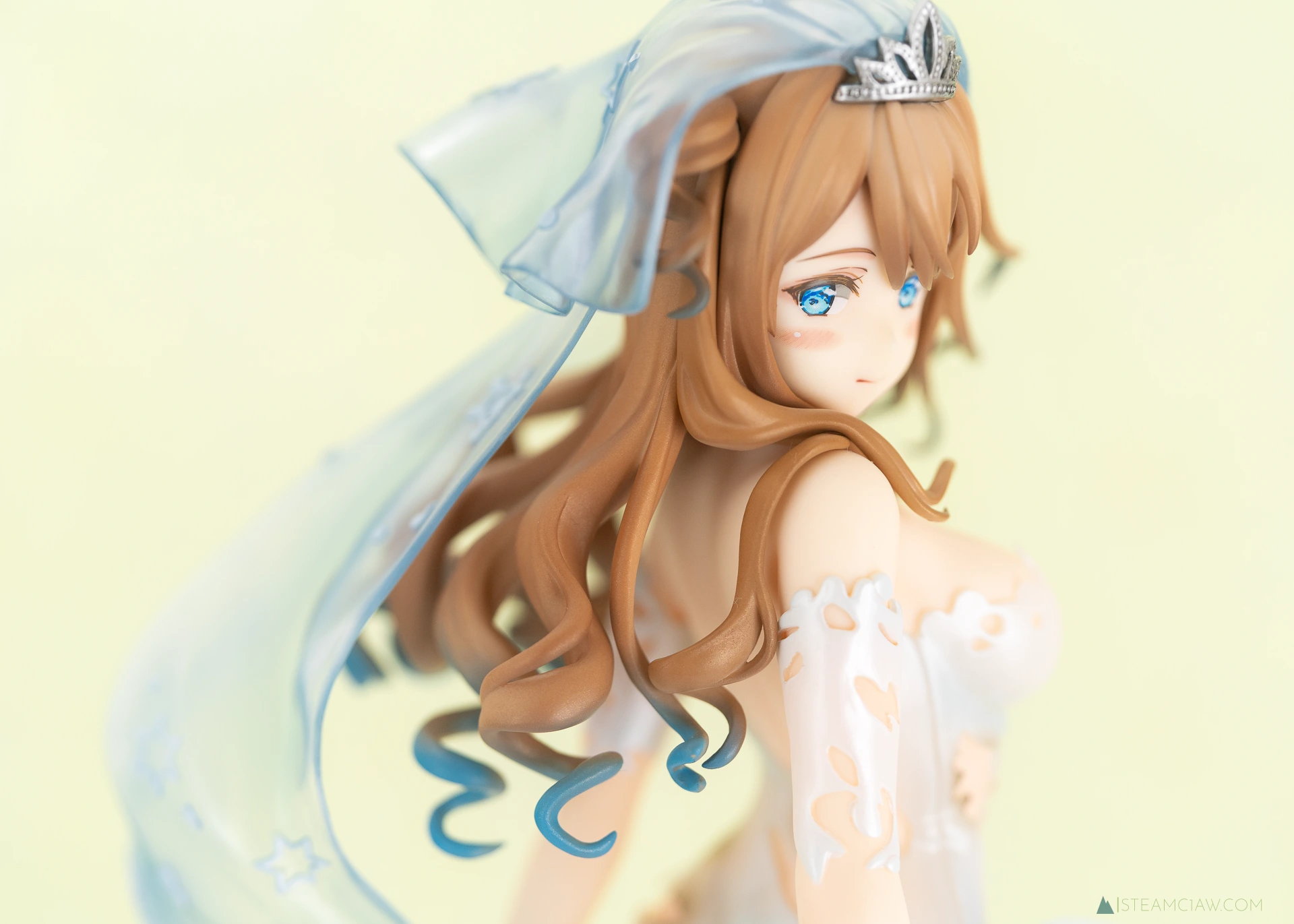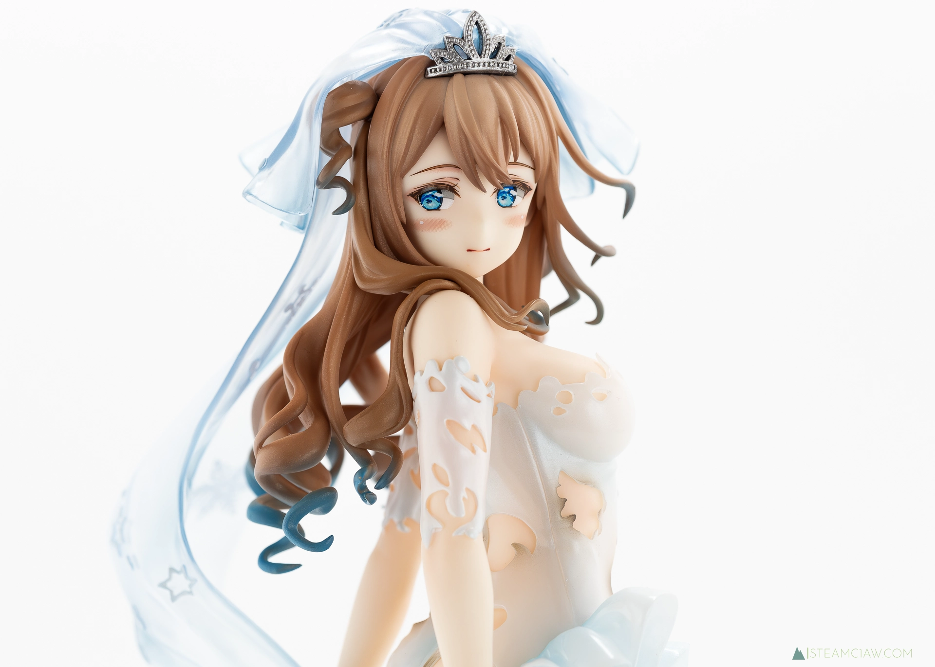 見てのとおり、ドレスはツヤのあるパール塗装でゴージャスな仕上がり。ヴェール、髪の毛のハイライト、瞳の色と、青色が随所に散りばめられているフィギュアですが、白と青のグラデーションはとても質感が高いですね。