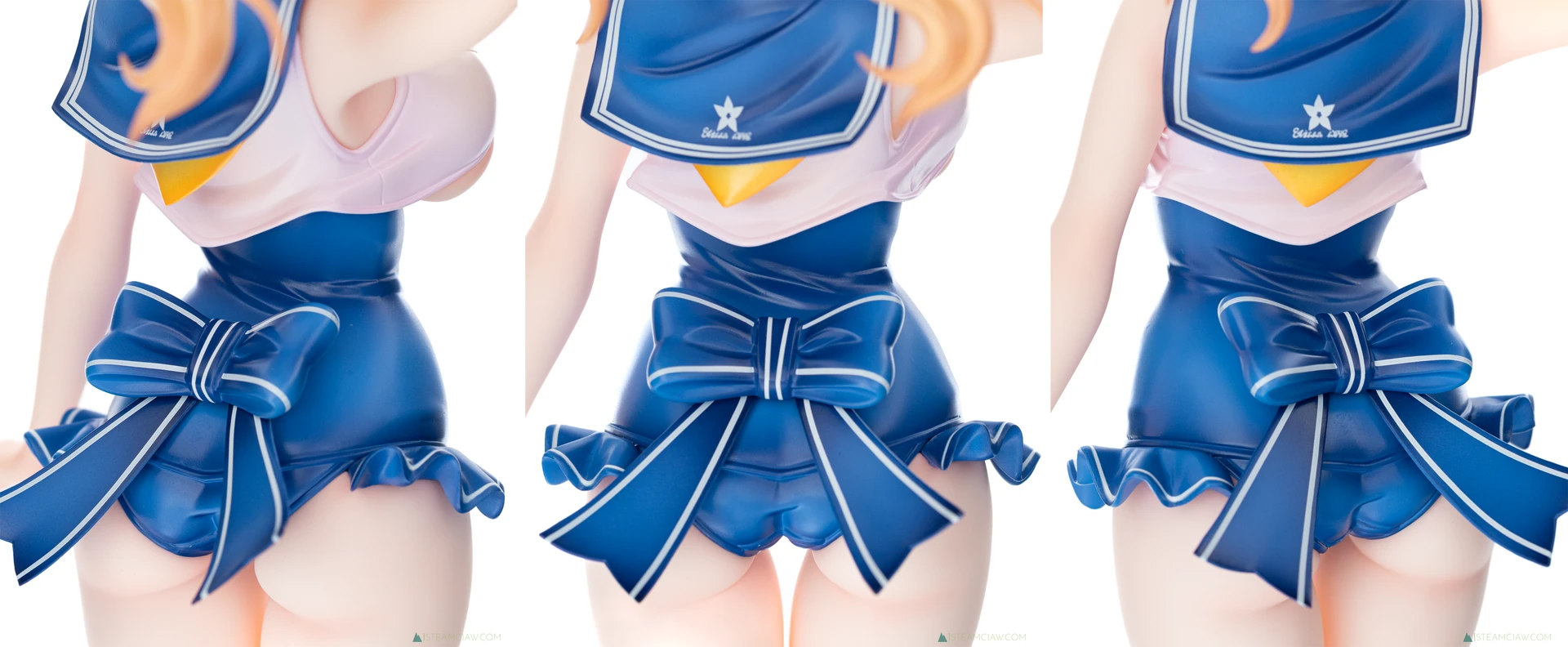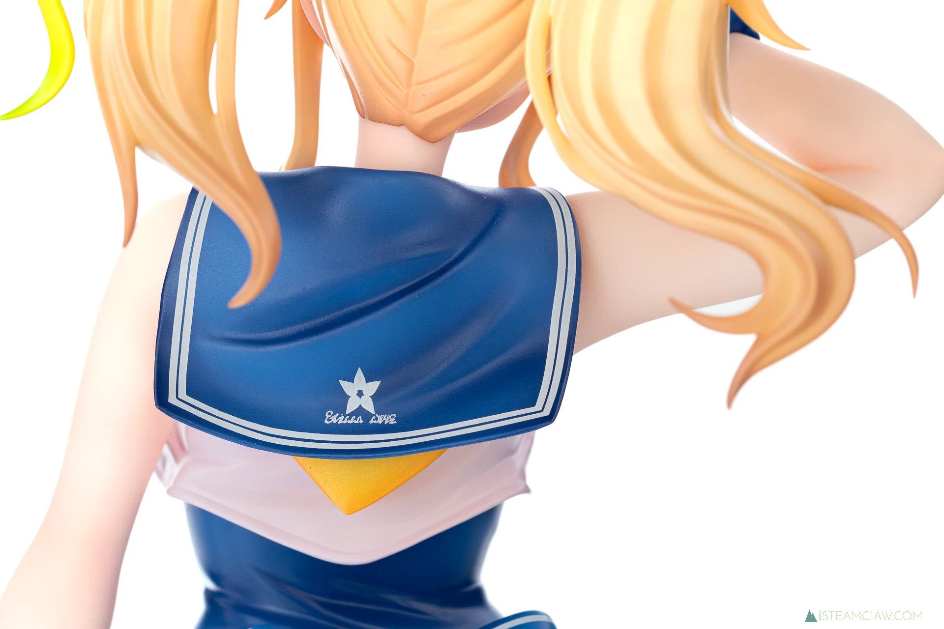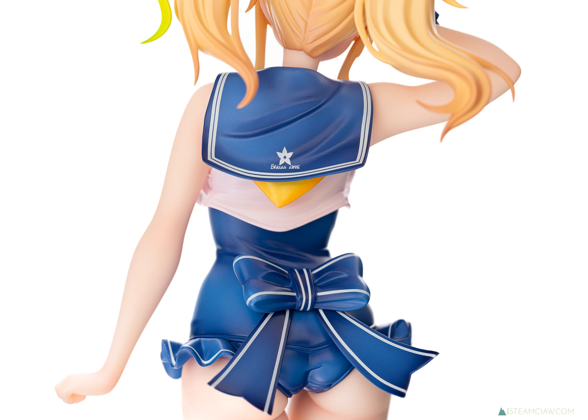 体正面はタイトな水着がピンと張ったような造形、塗装ですが、背中側にはポージングにあわせたシワが入っています。セーラー襟の背中部分には、台座と同じ、花を模したような模様が入っていますが、調べても詳細は不明。所属組織の記章か何かかな?