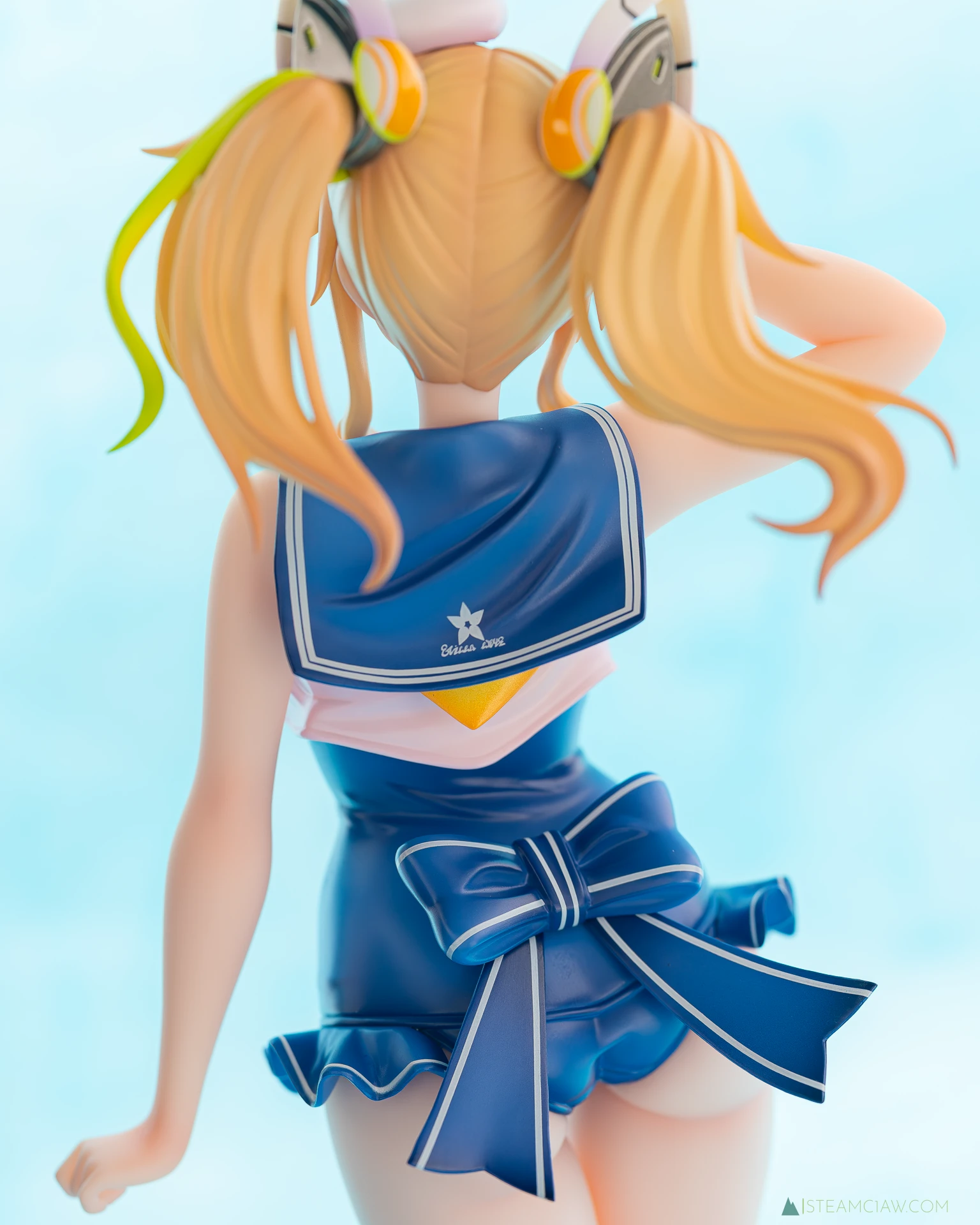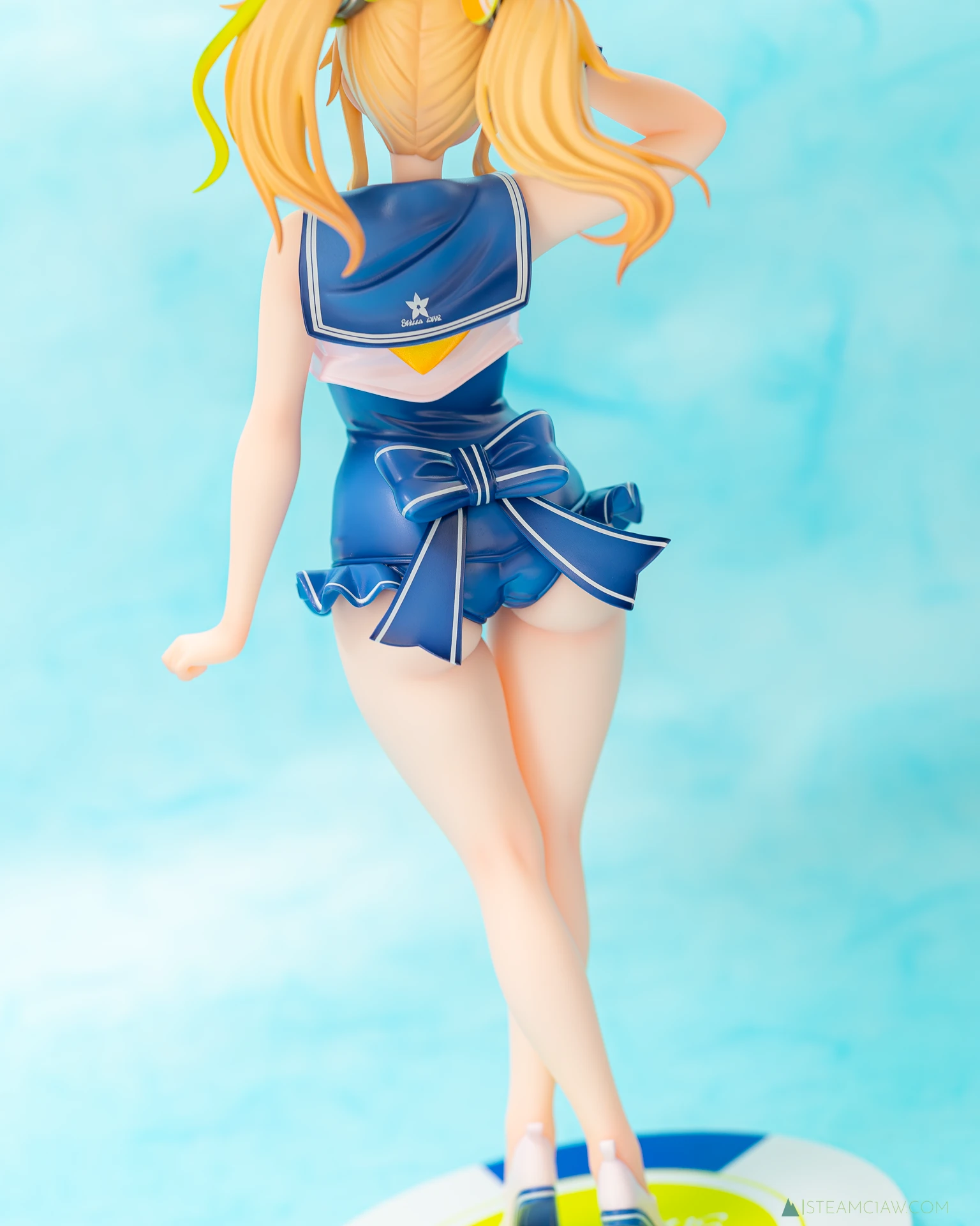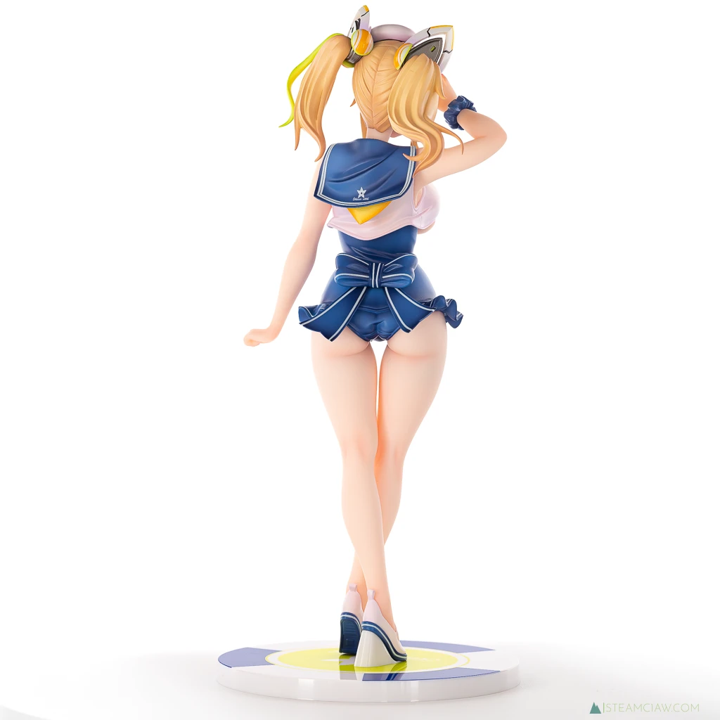 体正面はタイトな水着がピンと張ったような造形、塗装ですが、背中側にはポージングにあわせたシワが入っています。セーラー襟の背中部分には、台座と同じ、花を模したような模様が入っていますが、調べても詳細は不明。所属組織の記章か何かかな?