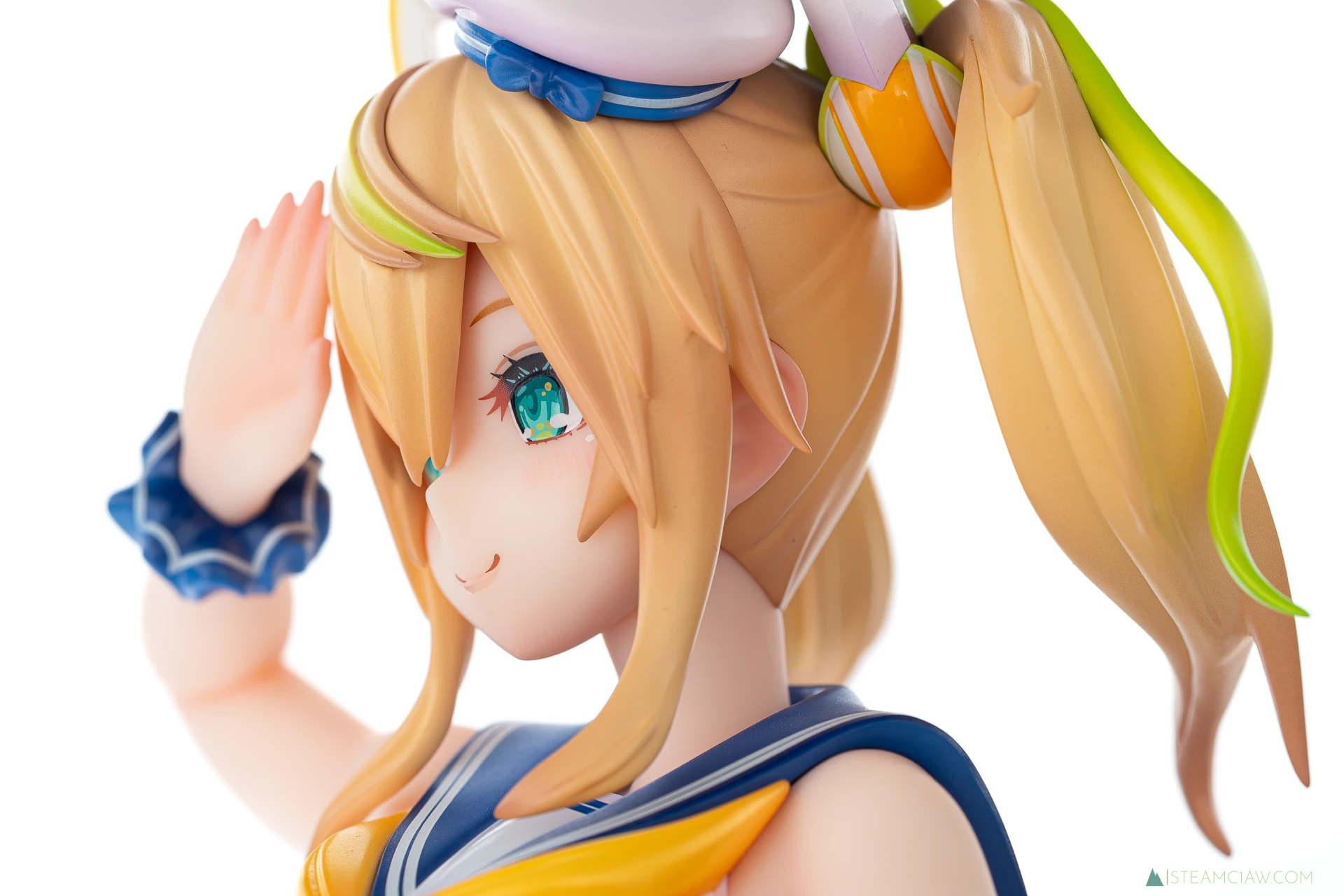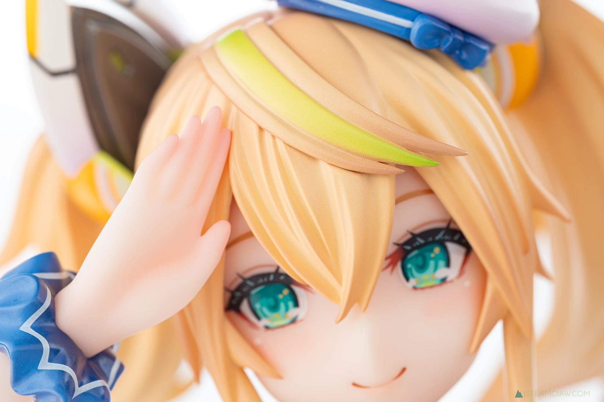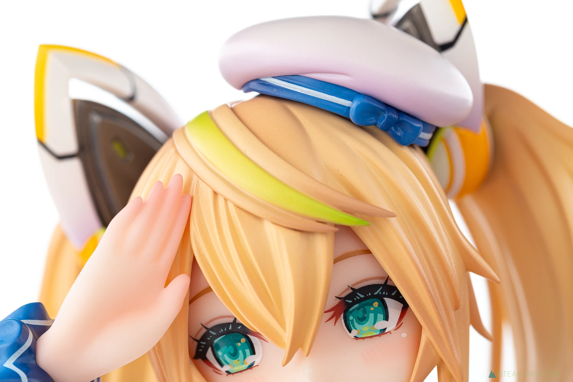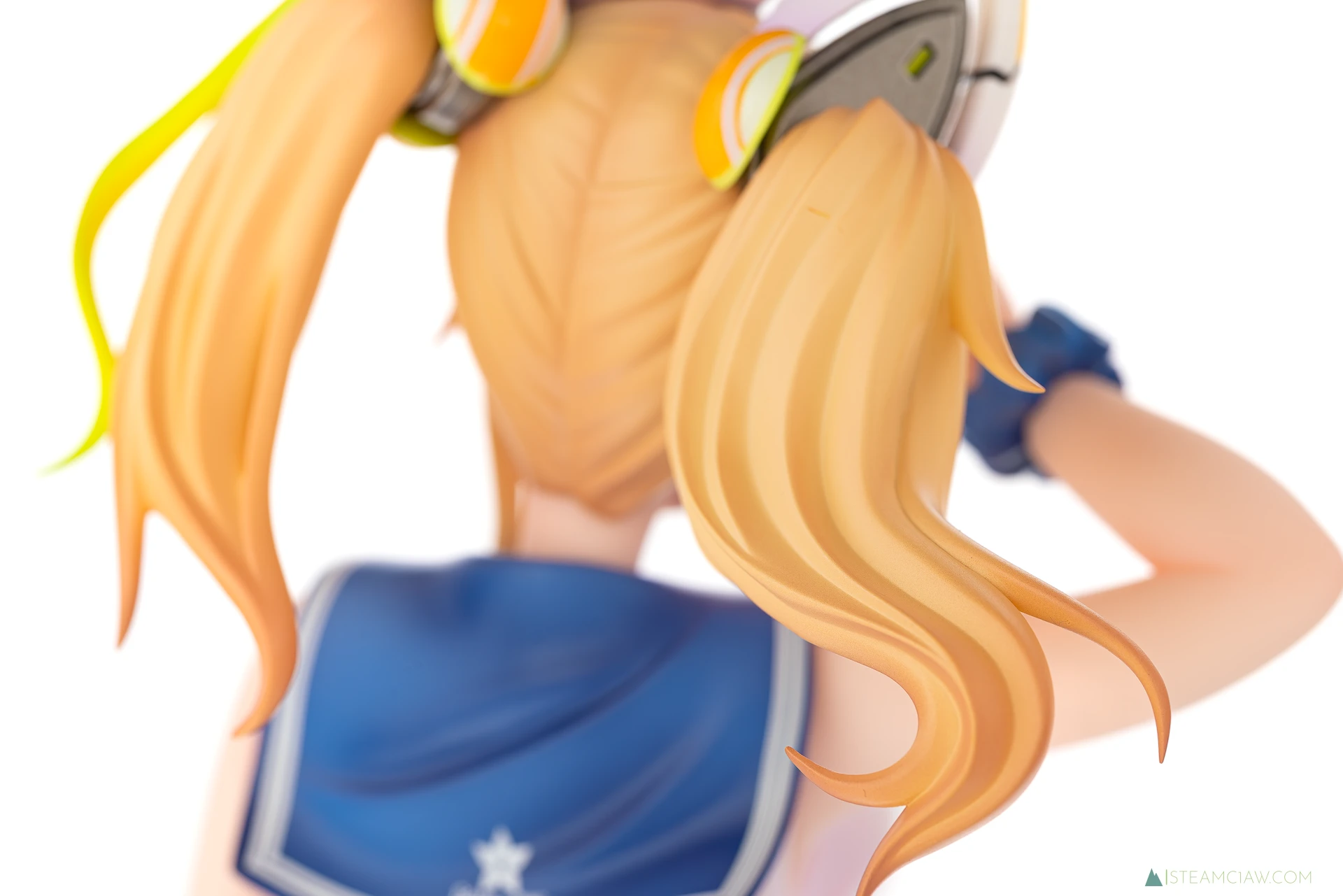 髪の毛は黄金色のツインテール。敬礼のポーズにあわせてテール部分が本人からみて右に靡いており、しっかり動きが感じられる造形です。一方で、アネットの三つ編みヘアほど毛束の彫り込みへの拘りはみられないかな。