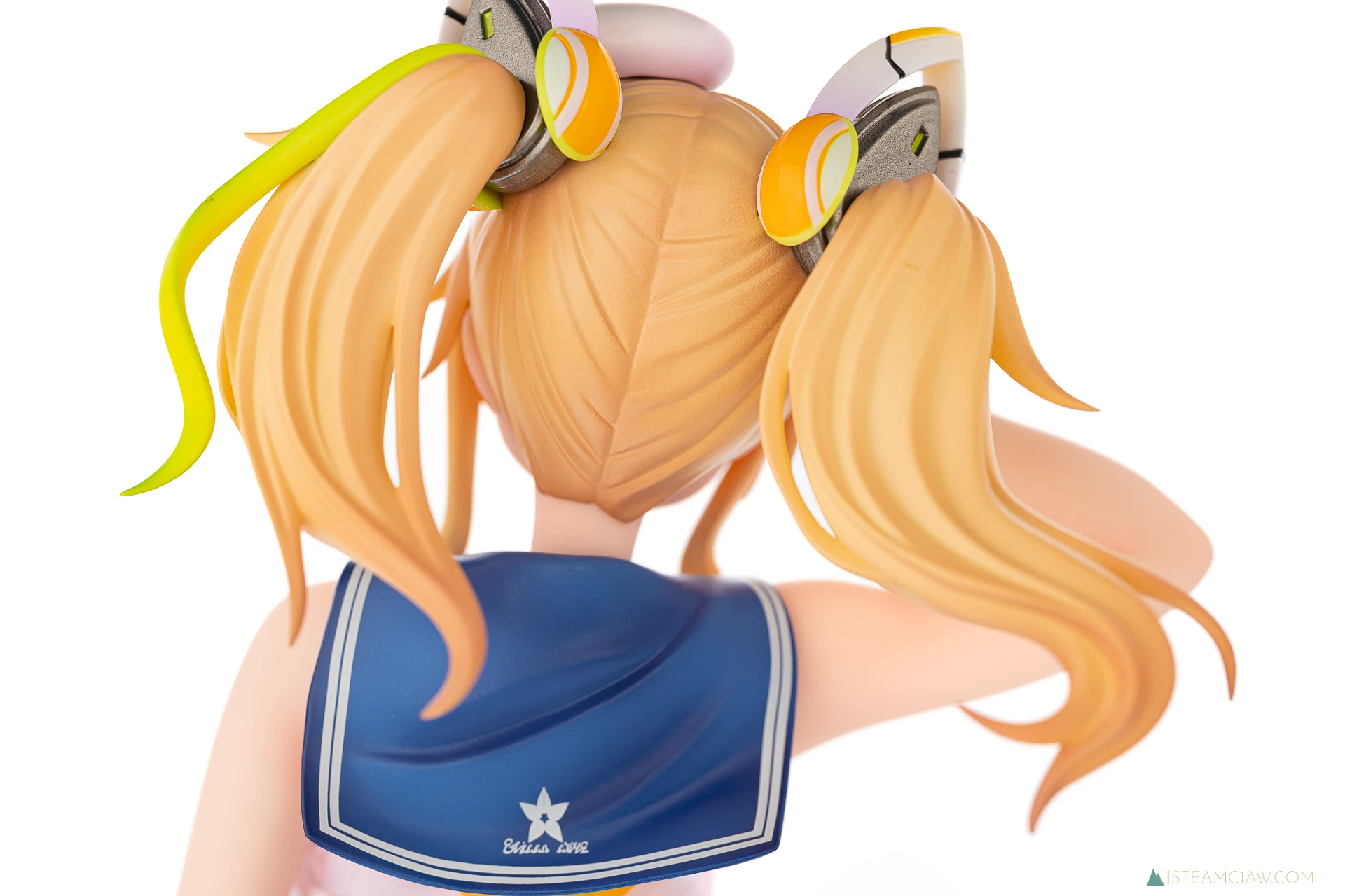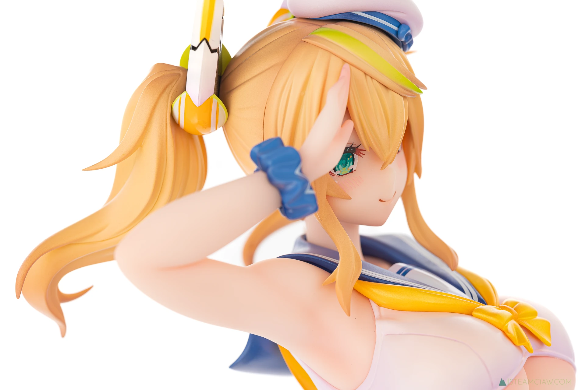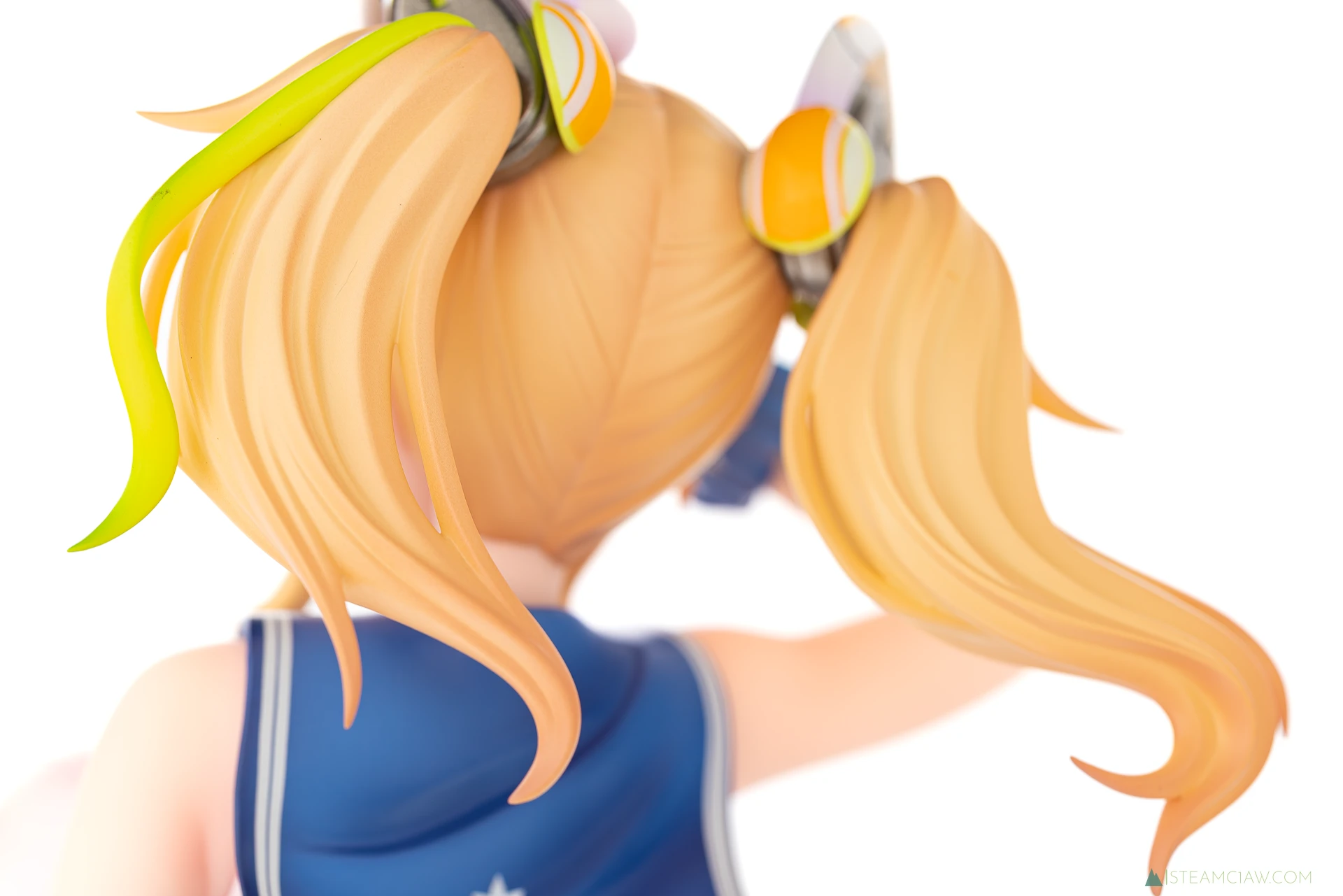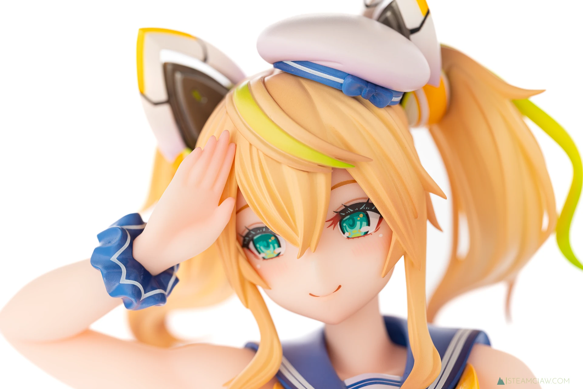 髪の毛は黄金色のツインテール。敬礼のポーズにあわせてテール部分が本人からみて右に靡いており、しっかり動きが感じられる造形です。一方で、アネットの三つ編みヘアほど毛束の彫り込みへの拘りはみられないかな。