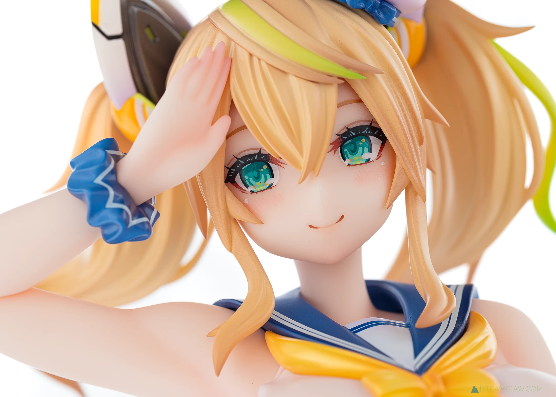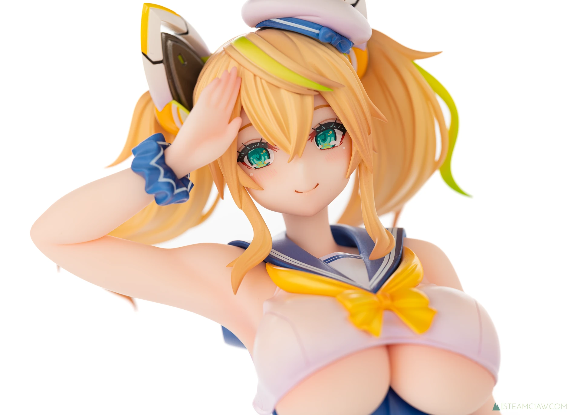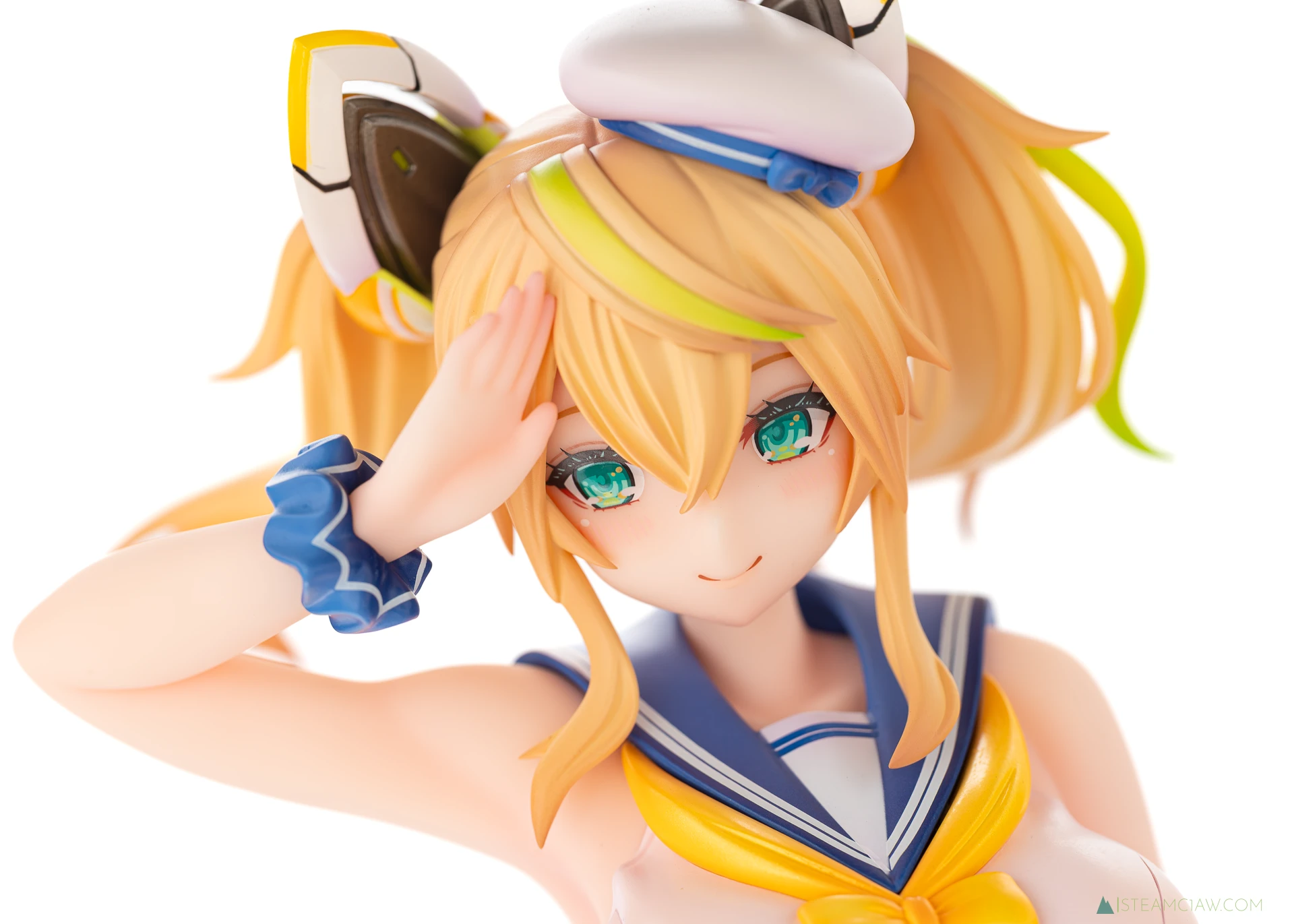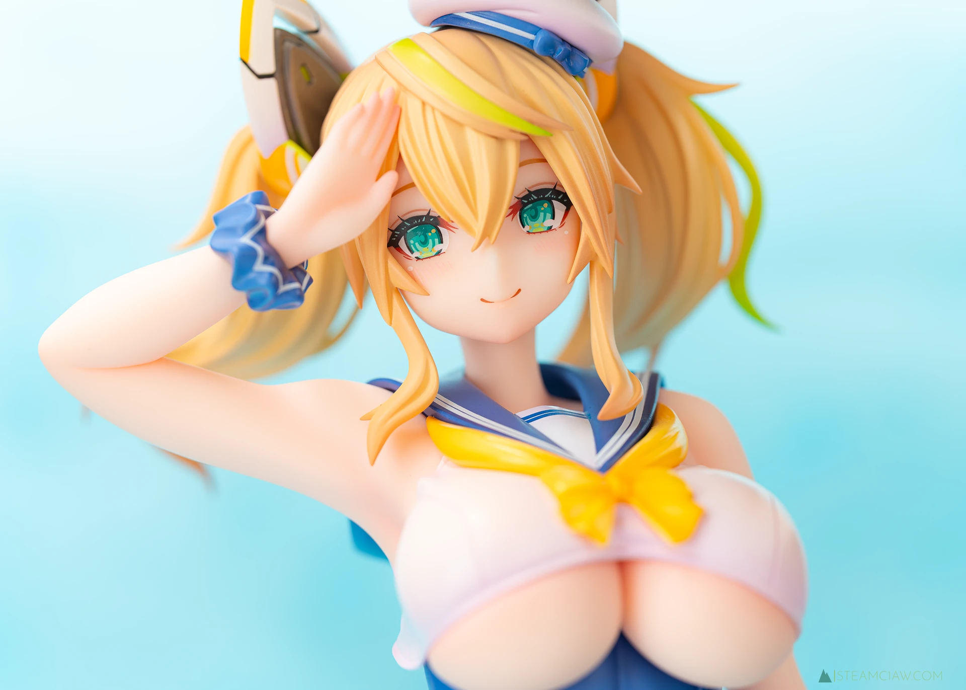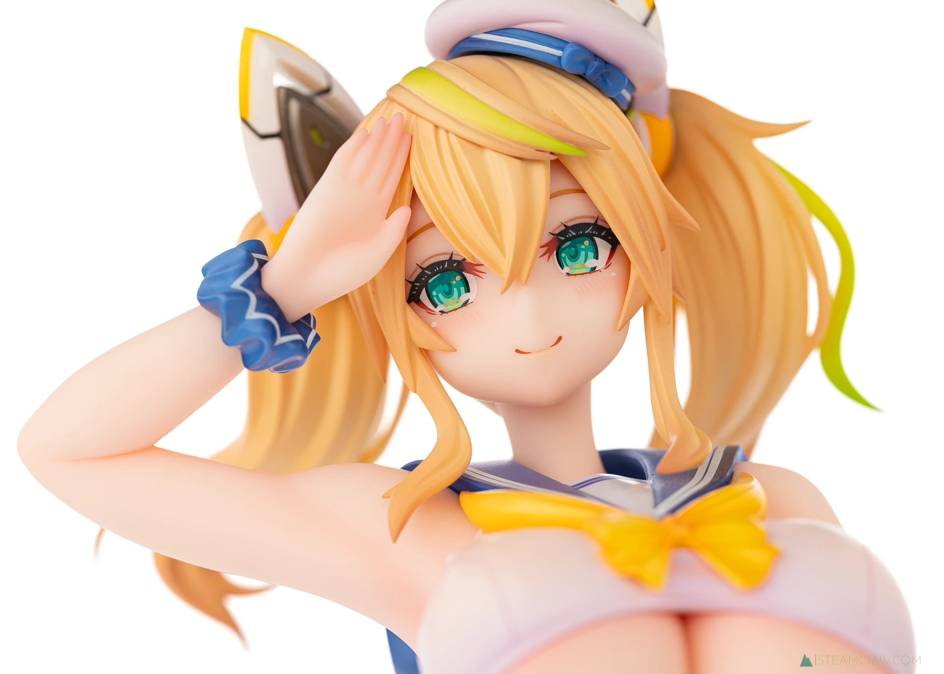 髪の毛は黄金色のツインテール。敬礼のポーズにあわせてテール部分が本人からみて右に靡いており、しっかり動きが感じられる造形です。一方で、アネットの三つ編みヘアほど毛束の彫り込みへの拘りはみられないかな。