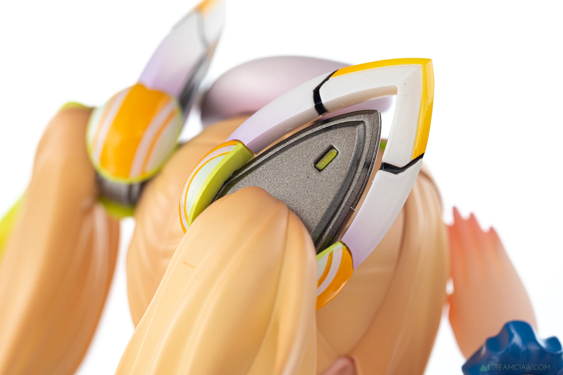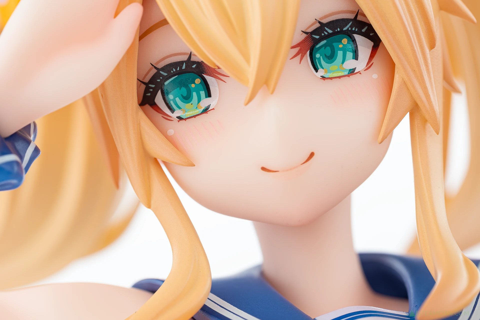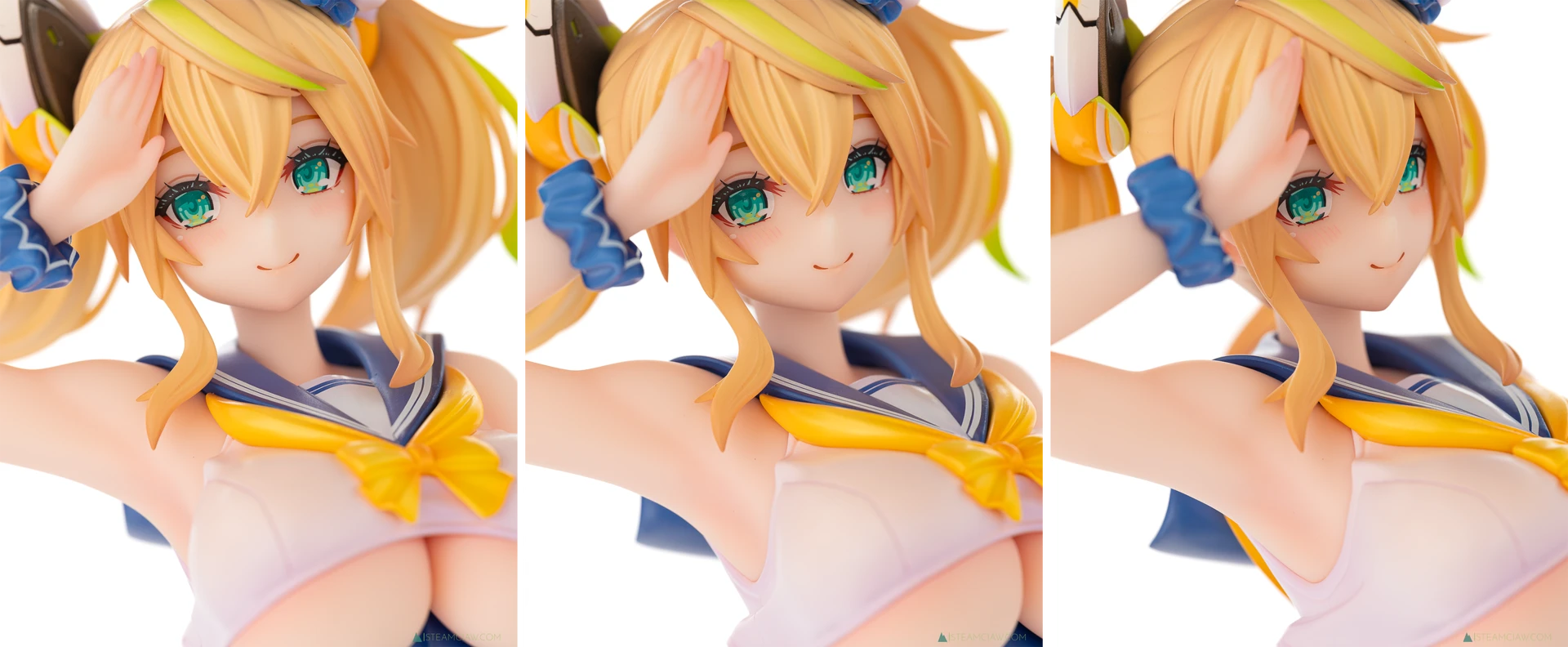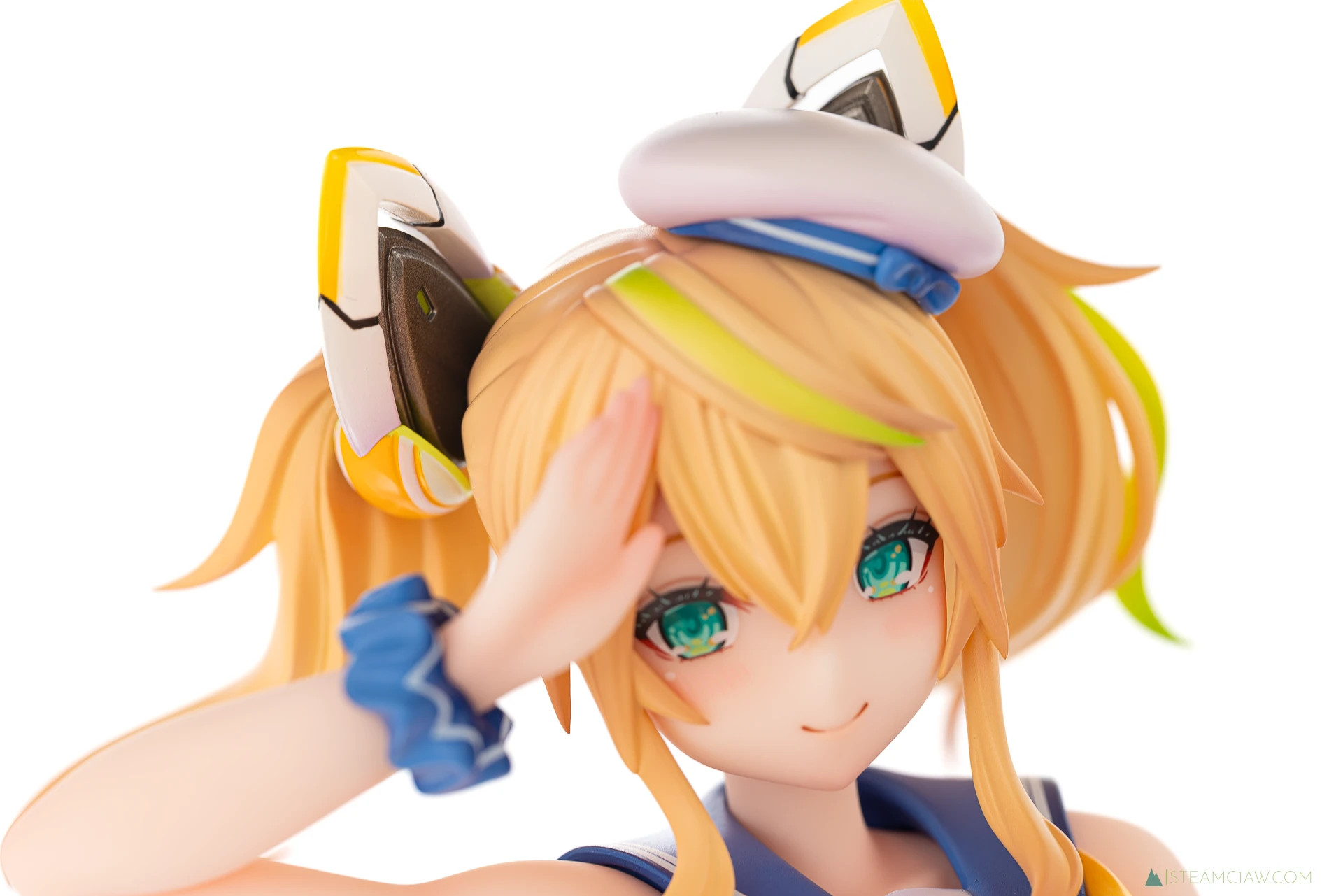 髪の毛は黄金色のツインテール。敬礼のポーズにあわせてテール部分が本人からみて右に靡いており、しっかり動きが感じられる造形です。一方で、アネットの三つ編みヘアほど毛束の彫り込みへの拘りはみられないかな。