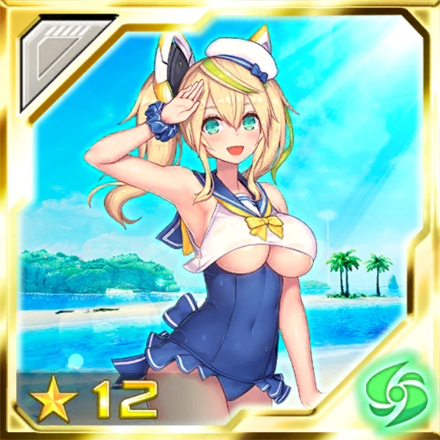 スクール水着にセーラー襟のついたノースリーブシャツという、アネットとお揃いのスタイル。スクール水着部分はバスト下までしか覆っておらず、バストはノースリーブシャツで隠すという実用性を無視したデザイン。アネットも同じデザインですが、あちらと異なりジェネの場合はシャツがバストを覆いきれていないので、この不思議なデザインがより目立ちます。