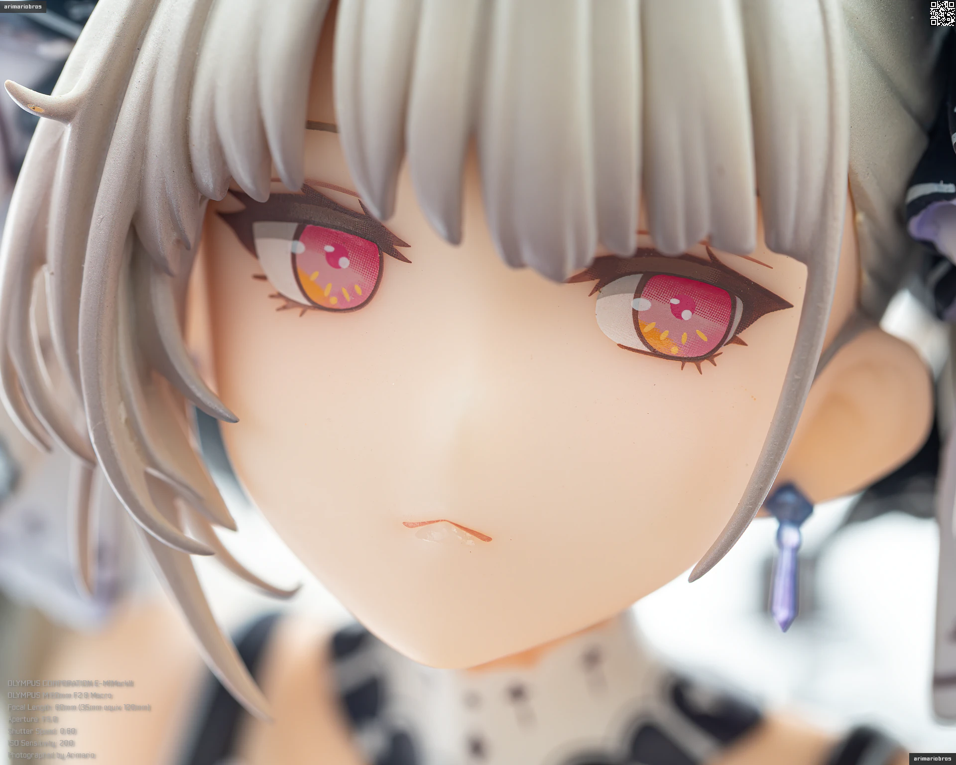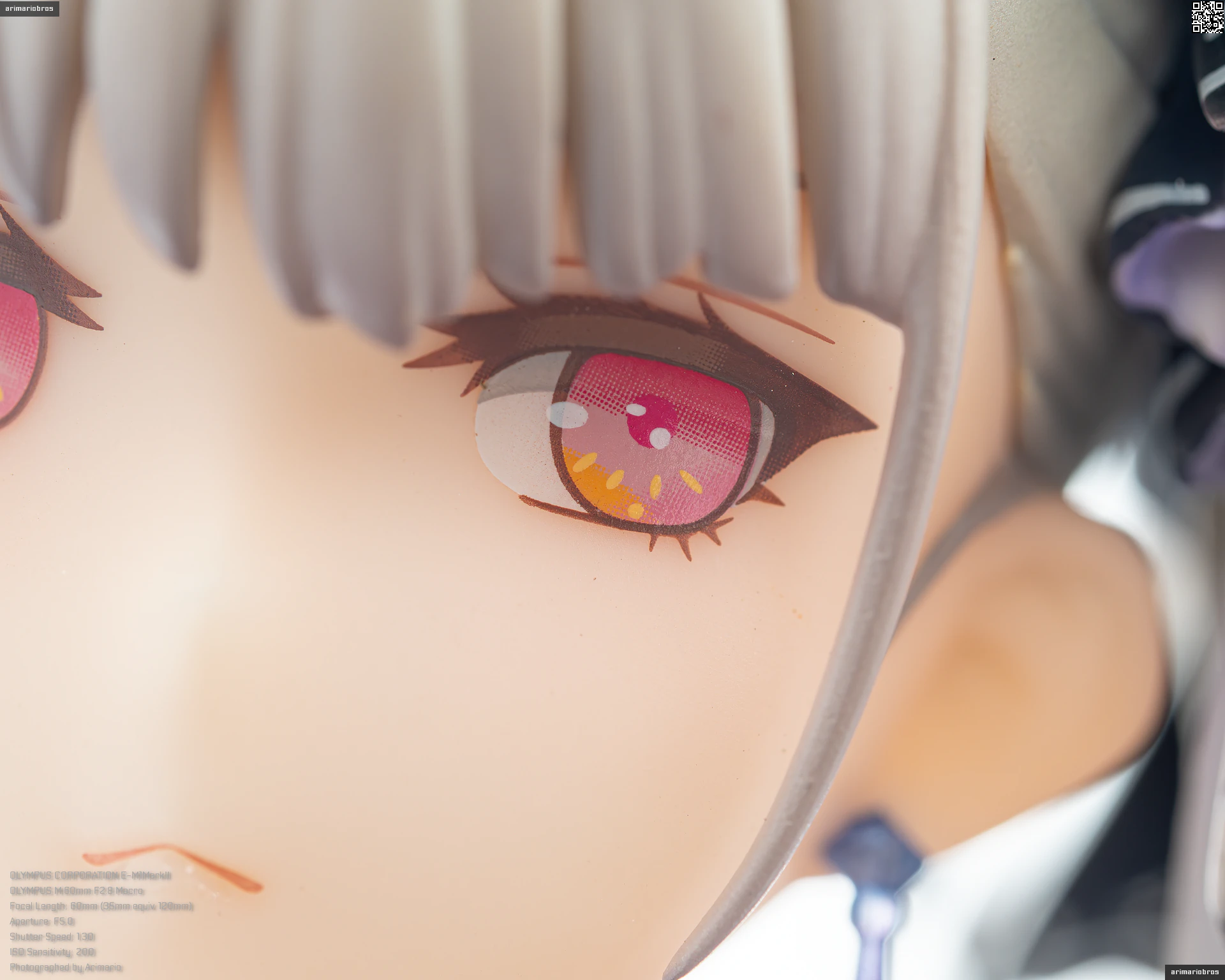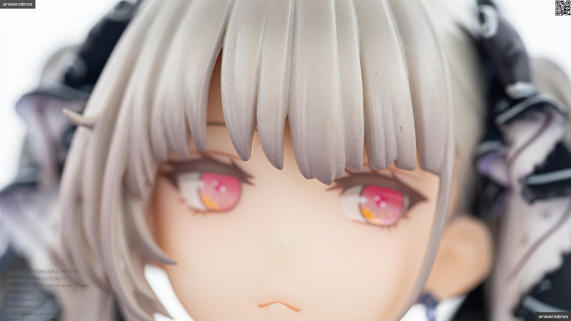 瞳はラベンダー色のような薄い紫。クリア仕上げで透明感のある塗装です。オレンジ色のハイライト入りで、細かいところまでキレイに描かれていますね。眉毛やアイシャドウは薄めのグレーで、ツンとしている割にどこか柔らかさのある表情。ただし、彩色見本にあったチークが省略されており、色っぽさはなくなってしまいました。