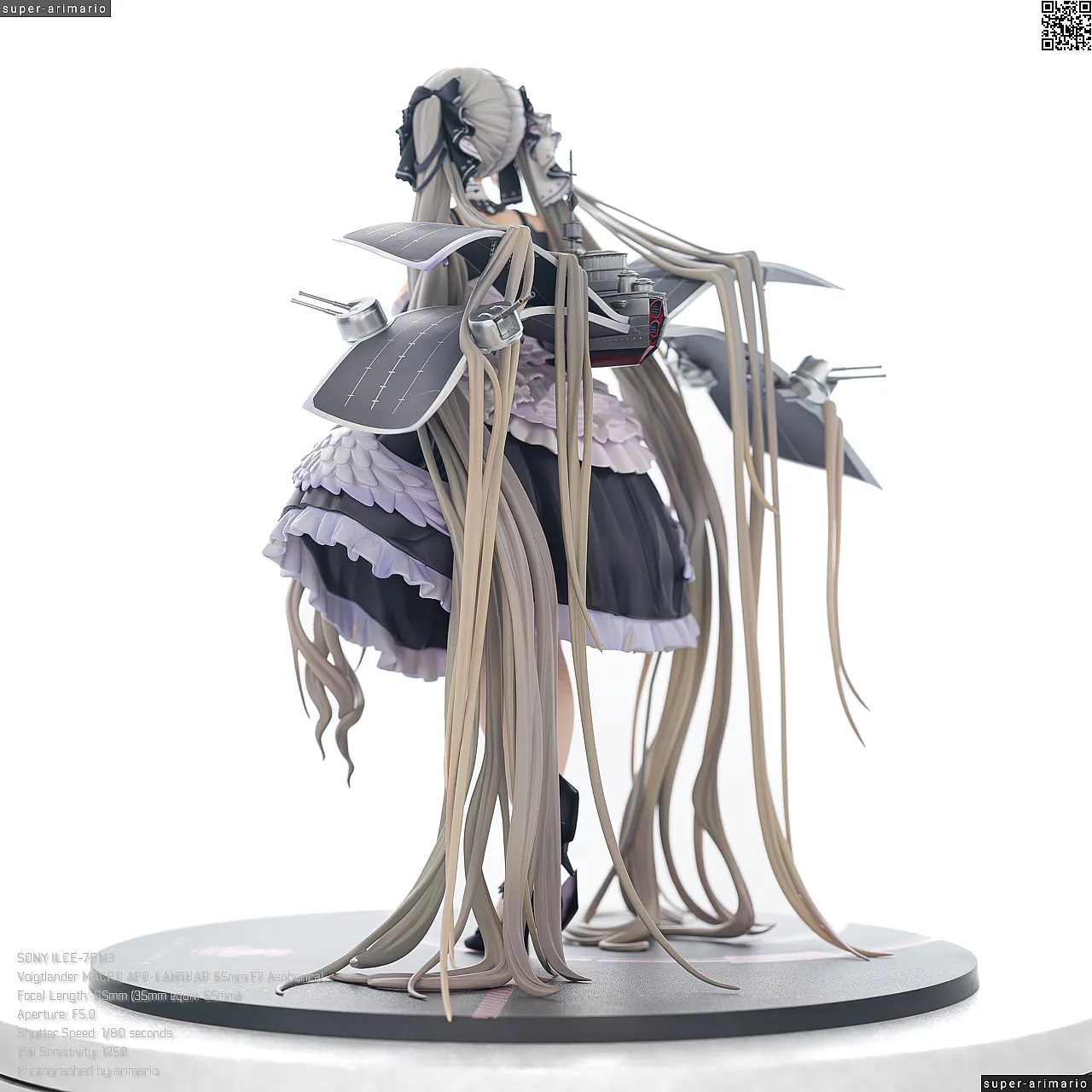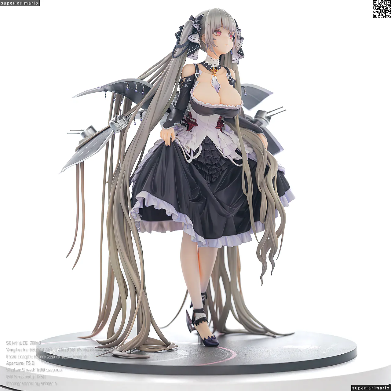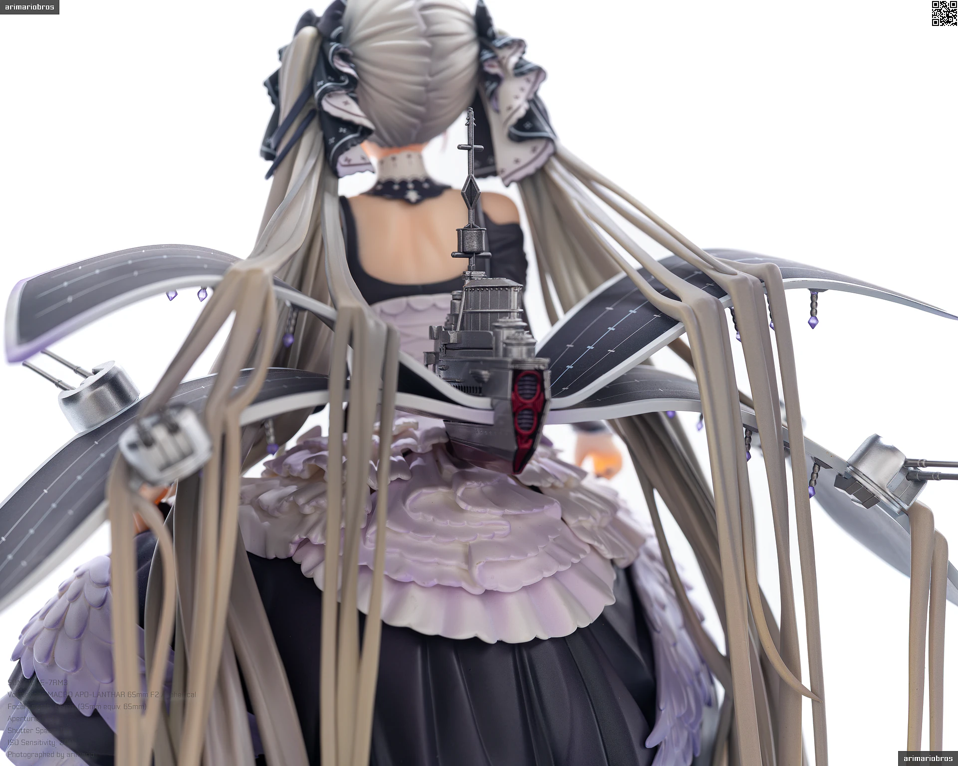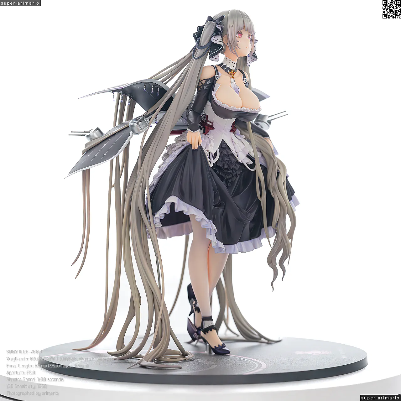 すました様子で、挨拶をするような仕草で立体化。ゴシック調のドレスは、フリルや羽をあしらった装飾がボリューミーに作り込まれており、密度感のある出来栄えです。特徴的なロングヘアーは、スカートや艤装にかかって流れるラインが美しく、グラデーションによる繊細な色の変化が色彩に深みを出しています。