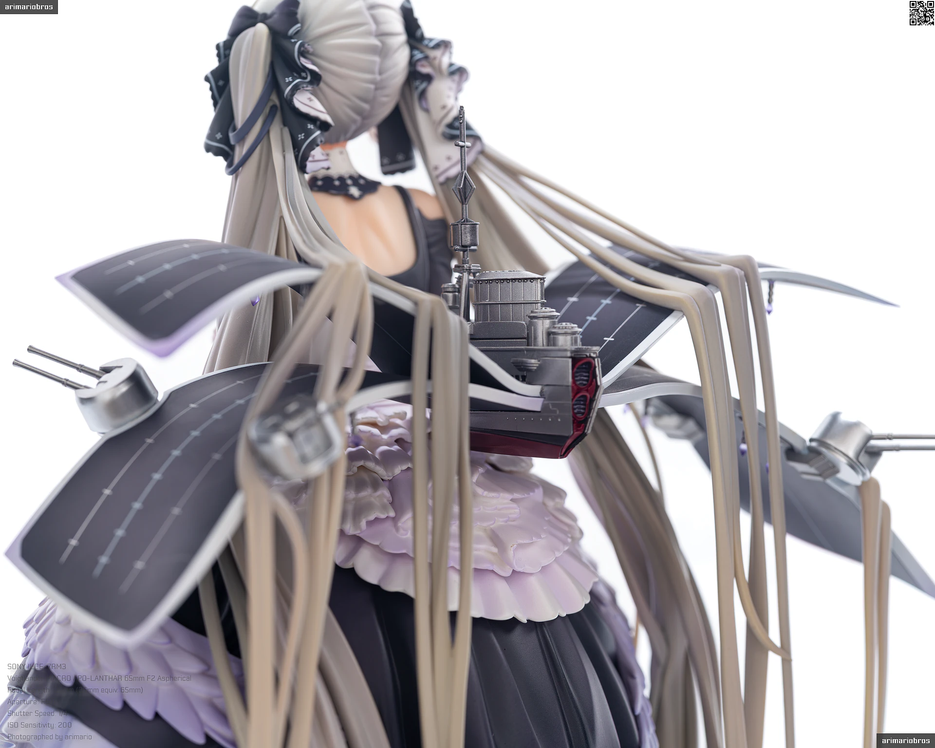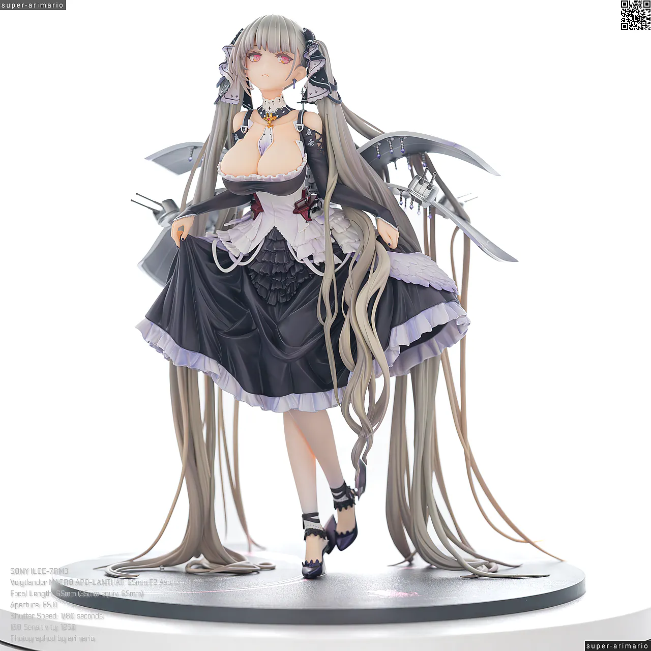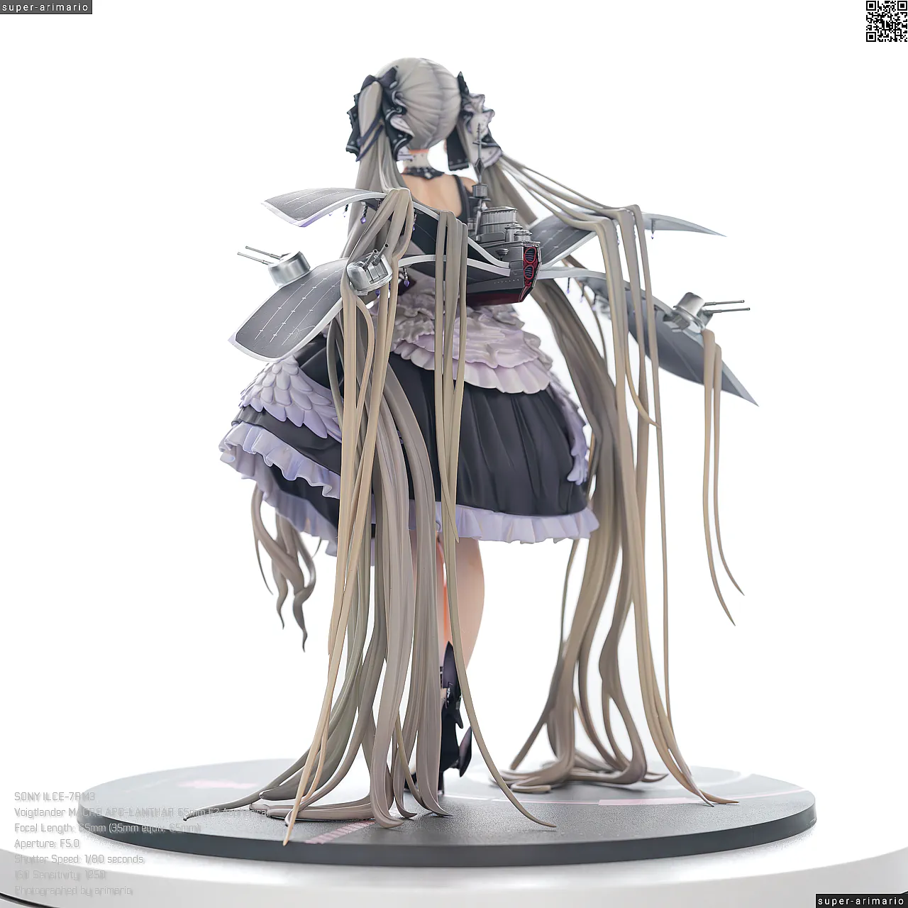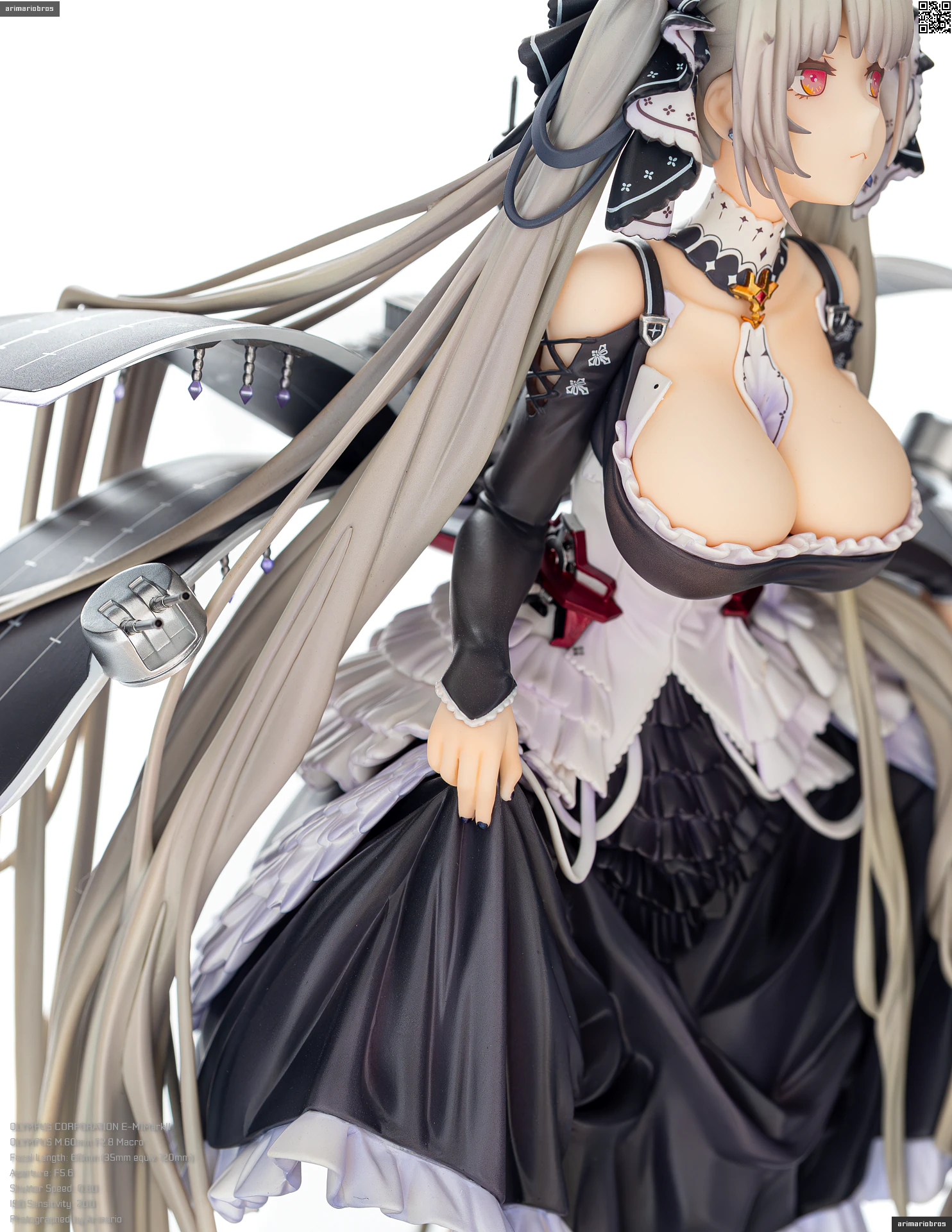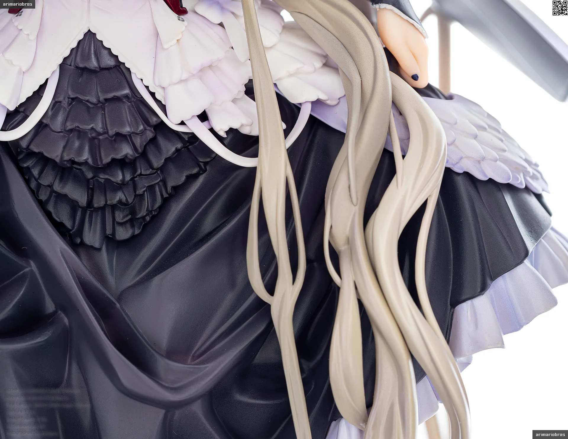 すました様子で、挨拶をするような仕草で立体化。ゴシック調のドレスは、フリルや羽をあしらった装飾がボリューミーに作り込まれており、密度感のある出来栄えです。特徴的なロングヘアーは、スカートや艤装にかかって流れるラインが美しく、グラデーションによる繊細な色の変化が色彩に深みを出しています。