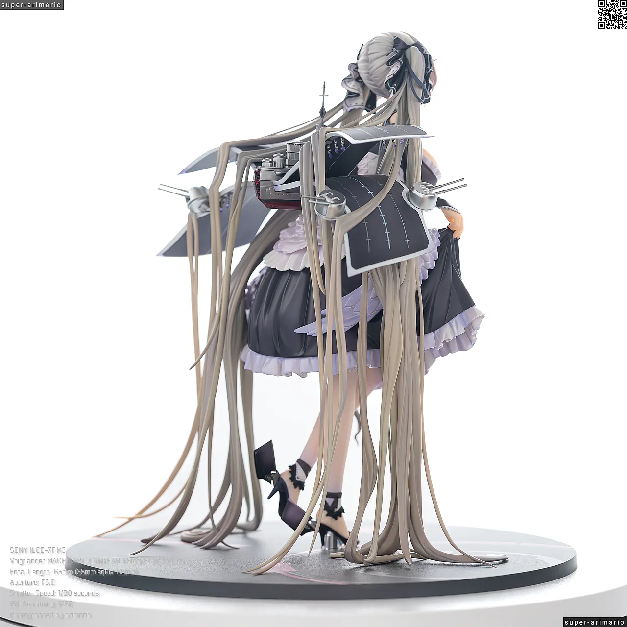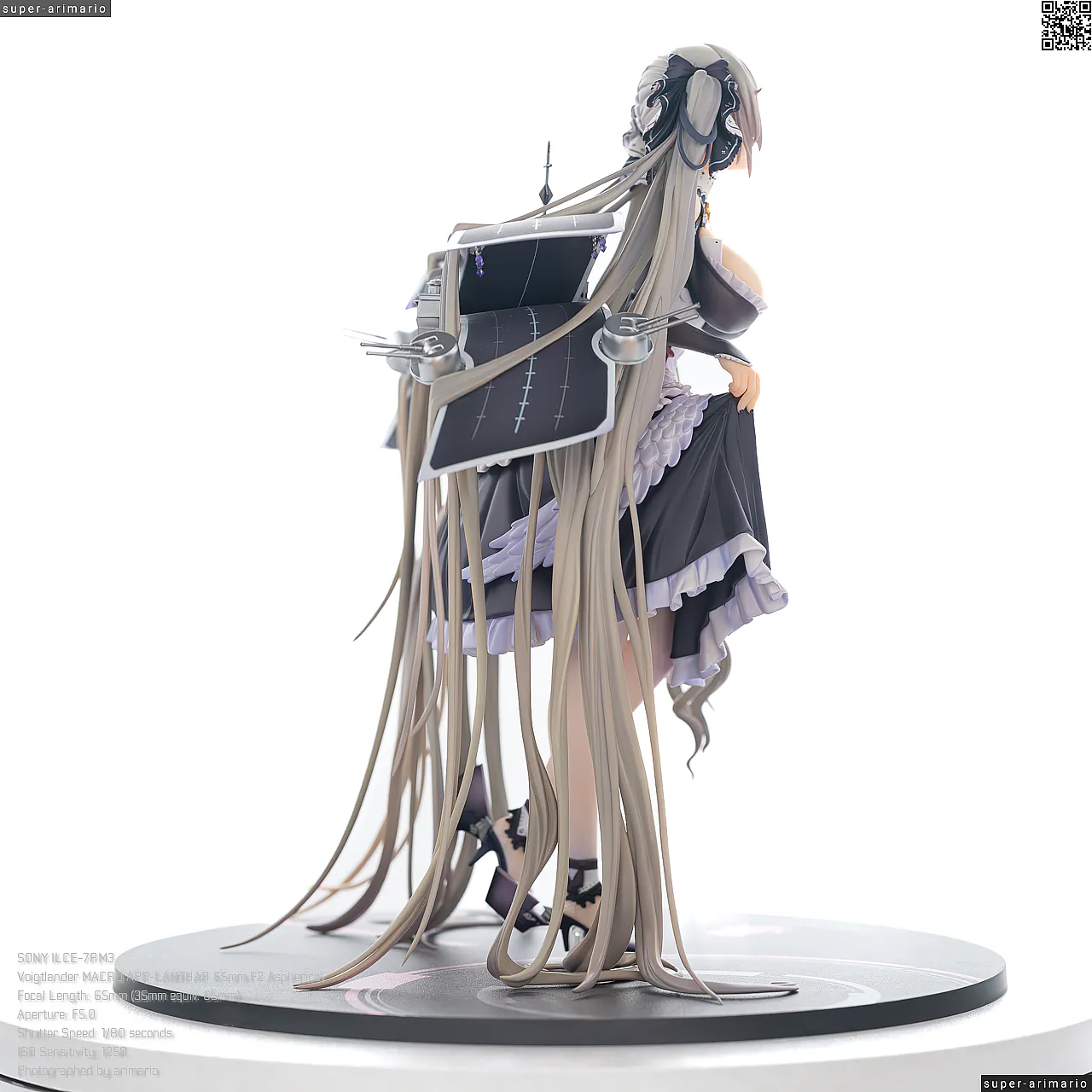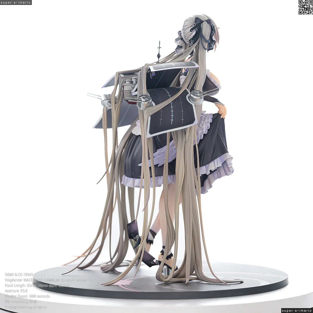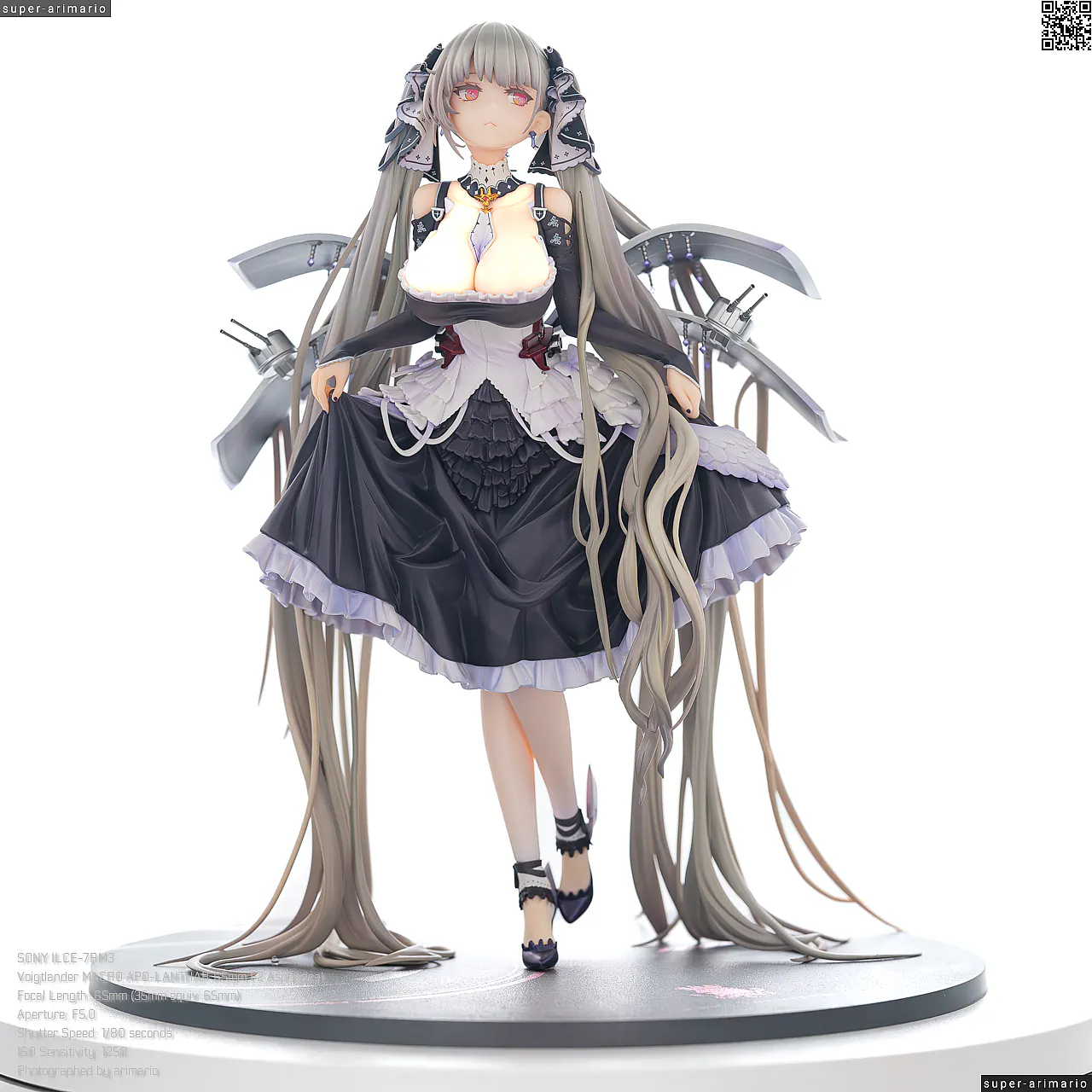 すました様子で、挨拶をするような仕草で立体化。ゴシック調のドレスは、フリルや羽をあしらった装飾がボリューミーに作り込まれており、密度感のある出来栄えです。特徴的なロングヘアーは、スカートや艤装にかかって流れるラインが美しく、グラデーションによる繊細な色の変化が色彩に深みを出しています。