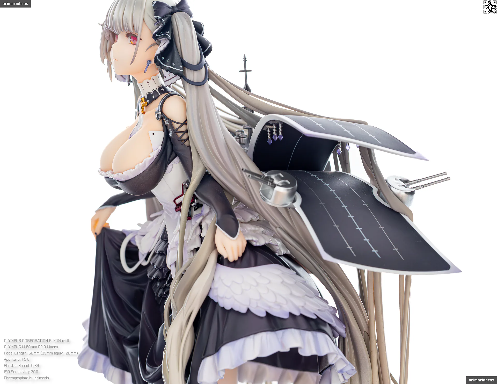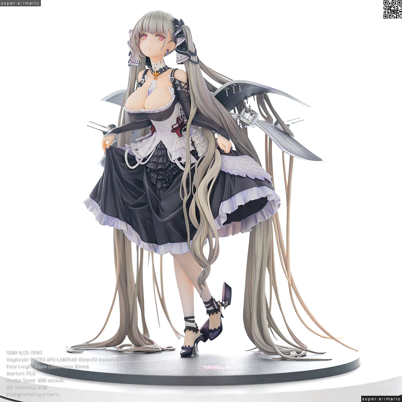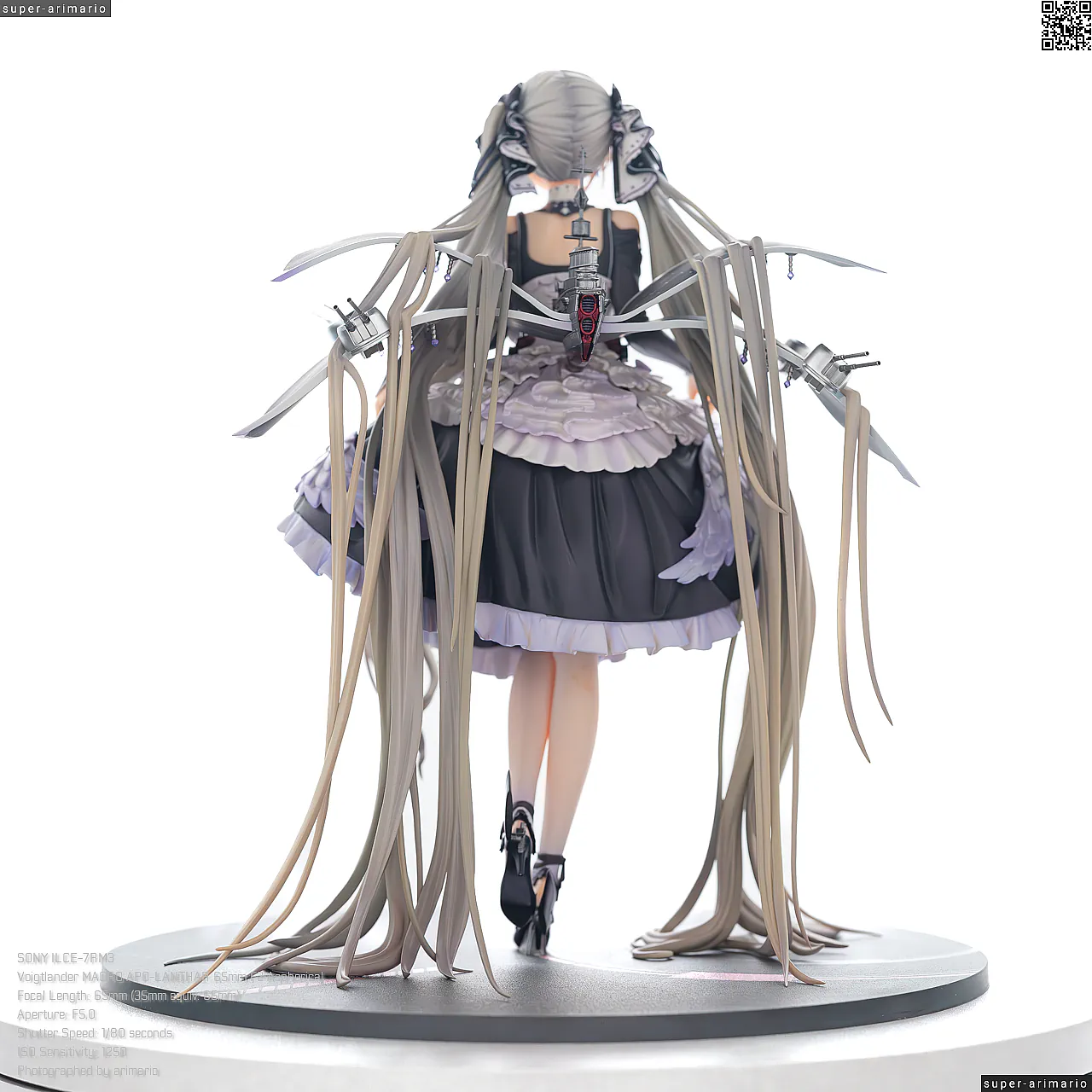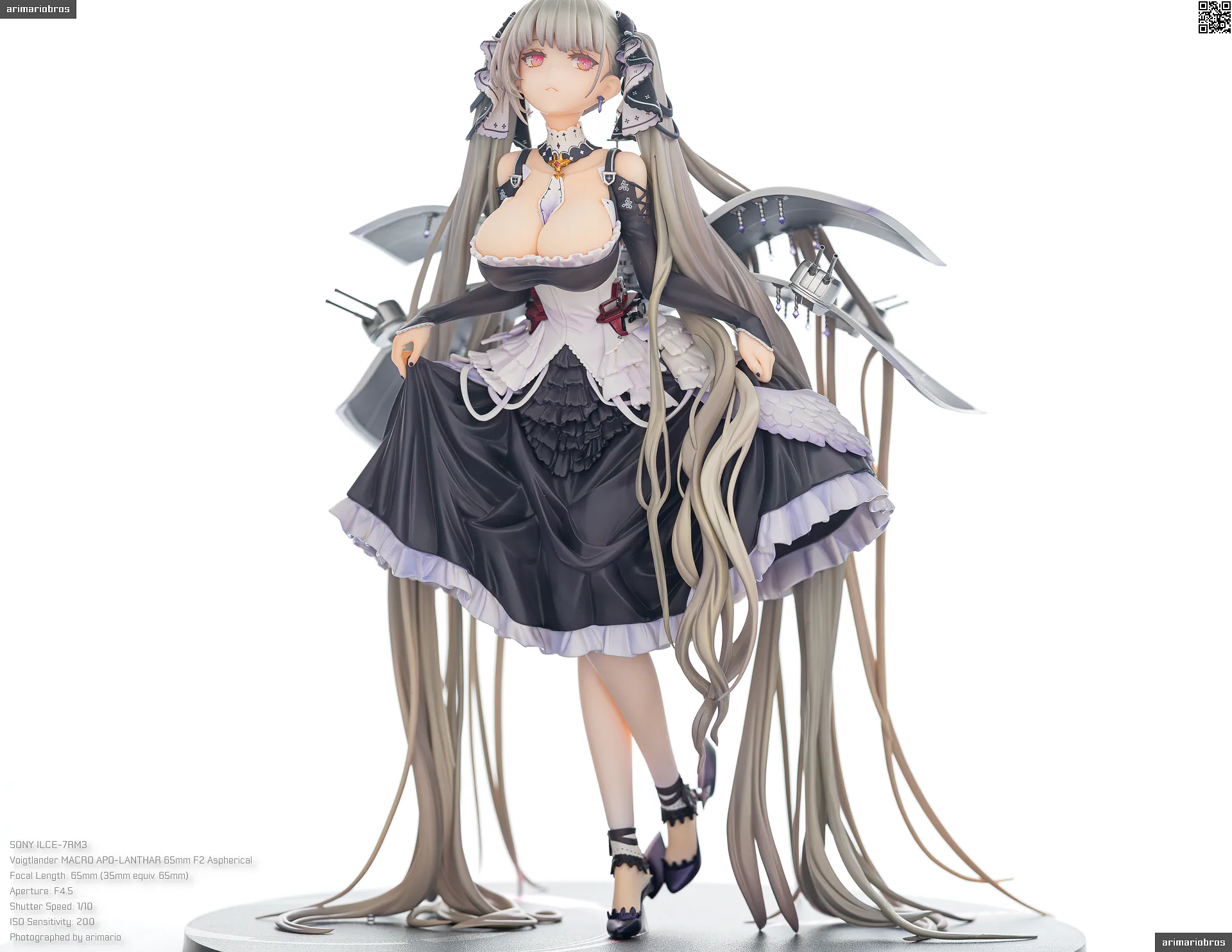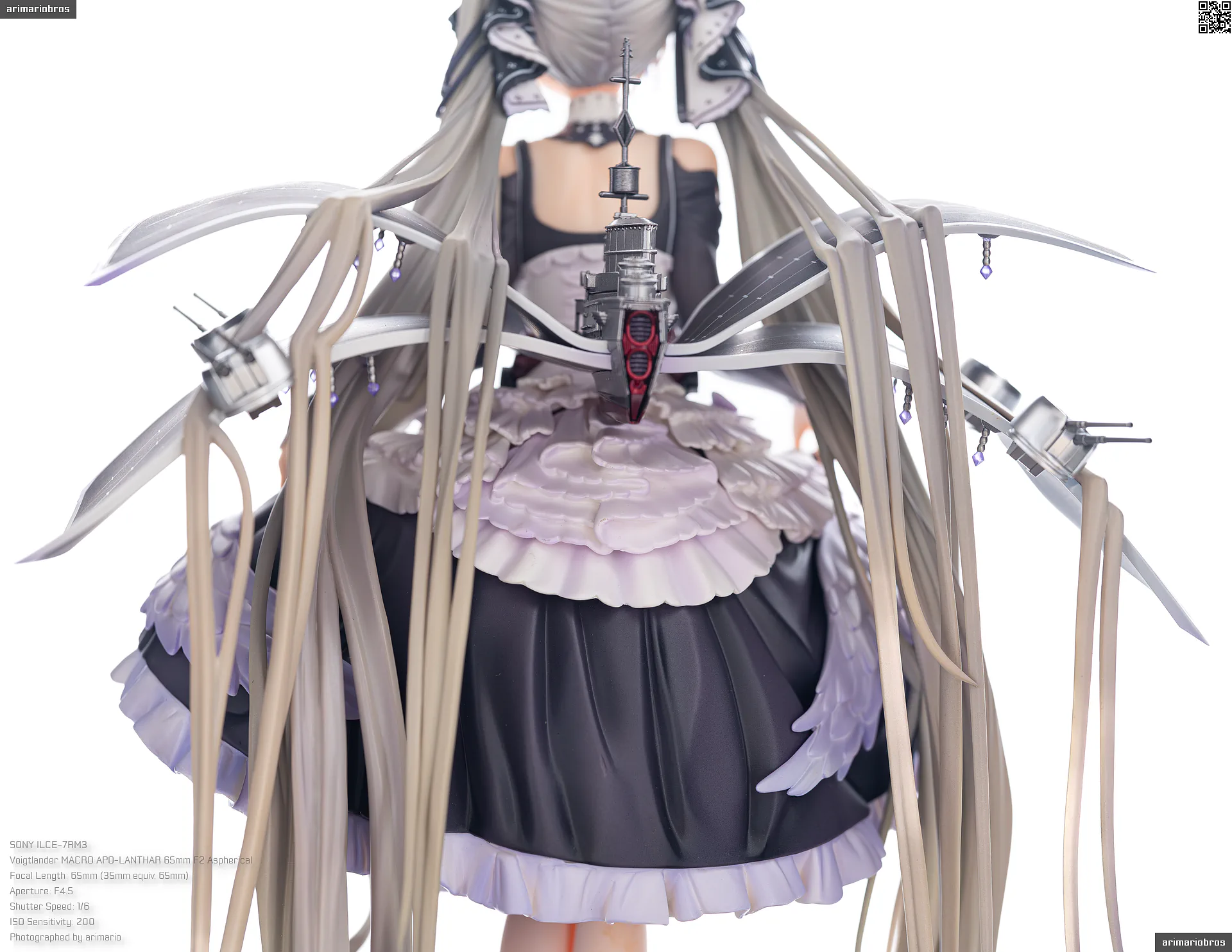 すました様子で、挨拶をするような仕草で立体化。ゴシック調のドレスは、フリルや羽をあしらった装飾がボリューミーに作り込まれており、密度感のある出来栄えです。特徴的なロングヘアーは、スカートや艤装にかかって流れるラインが美しく、グラデーションによる繊細な色の変化が色彩に深みを出しています。