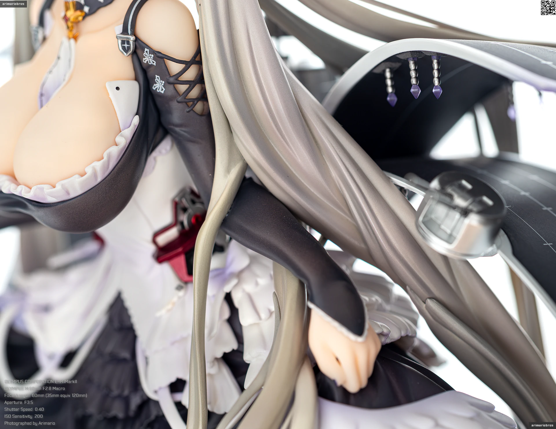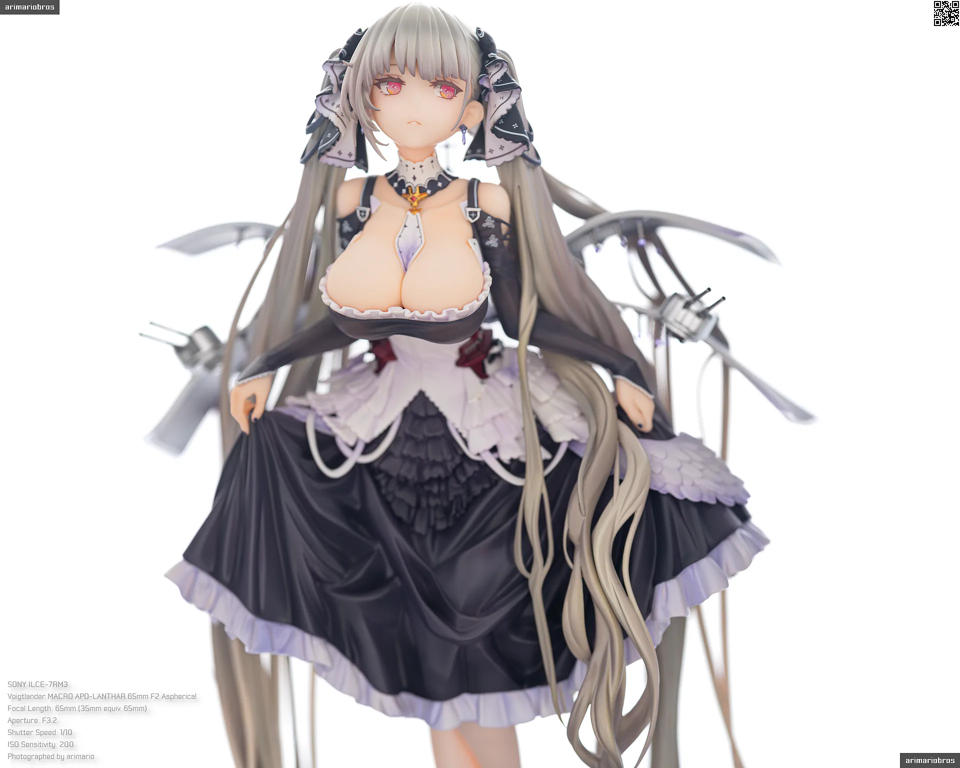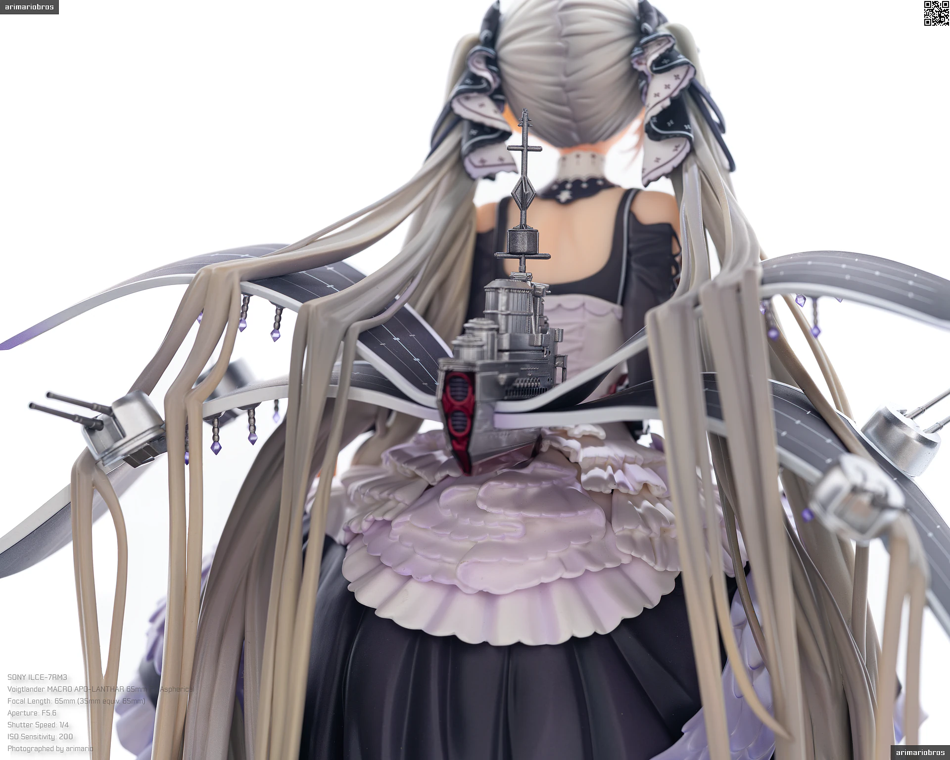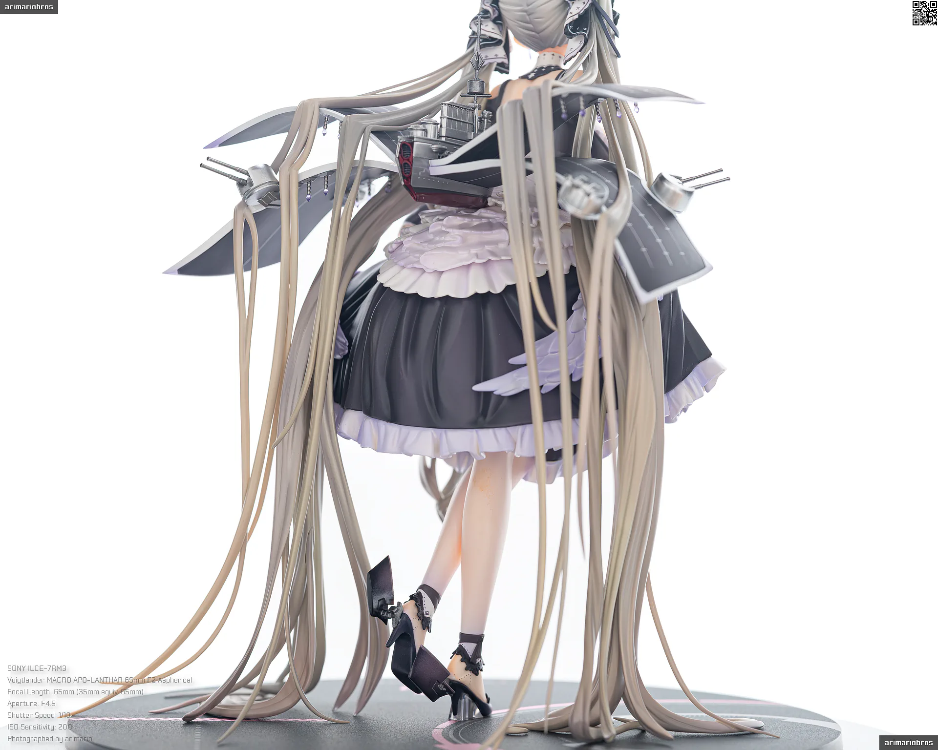 すました様子で、挨拶をするような仕草で立体化。ゴシック調のドレスは、フリルや羽をあしらった装飾がボリューミーに作り込まれており、密度感のある出来栄えです。特徴的なロングヘアーは、スカートや艤装にかかって流れるラインが美しく、グラデーションによる繊細な色の変化が色彩に深みを出しています。