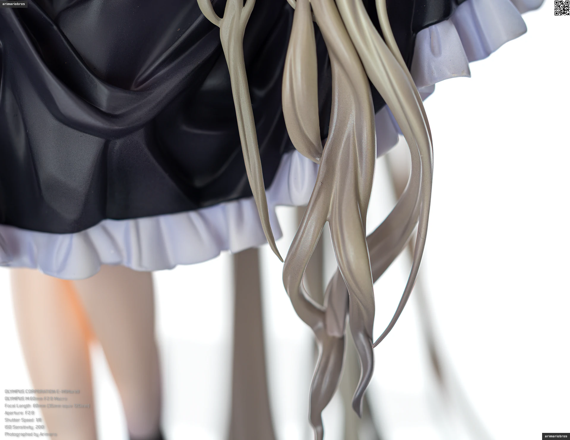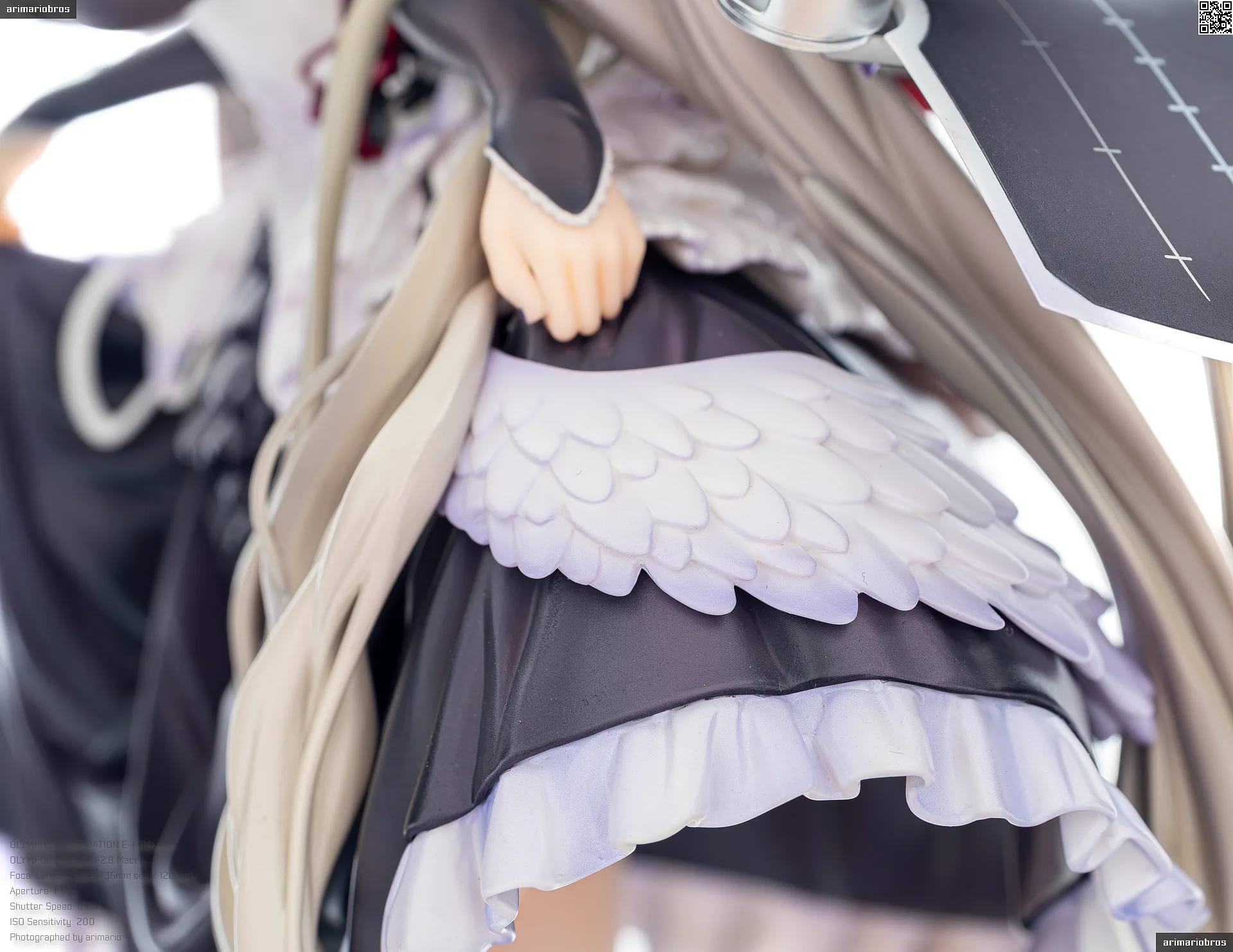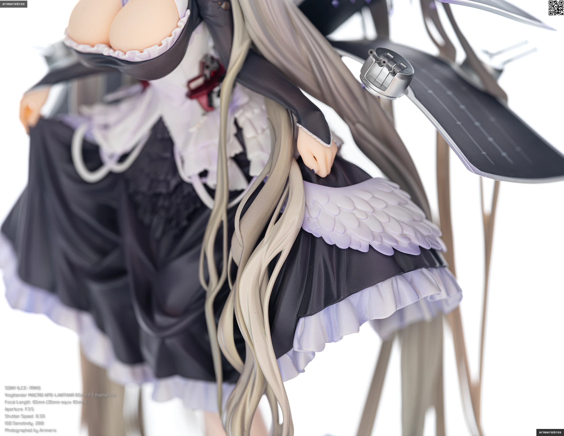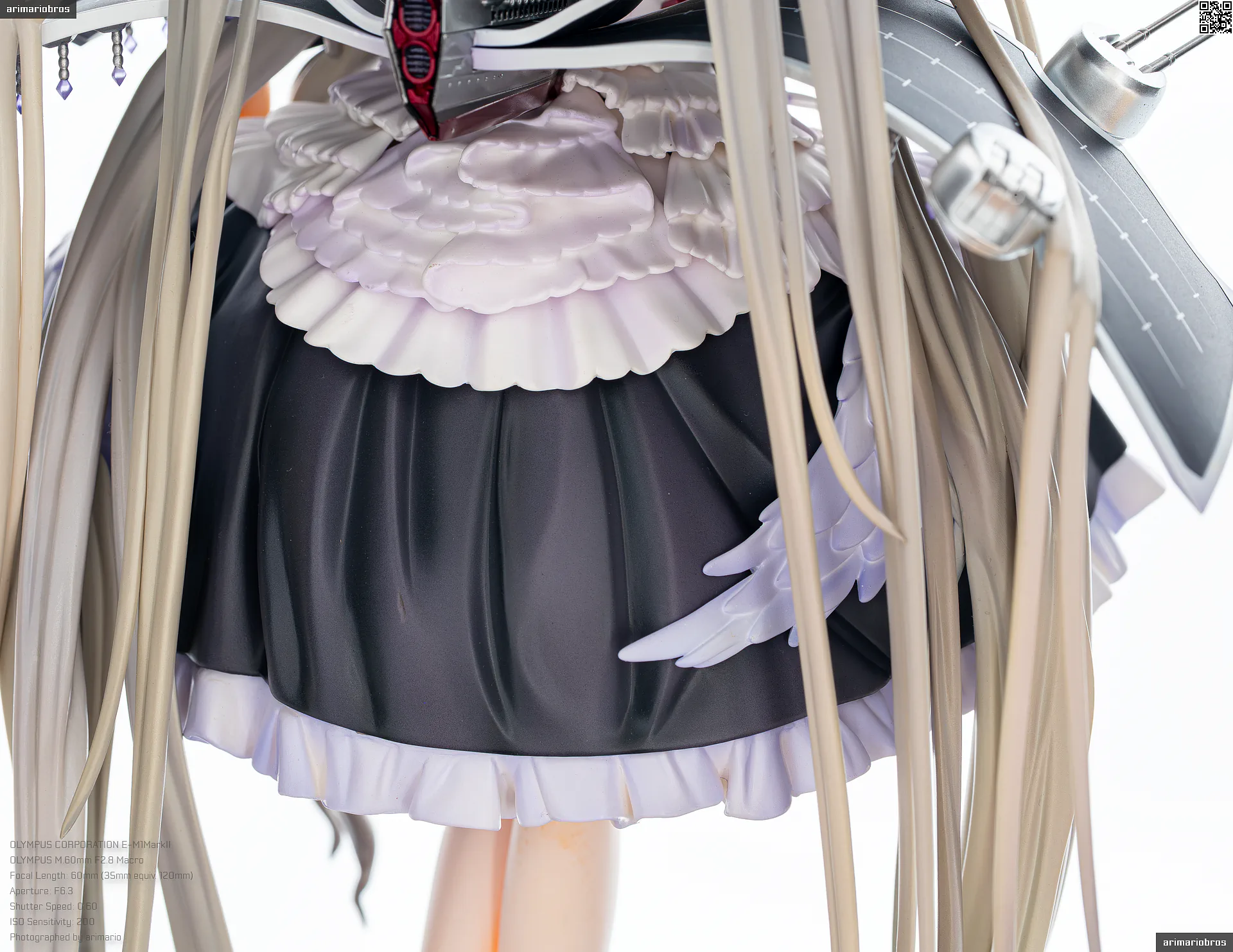 腰回りにフリルのような装飾、さらに裾部分には羽毛のような飾りもついており、非常に情報量の多いデザイン。細かいことをいうならば黒いフリル部分の塗装がちょっと単調かなという気もします (ここは薄布という設定だと思うので、透け感のあるグラデーション塗装で仕上げて欲しい) が、元絵の再現度は非常に高いです。