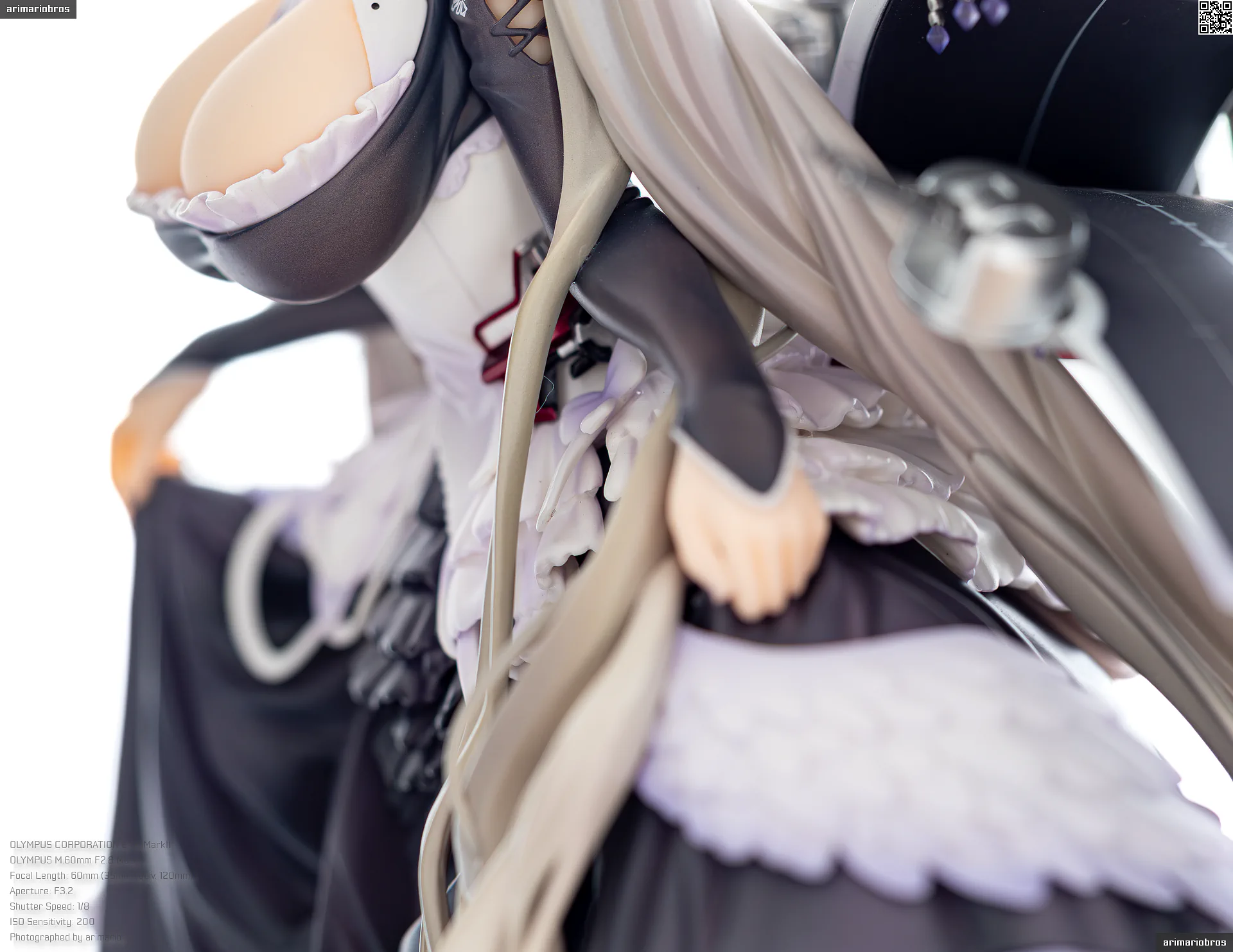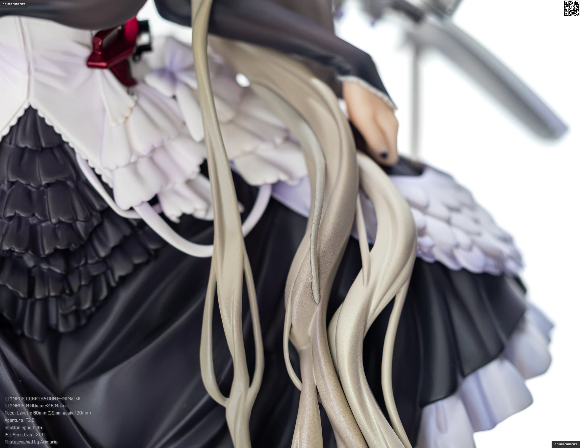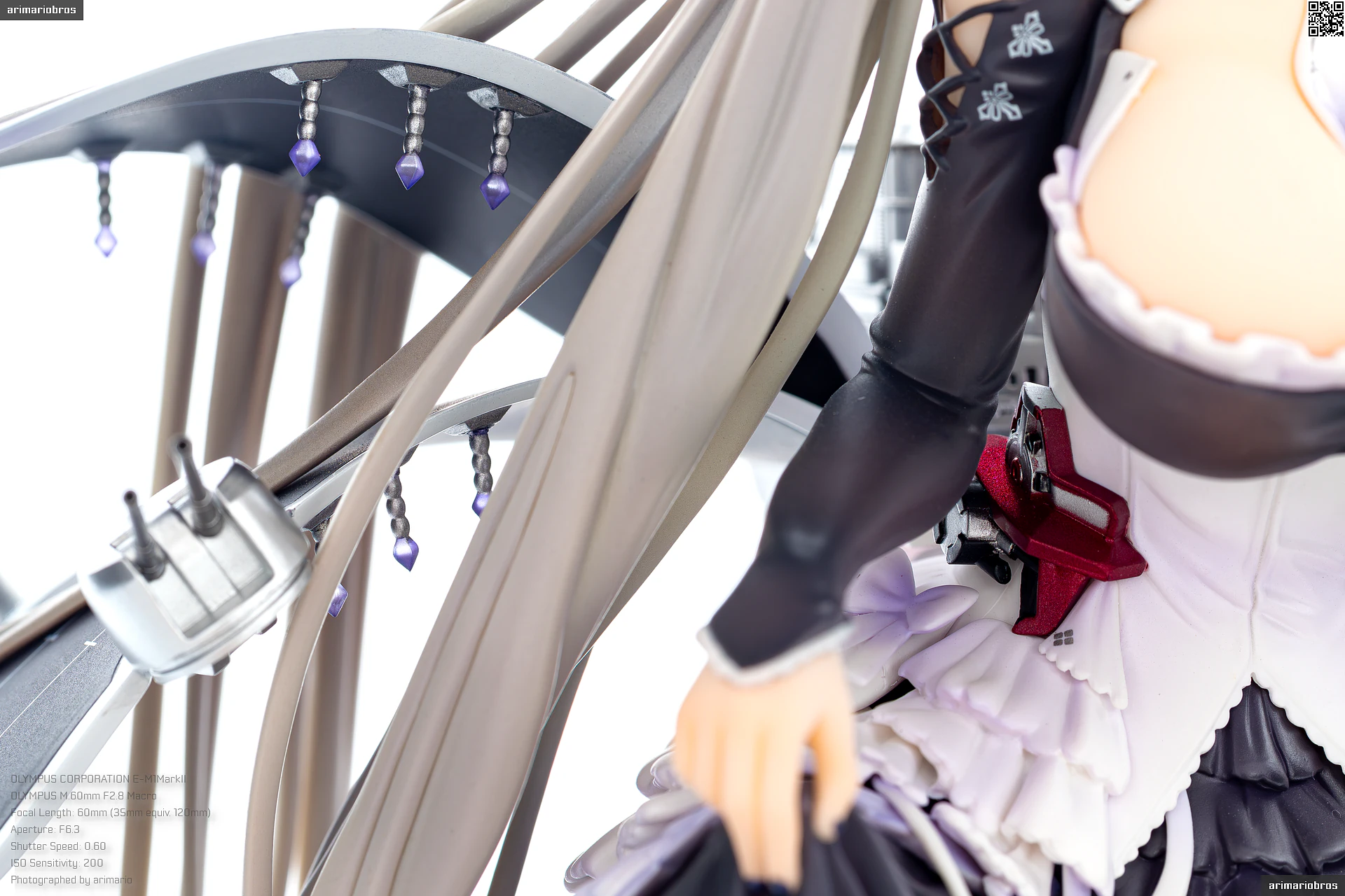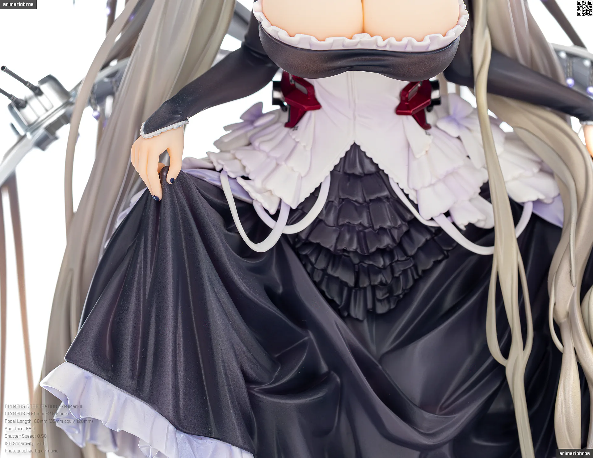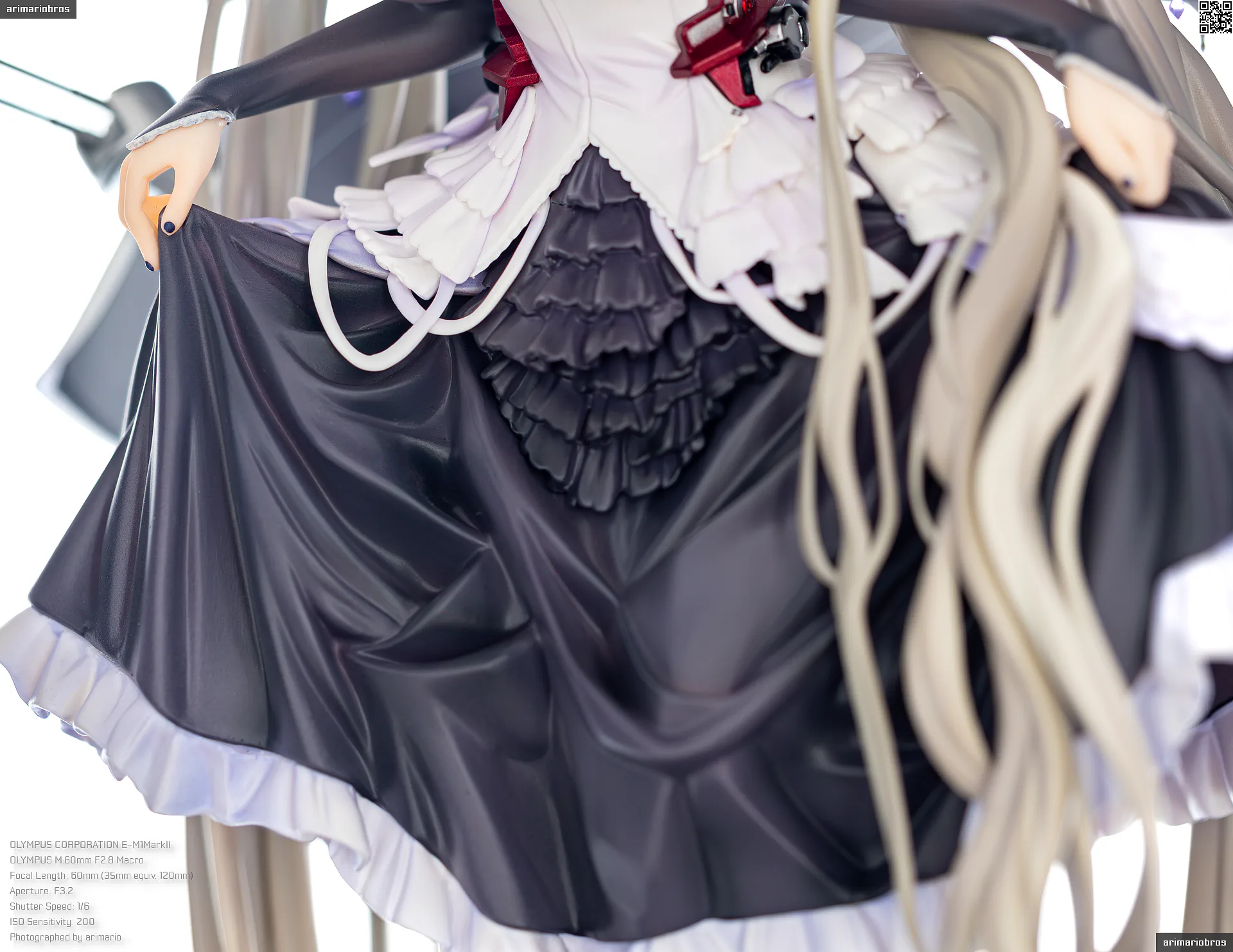 腰回りにフリルのような装飾、さらに裾部分には羽毛のような飾りもついており、非常に情報量の多いデザイン。細かいことをいうならば黒いフリル部分の塗装がちょっと単調かなという気もします (ここは薄布という設定だと思うので、透け感のあるグラデーション塗装で仕上げて欲しい) が、元絵の再現度は非常に高いです。