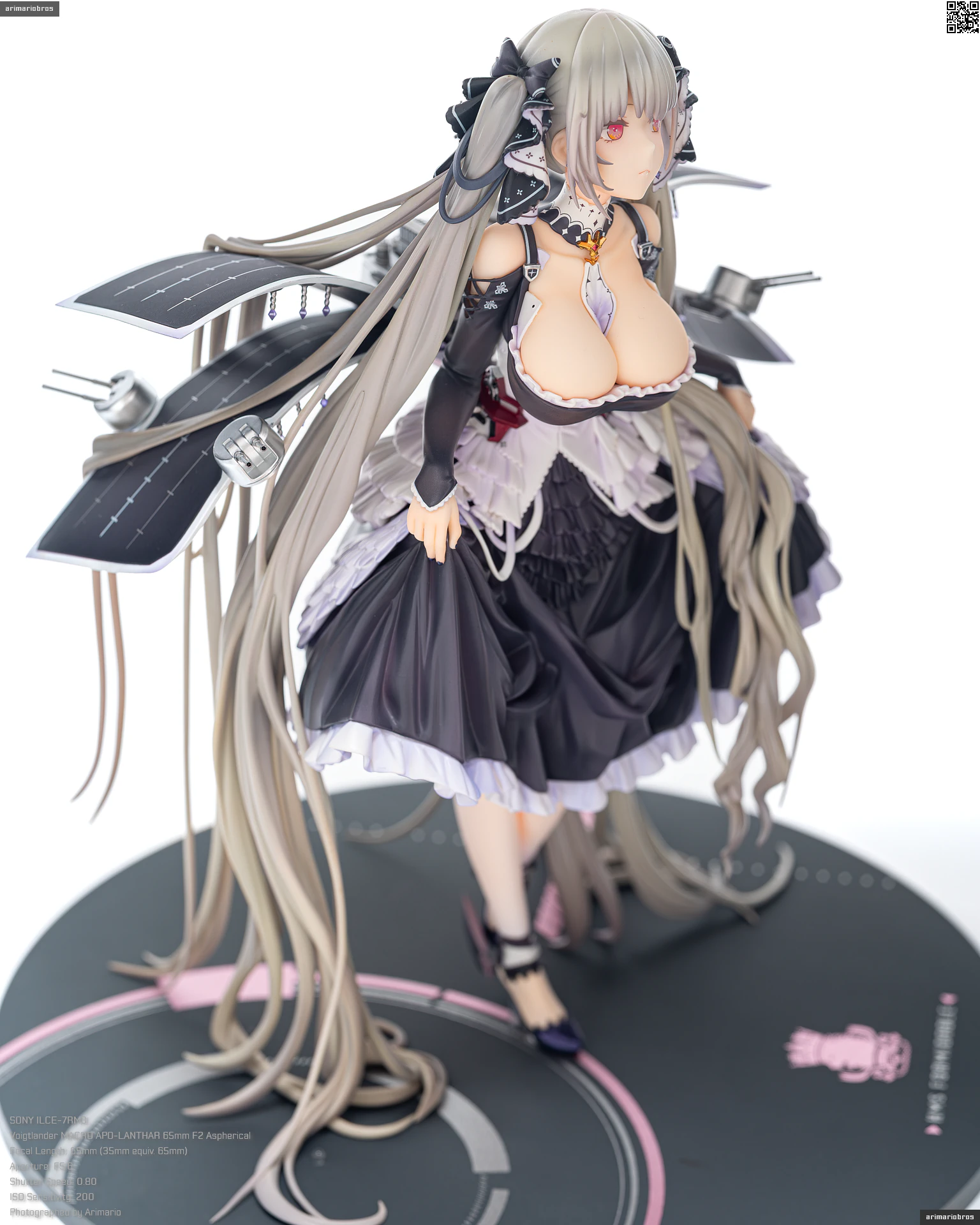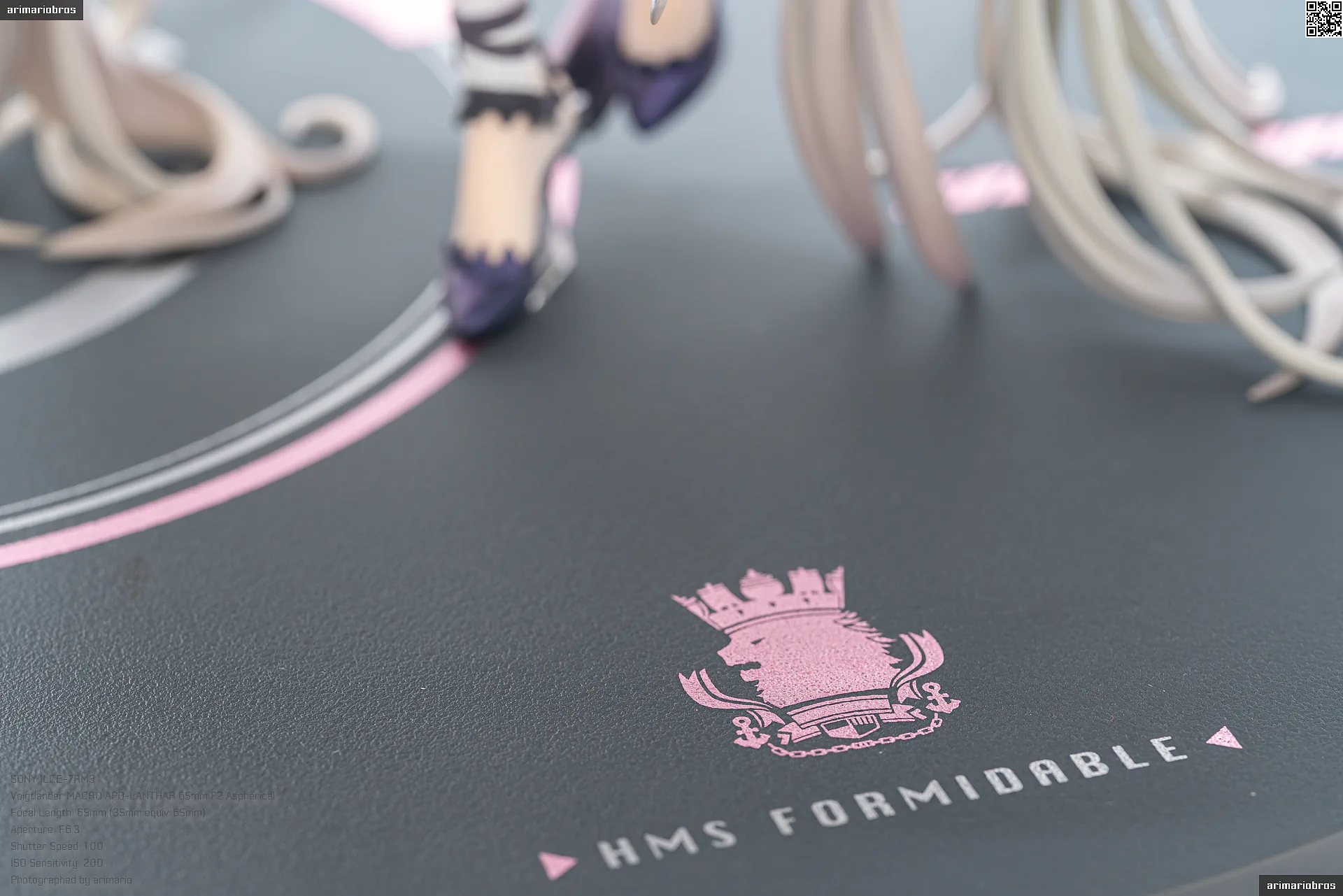 彩色見本では透明な円形台座でしたが、商品版ではグレーの台座が付属。シボ加工された台座に「HMS FORMIDABLE」の文字と、フォーミダブルが所属するロイヤル陣営の獅子紋章が描かれているというもの。アルターの他の『アズールレーン』フィギュア商品でも見られるデザインですね。シボ加工とメタリックピンク塗装のおかげで、質感は良好。