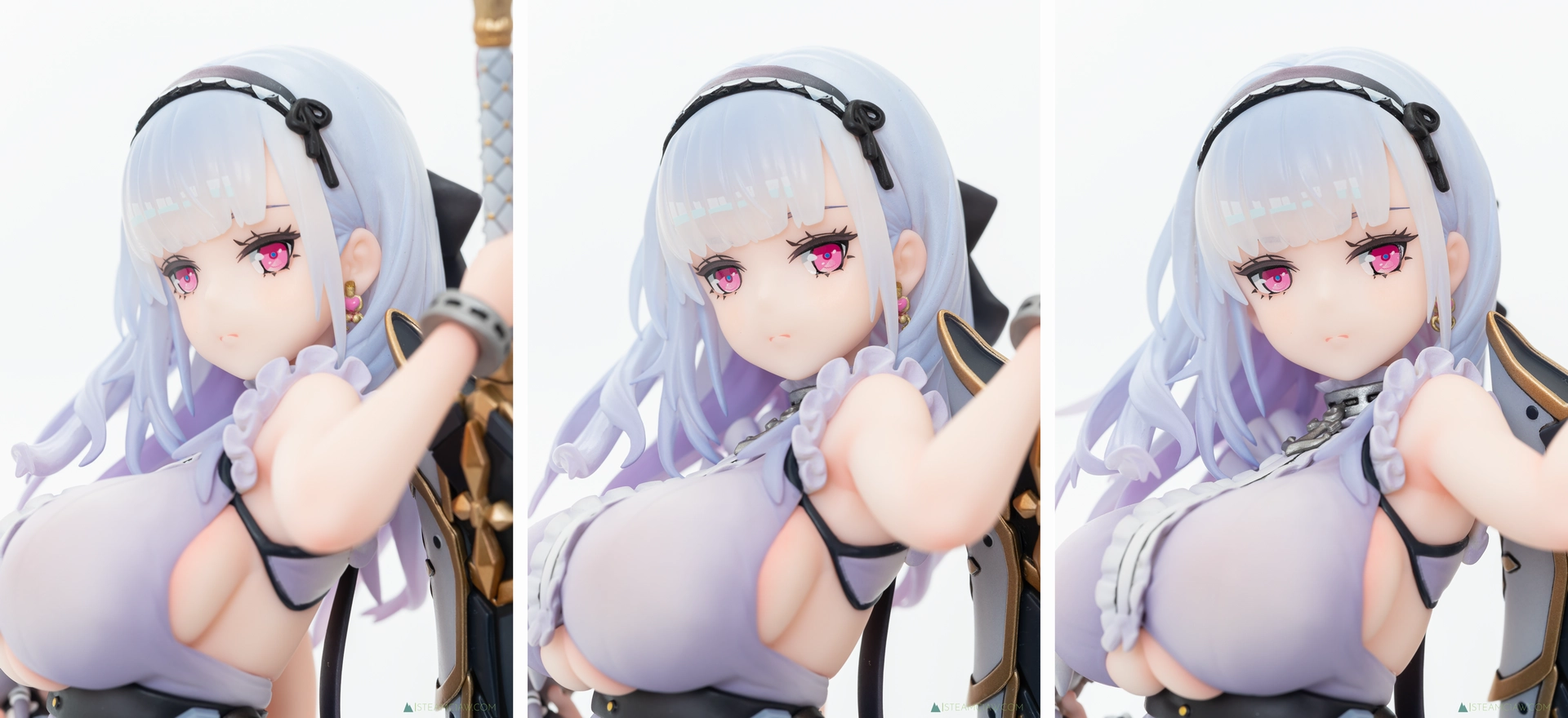 先ほど、バストまわりのむっちり感への拘りの割に、二の腕などはすっきりしていると書きましたが、脚も同様に比較的スレンダーな造り。ただ、絶対領域エリア、ニーハイソックスのキワはやはりはち切れそうな肉感を強調しています。ふっくらした太ももの曲線美など、やはりここは並々ならぬこだわりが感じられますね😅