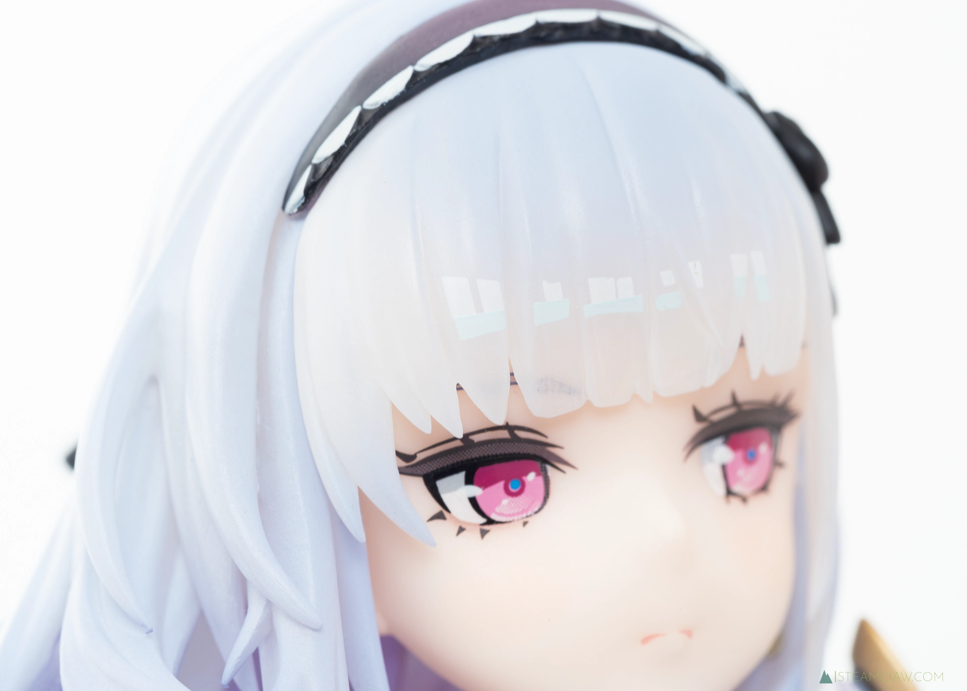 どの角度からみても違和感のない立体化。髪の毛は本人右側に流しています。無造作な流れがうまく表現できているのではないでしょうか。前髪の毛先はクリアパーツ仕上げ。元画像にはない風変わりな形のハイライトが追加されていますね。その他はマット塗装。毛先部分にパープルのグラデーションが入っていますが、きれいな塗装です。