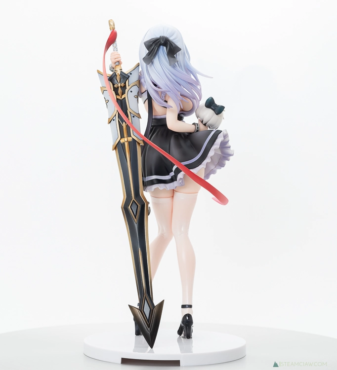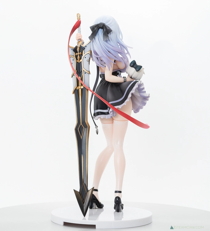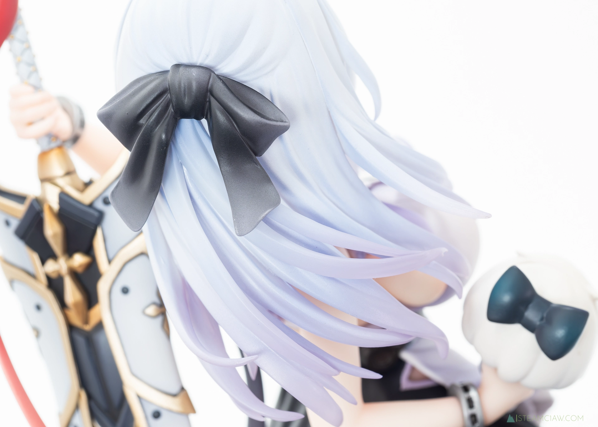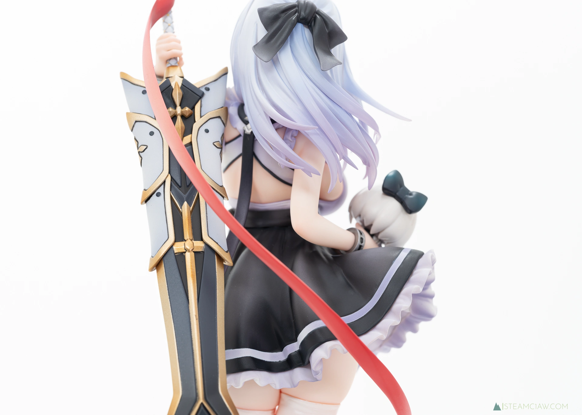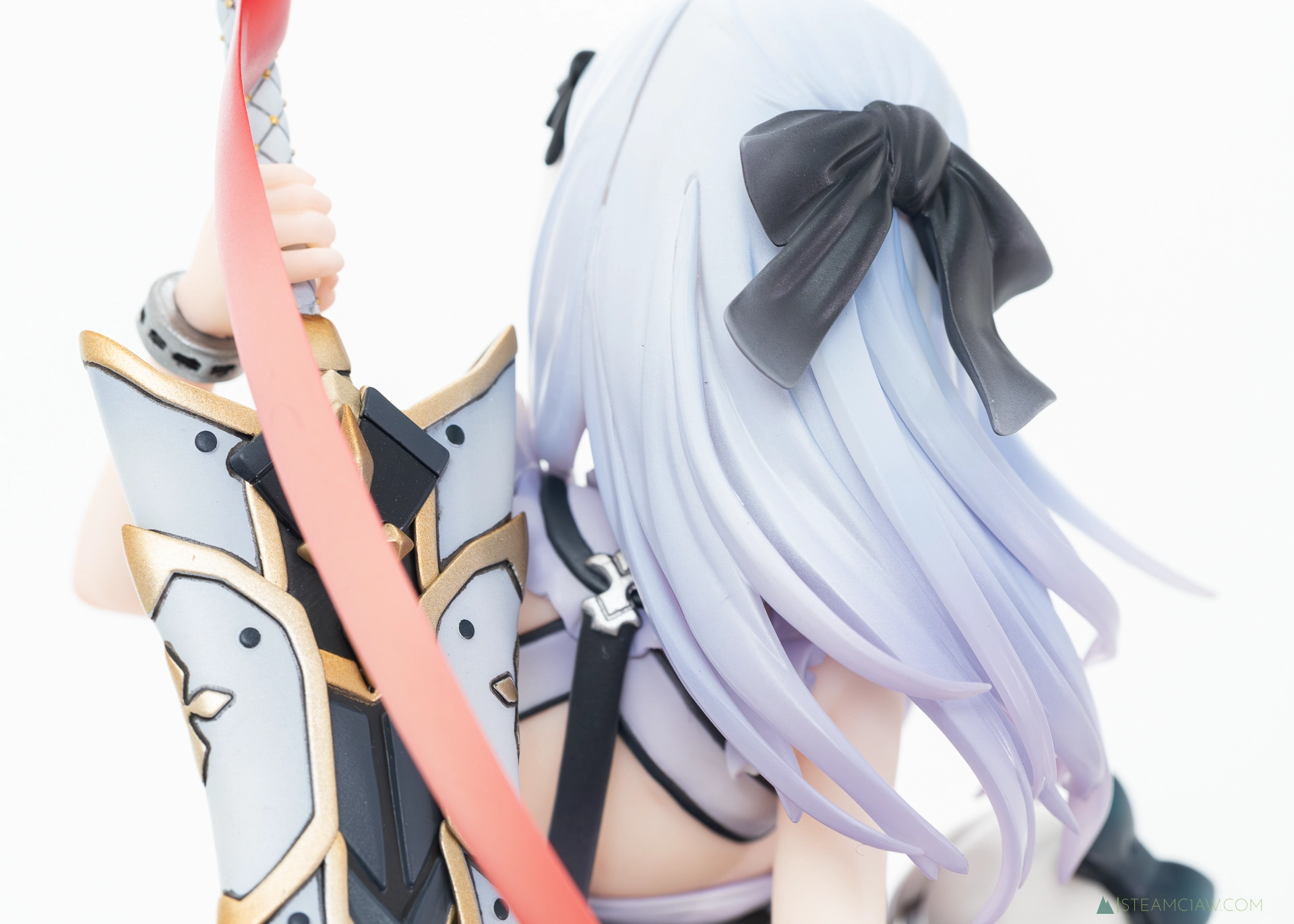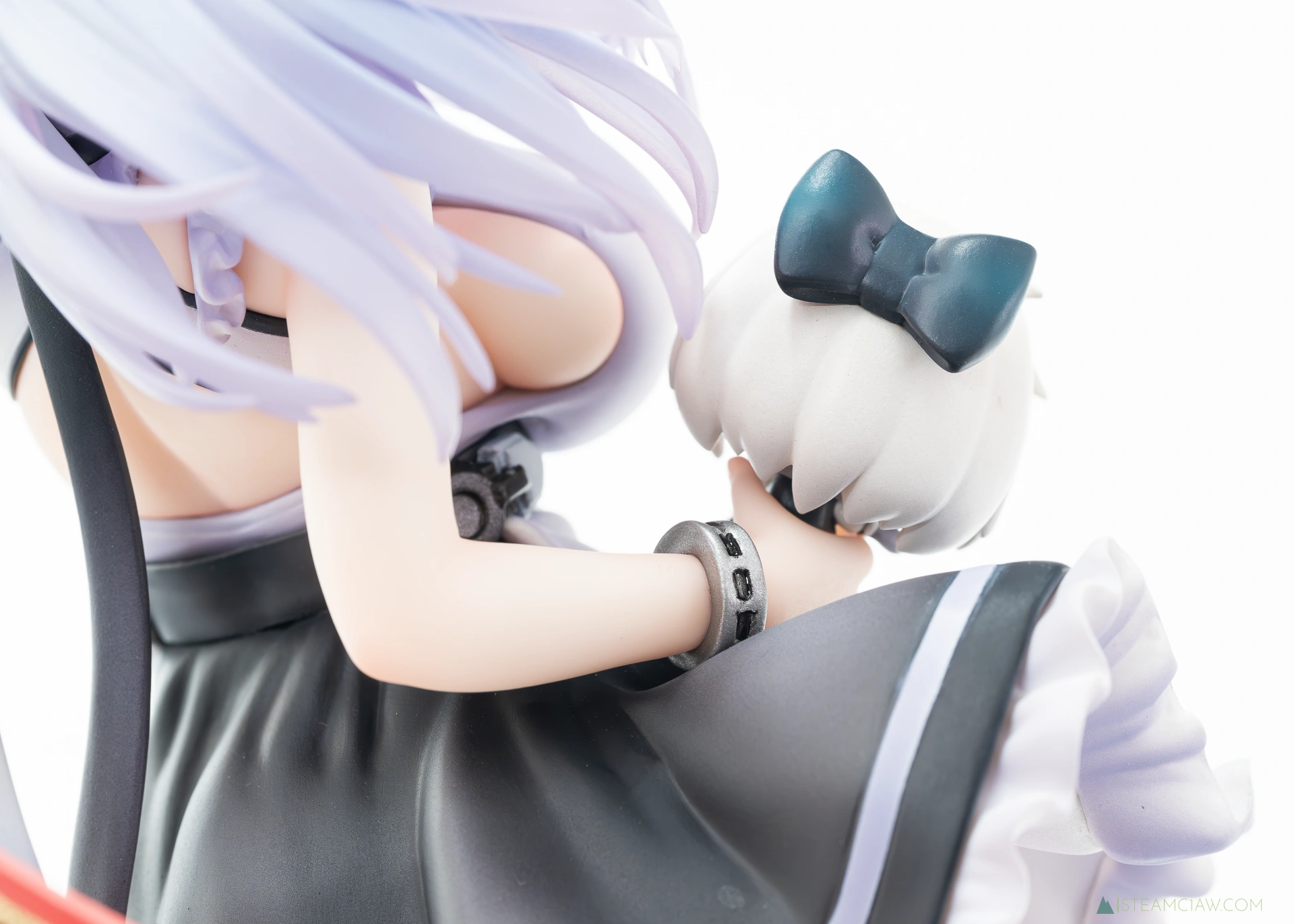 頭部にはメイド風の白黒カチューシャを着用のほか、後頭部に黒いリボン。よく見ると塗装時のホコリの巻き込みがあったりしますが、目立つほどではないかな。写真だと分りづらいですがリボンは端の部分がクリアパーツになっています。