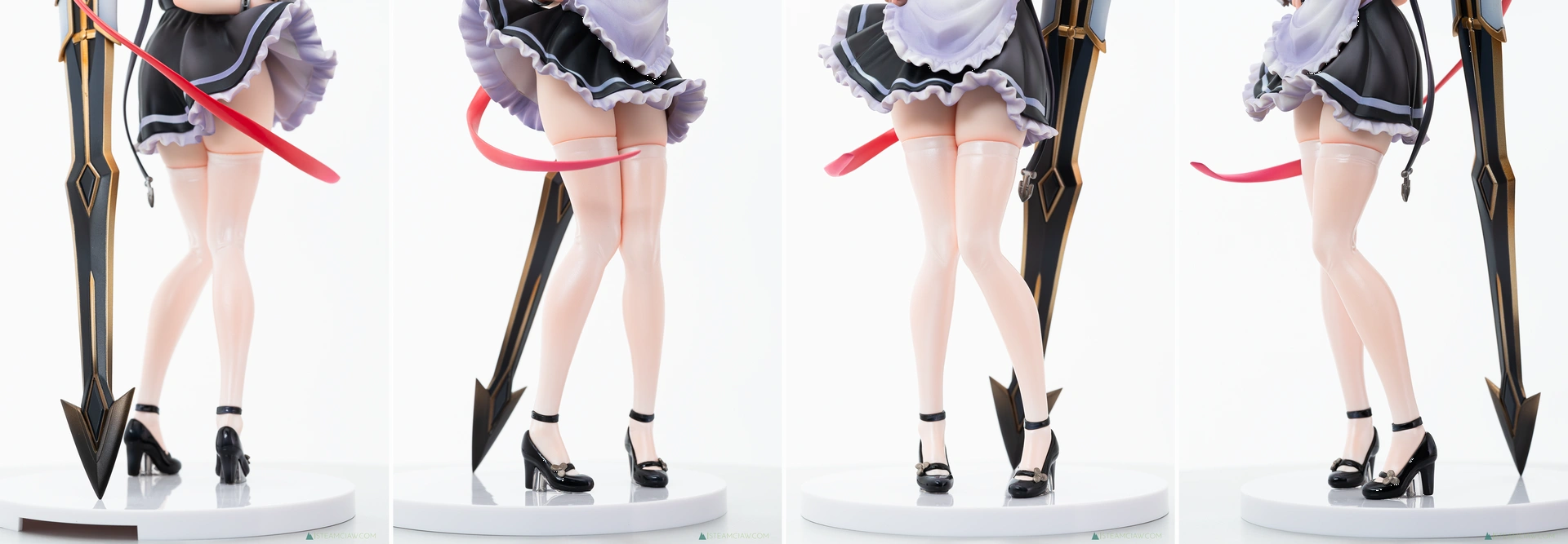 白いニーハイソックスは肌色のハイライトが吹かれており透け感のある塗装。なおかつパール塗装でツヤツヤした光沢があります。サテン生地のイメージなのかな? メイド服というよりランジェリーとかブライダルという感じが強く出ており、少々やり過ぎじゃないかという気がしますが。