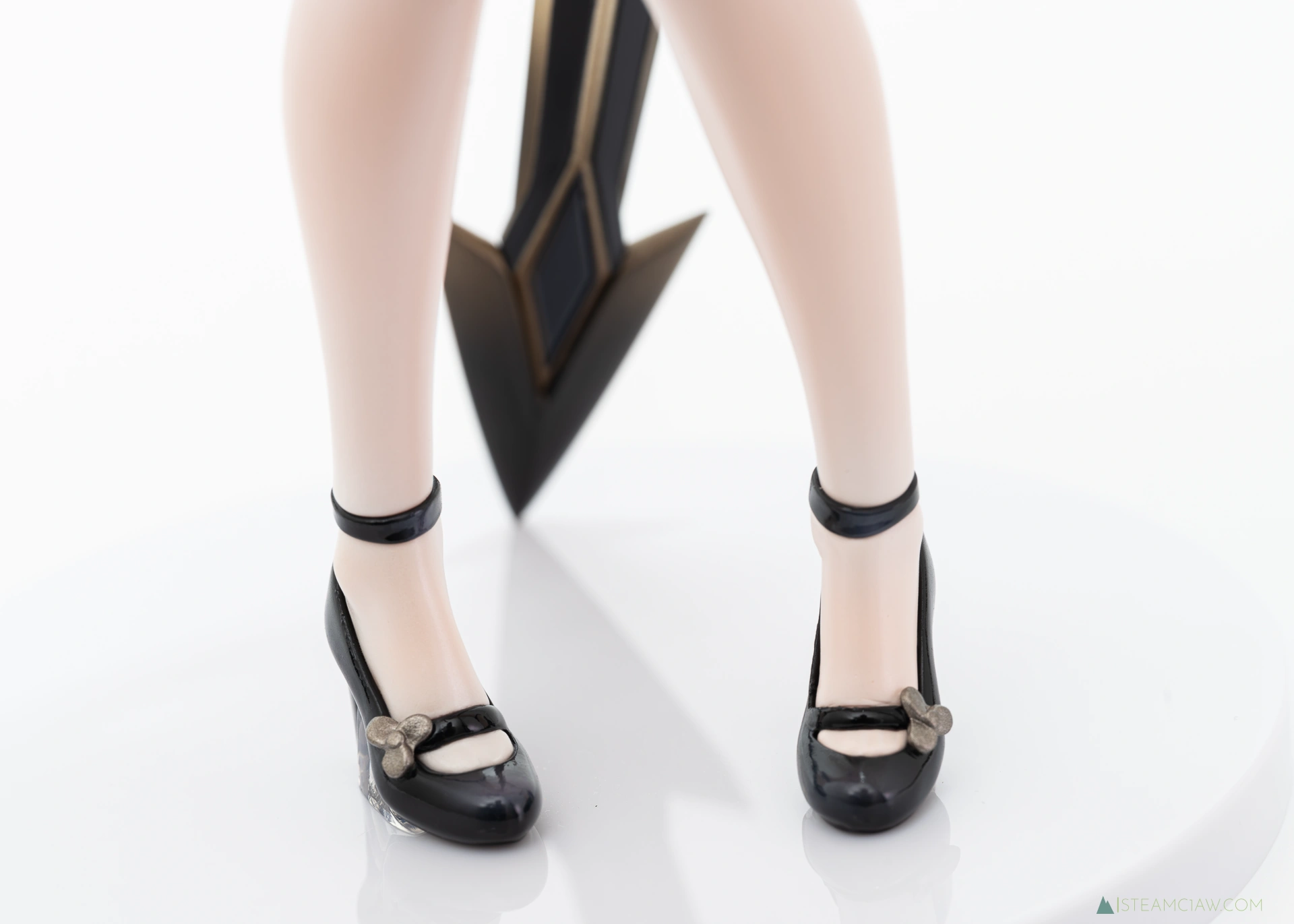 足元は黒のパンプス。ラウンドトゥでストラップ付きというオーソドックスな形状。つま先には花をモチーフにしたと思われる飾りがついています。アンクルストラップはパンプスの一部ではなくて、ストラップだけを足首に巻いているという不思議なデザイン🤔