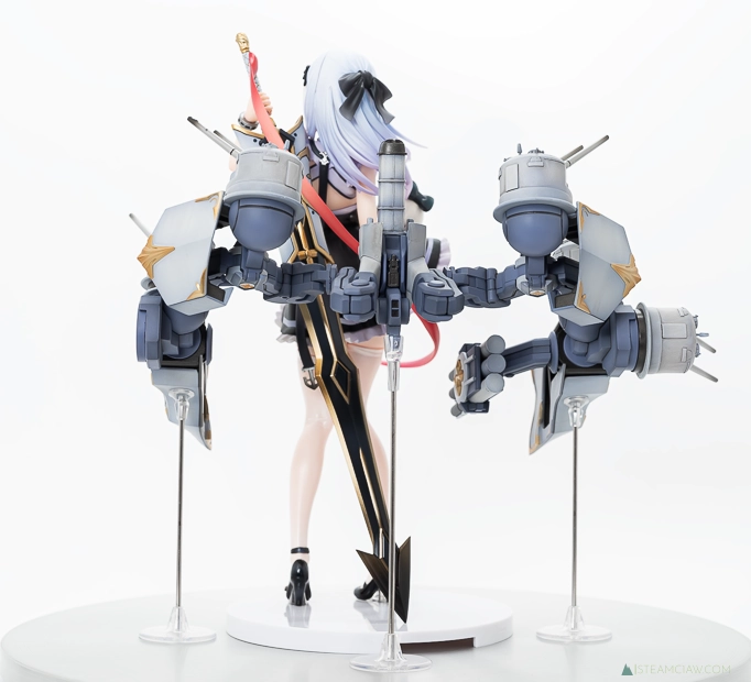 このタイプのフィギュアでは一般的ですが、艤装パーツはフィギュア本体に接続・固定するのではなく、支柱で浮かせて好きな場所に配置できるようになっています。ダイドー本人は1/7スケールフィギュアとして標準的なサイズですが、艤装パーツのおかげでボリューム感は結構あります。