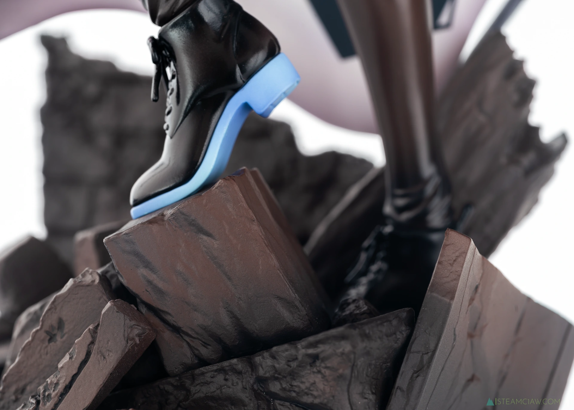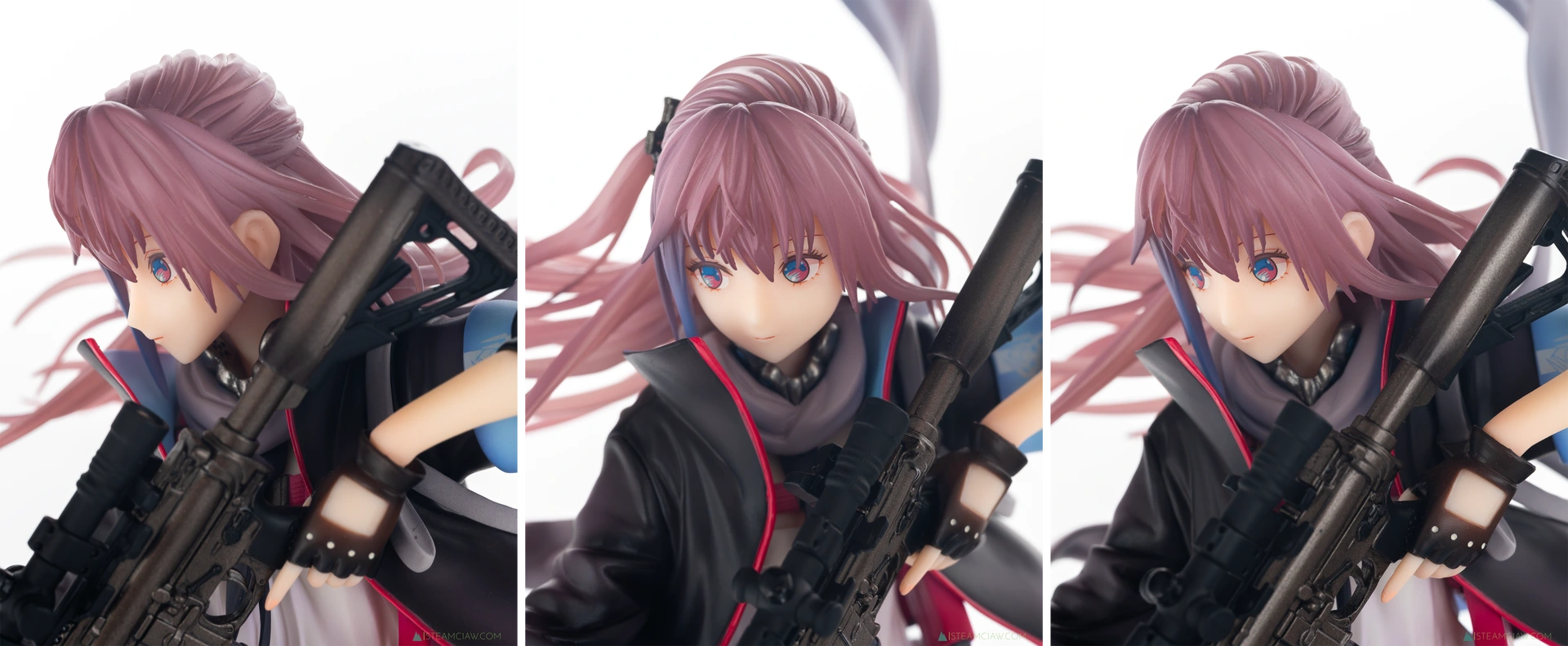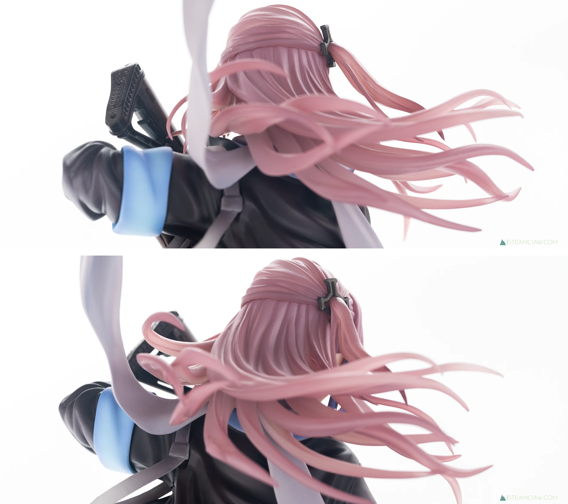 髪の毛は風になびくイメージで立体化。躍動感がありますね。特に前髪は細かいところまで彫りが入れられており、情報量の多さが魅力。前髪にはブルーのハイライトカラーが入っていますが、くすんだスモーキーな色味も良いです。