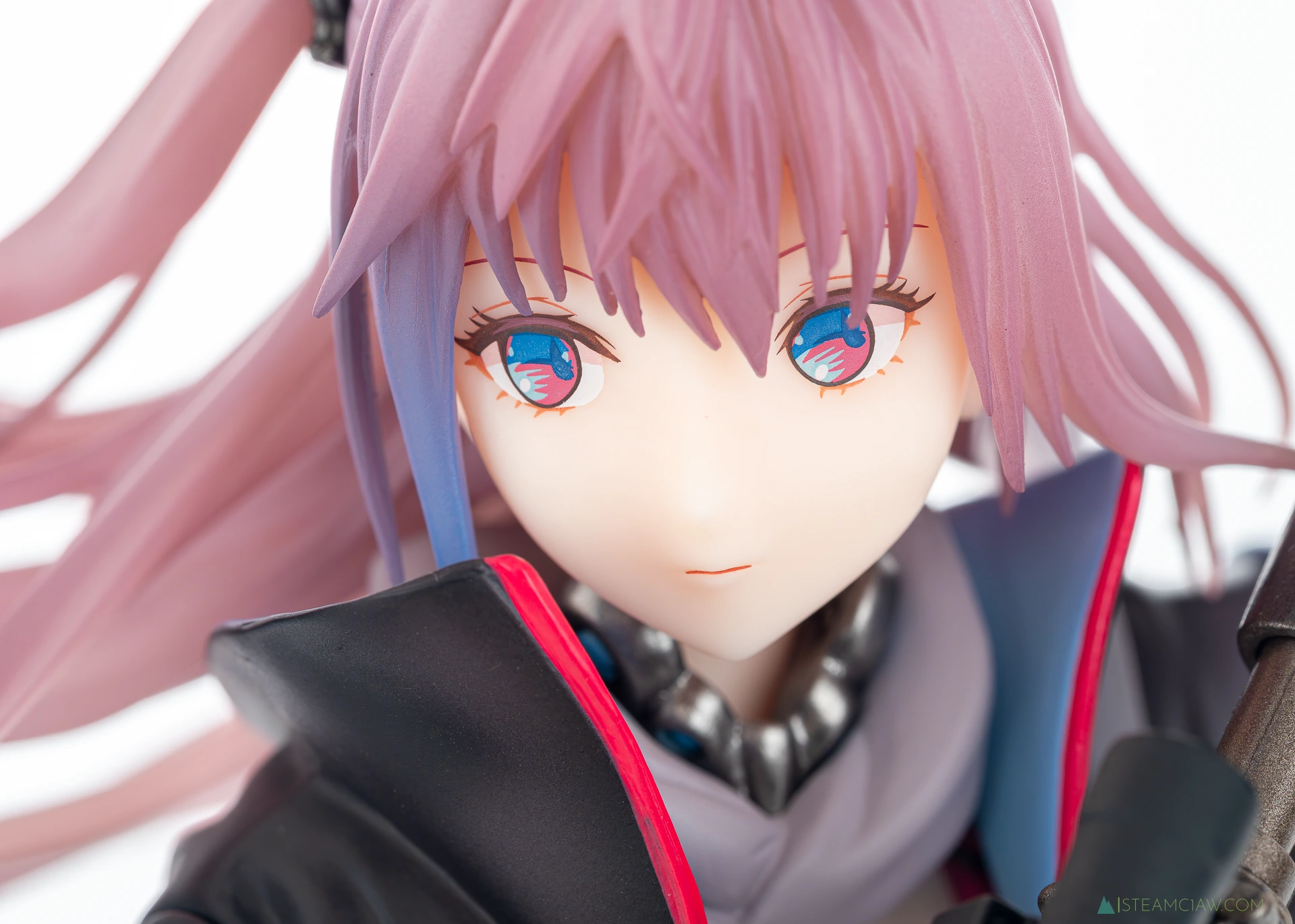 このフィギュアで最も気になるポイントが、この顔まわり。今になって見返してみると、彩色見本の時点でも若干その気配があるのですが、瞳が無機質な描き方になっており、なんというか生気が感じられません。公式サイト掲載の彩色見本と比べると黒目部分、ブルーとレッドの彩度が下がっていることが大きい気がします。