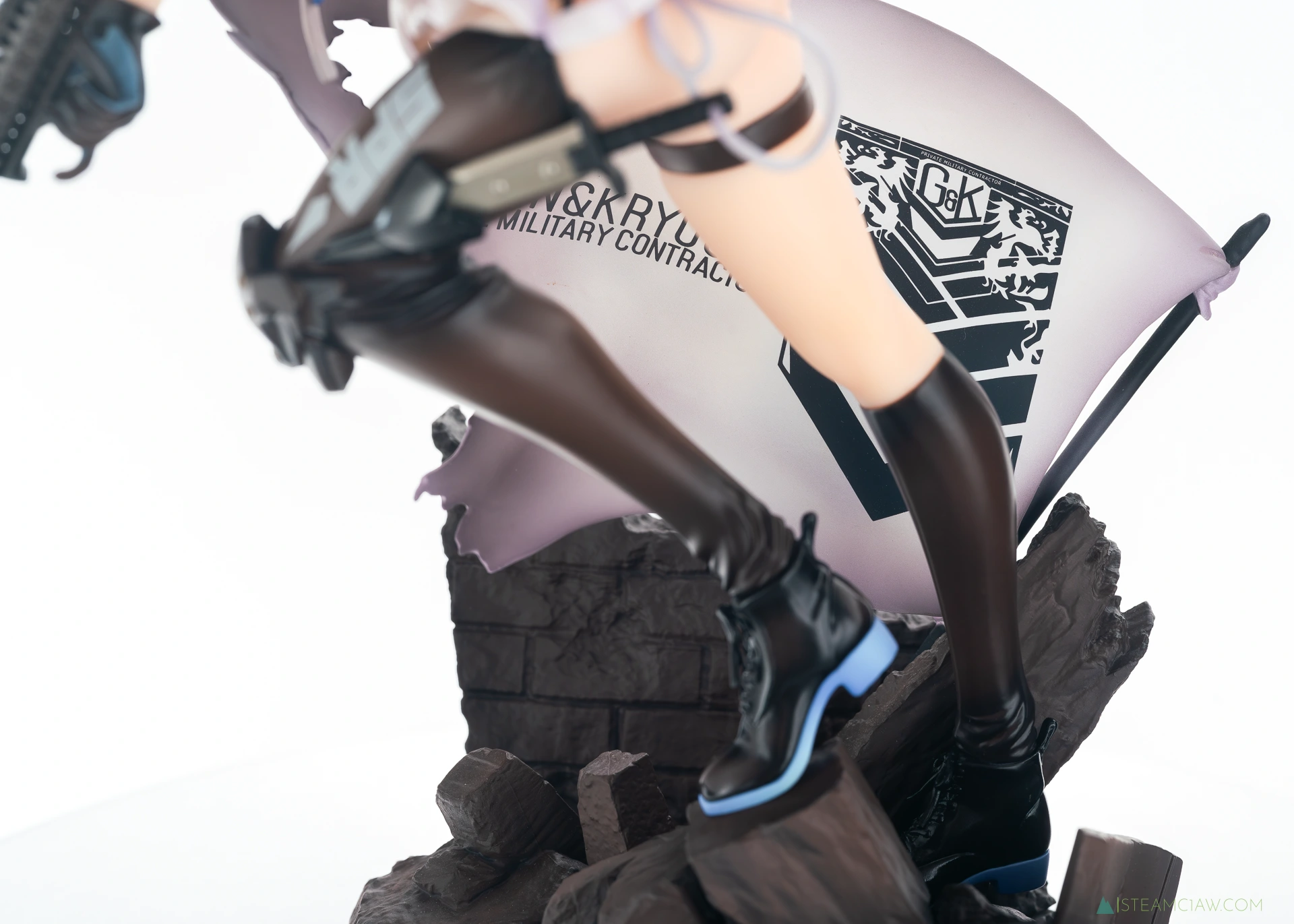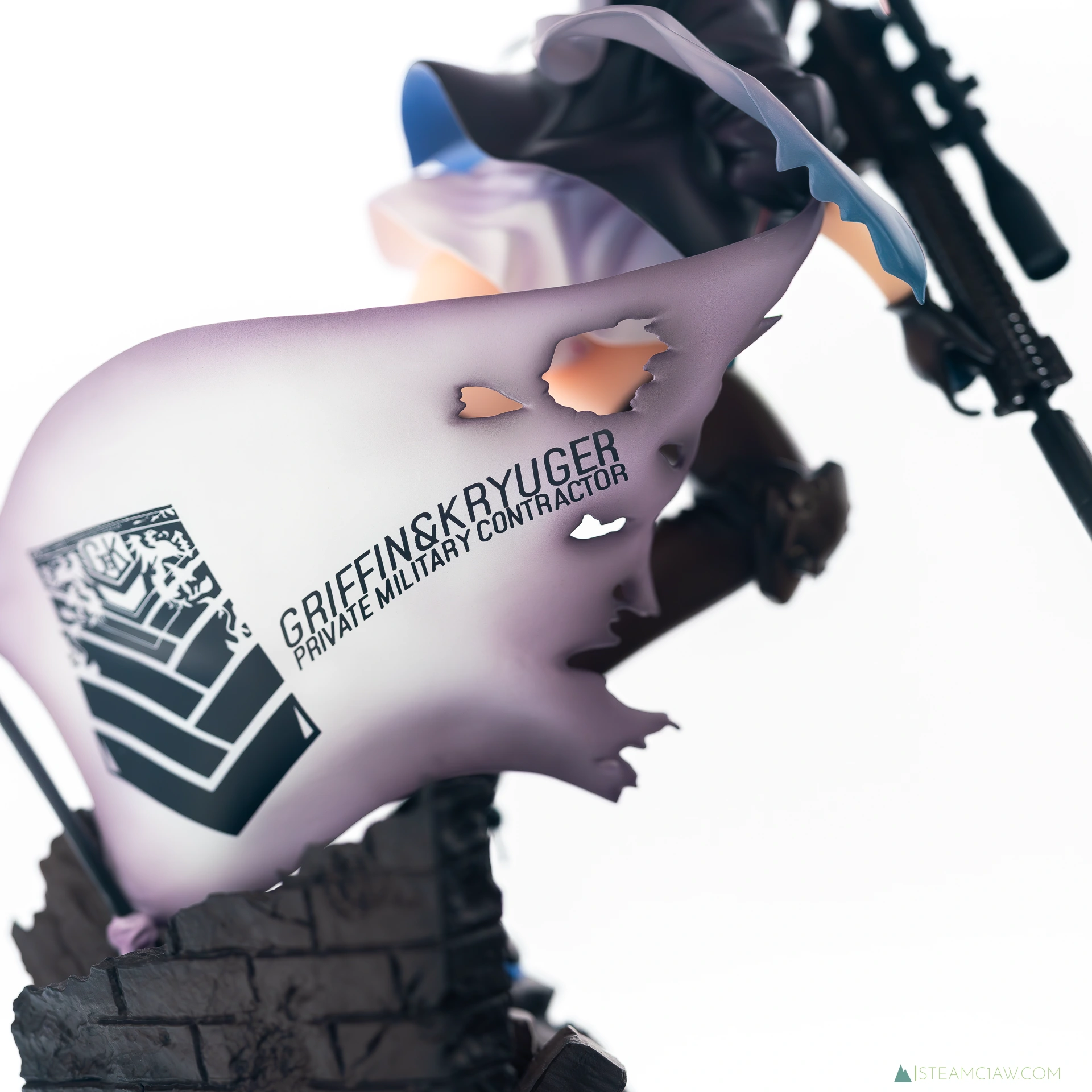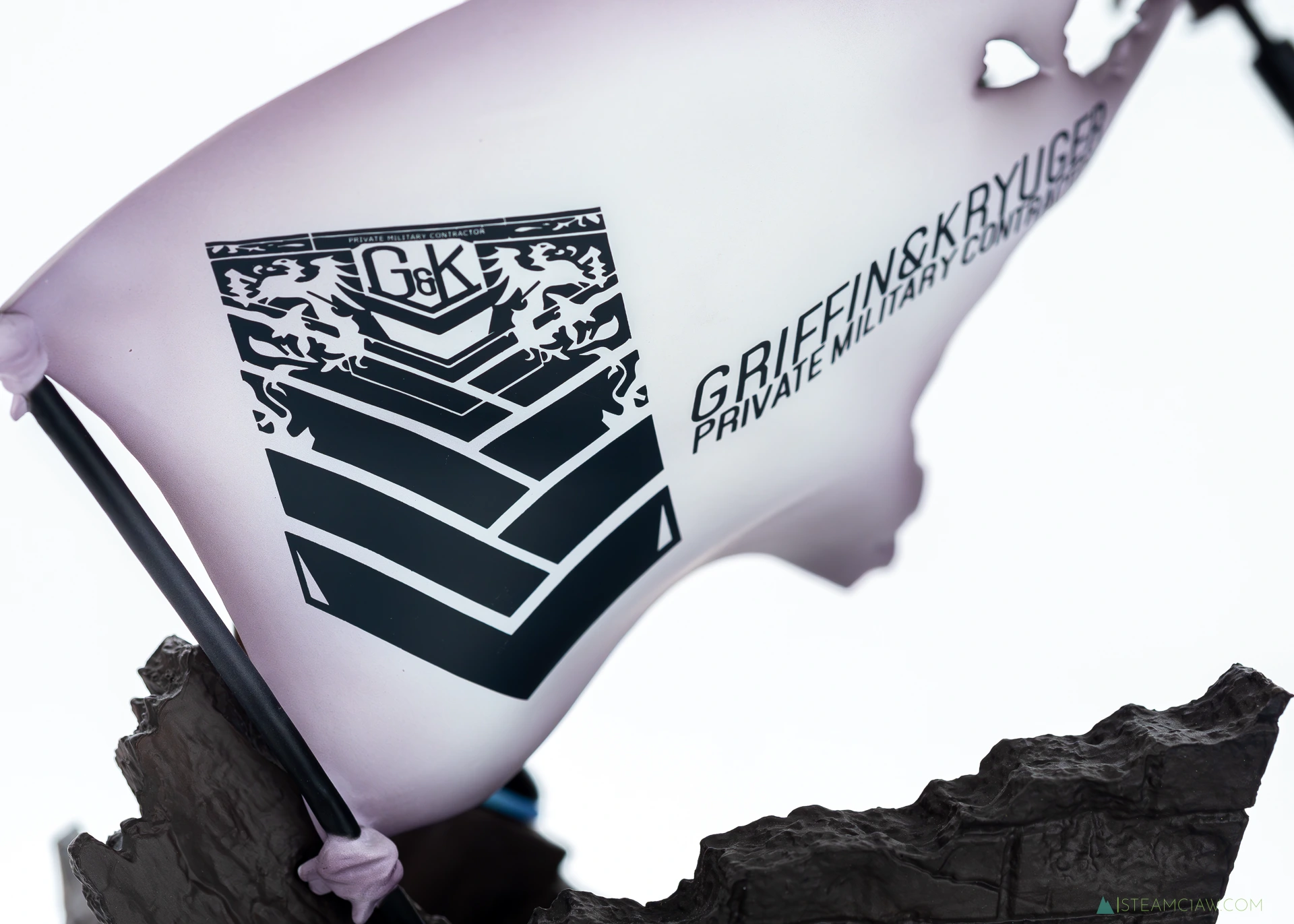 台座に固定する旗がアクセサリーとして付属。ゲーム内に登場する民間軍事会社である「グリフィン&クルーガー」のロゴと社名があしらわれていますが、クルーガーって一般的にはKRYUGERではなくKRUGERあるいはKRUEGERって綴りになるんじゃないですかね🤔