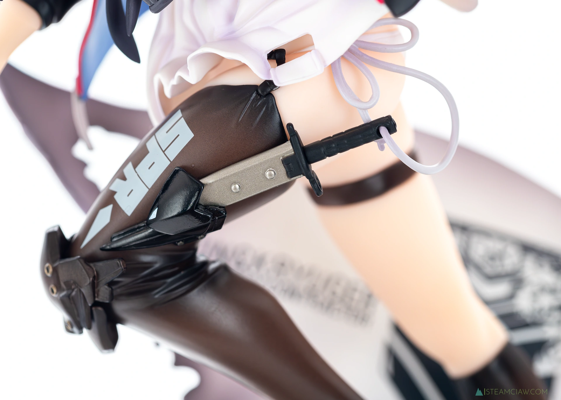 パッと見では紐パンに見えますが、これは左脚につけているコンバットナイフを吊るしているだけ。元絵では通常版、重傷版いずれもナイフをパンツから吊るしているような表現は見つからなかったのですが、フィギュアのオリジナル設定でしょうか。デザインのアクセントとしては結構好きなんですが、こんなところに吊るしていたらいざ抜剣したときに扱い難すぎるんじゃないでしょうか💧