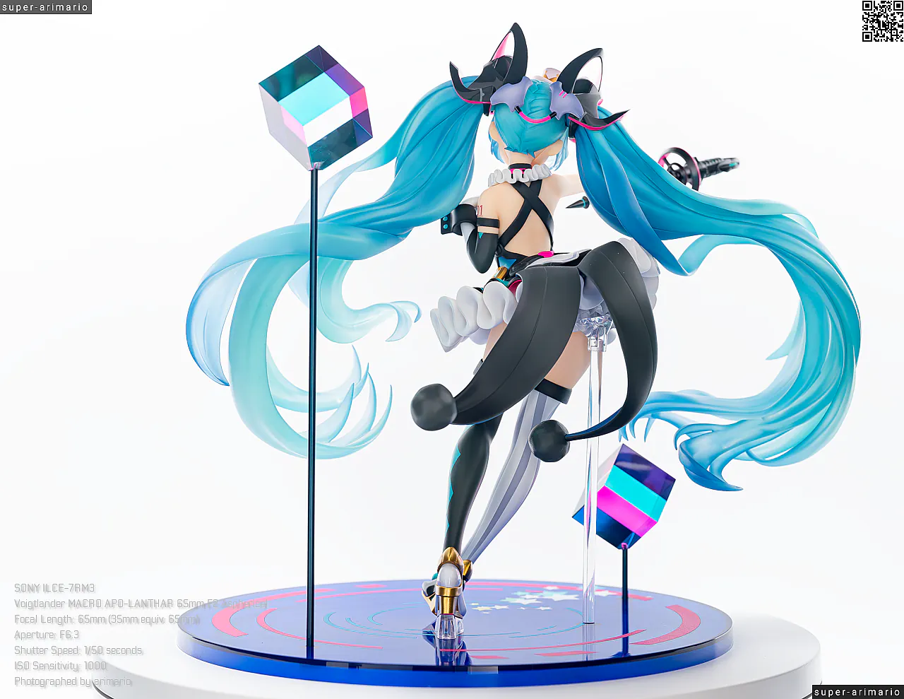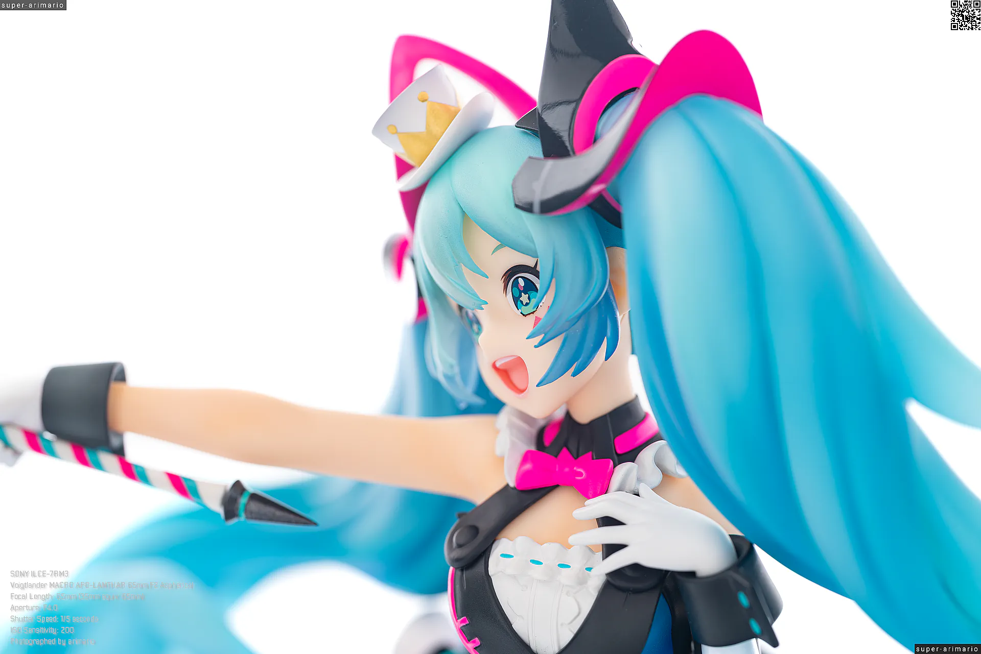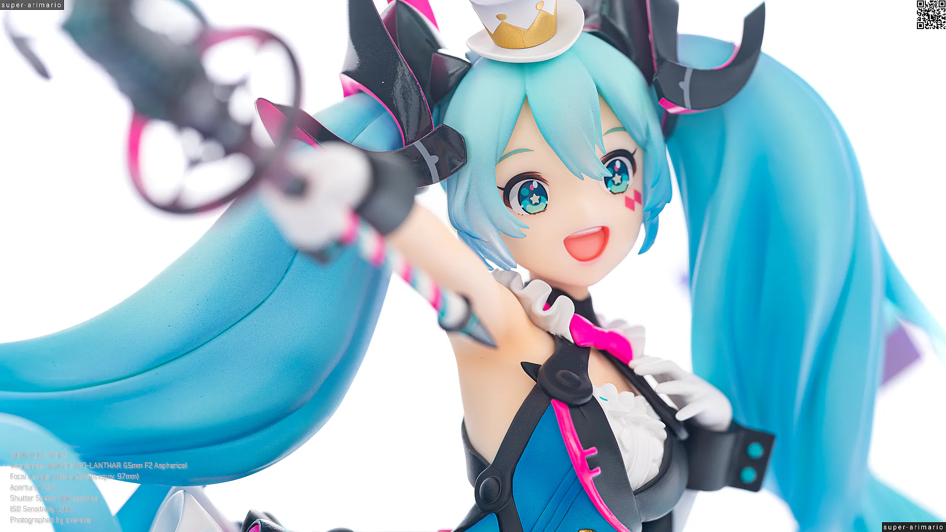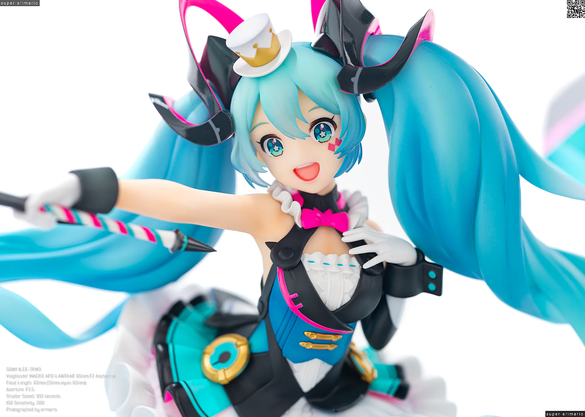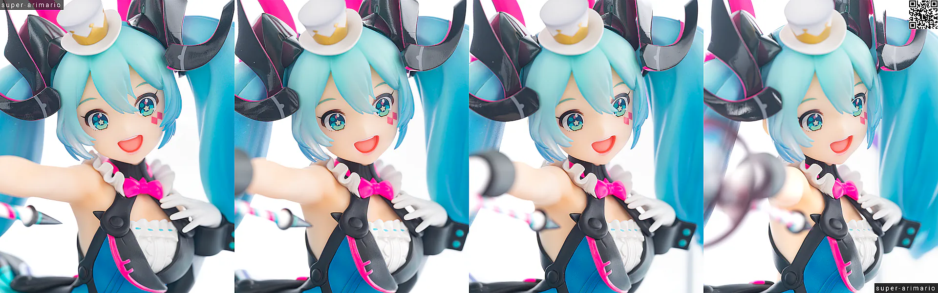 頭部には白とゴールドのマジシャンハットに加えて、ツヤっとしたブラックとネオンピンクの髪飾りが付属。猫耳モチーフなのかな。これは3パーツに分割されており、左右パーツを本体に差し込んだあと、後頭部側パーツを磁石で固定するという面白い構造になっています。ただ、このパーツはイマイチ据わりが良くないのと、塗装に値段なりのチープさを感じますね😓
