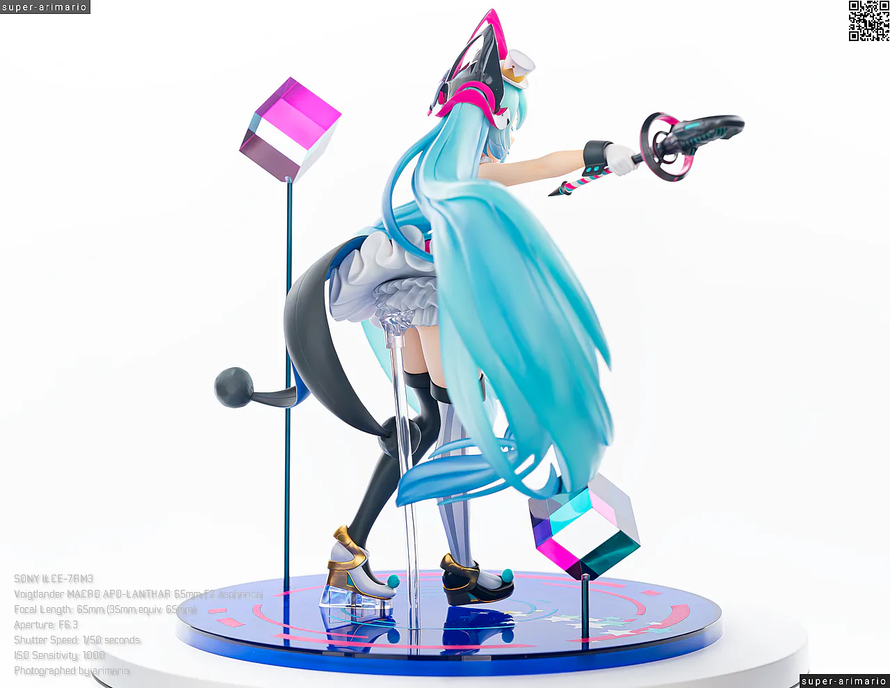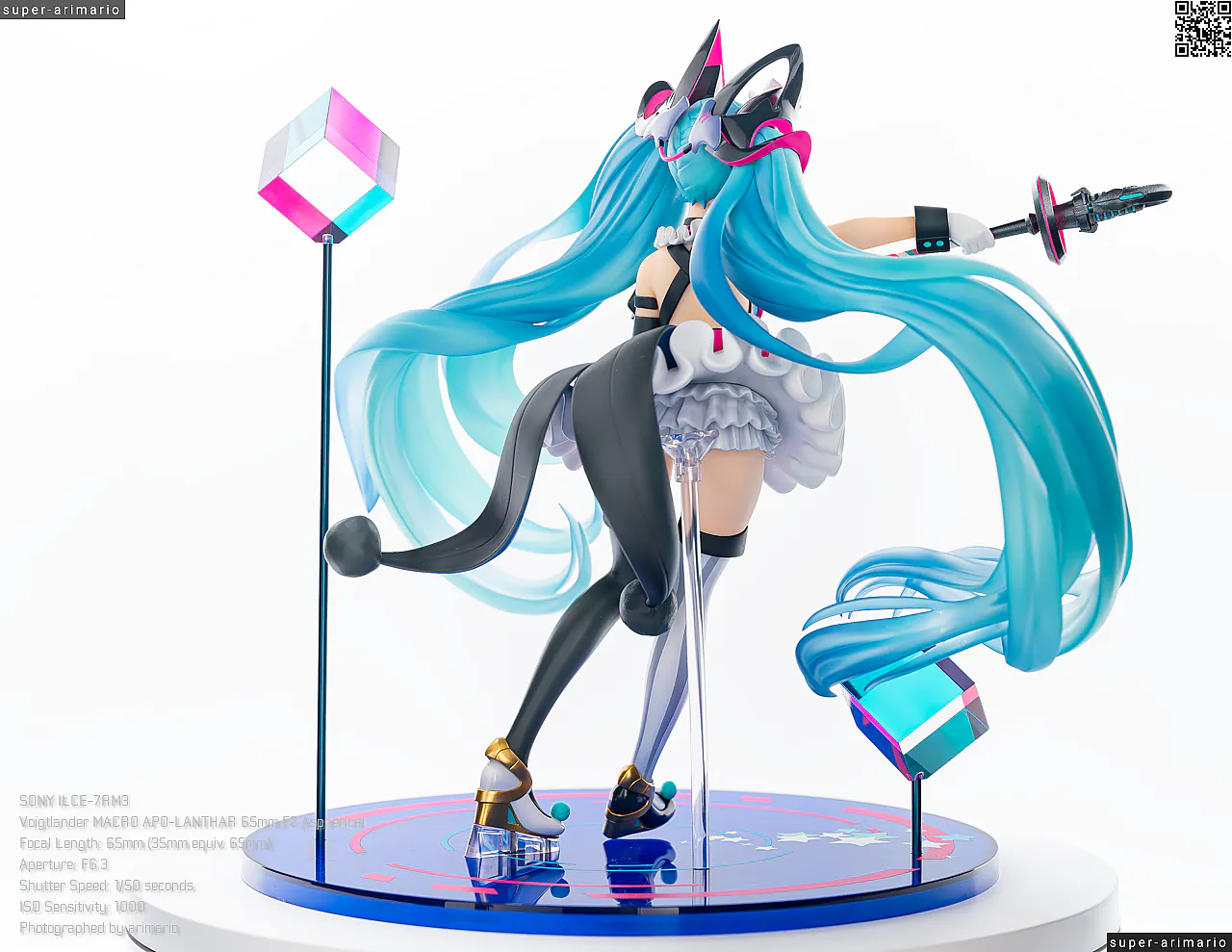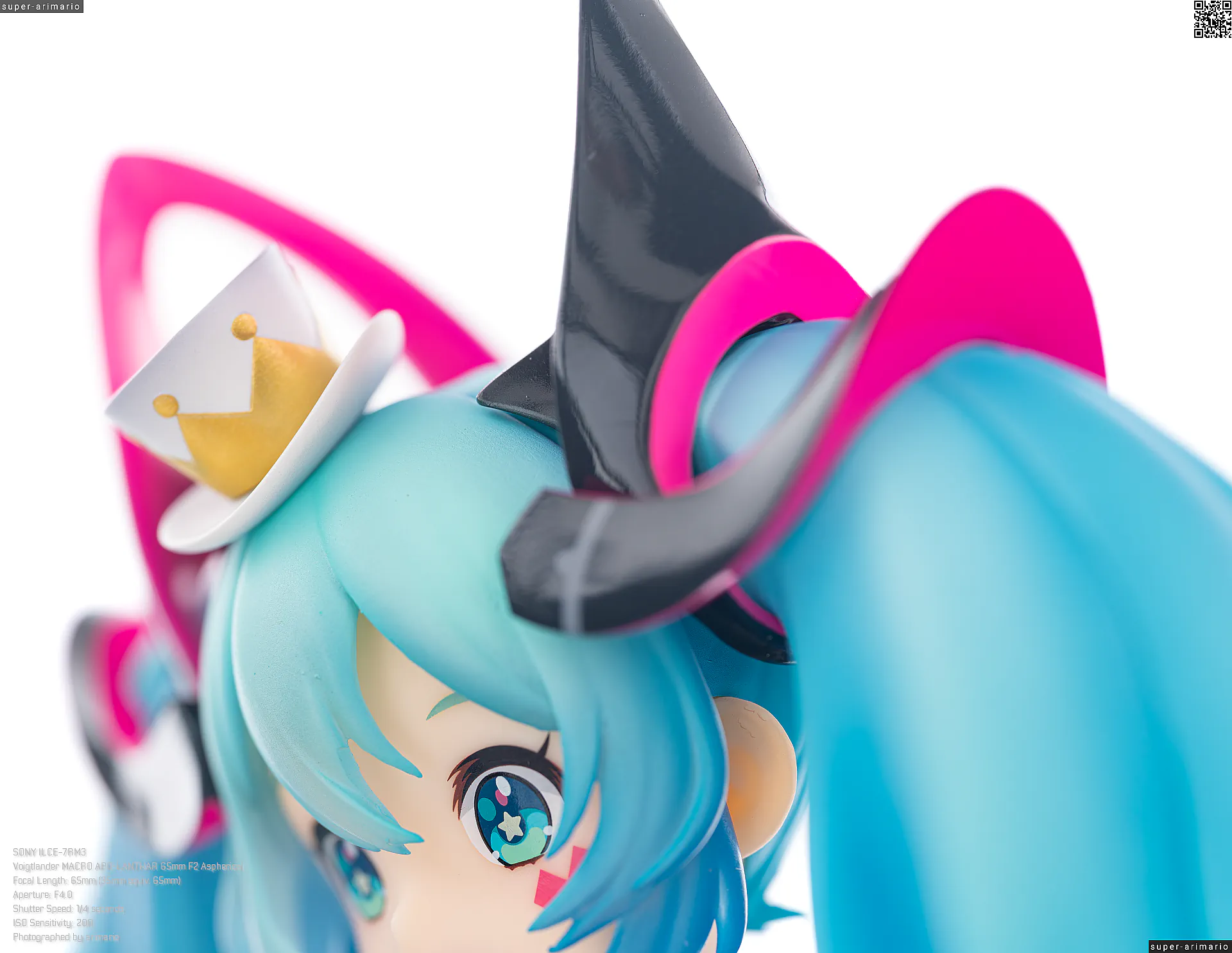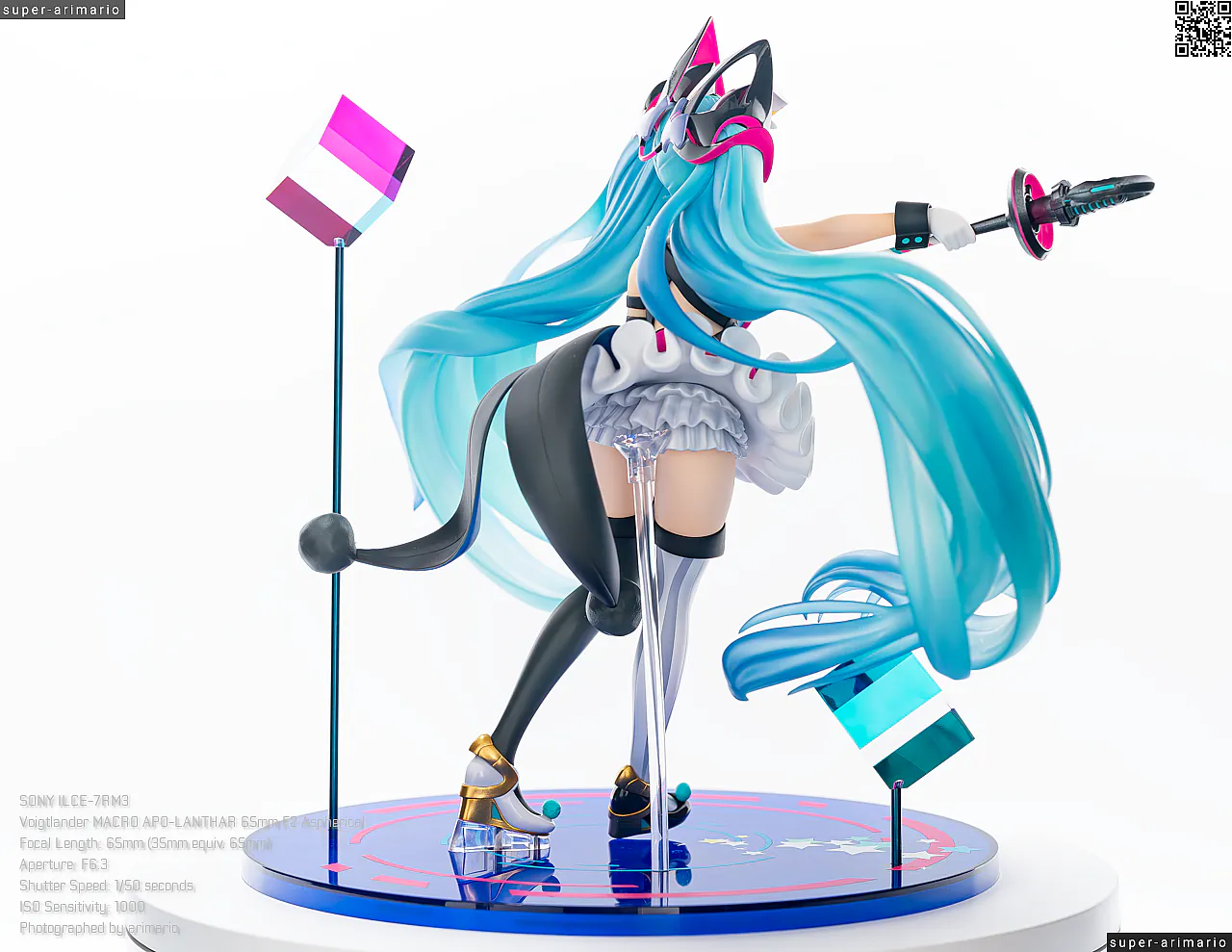 頭部には白とゴールドのマジシャンハットに加えて、ツヤっとしたブラックとネオンピンクの髪飾りが付属。猫耳モチーフなのかな。これは3パーツに分割されており、左右パーツを本体に差し込んだあと、後頭部側パーツを磁石で固定するという面白い構造になっています。ただ、このパーツはイマイチ据わりが良くないのと、塗装に値段なりのチープさを感じますね😓