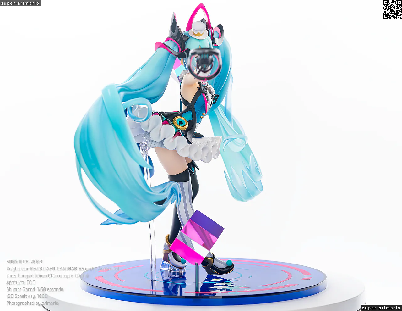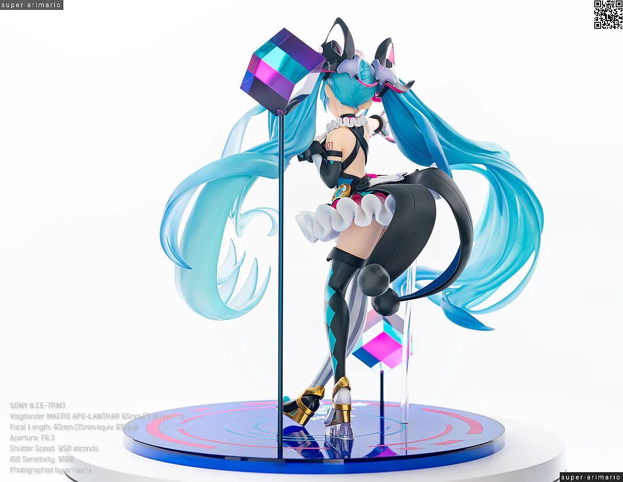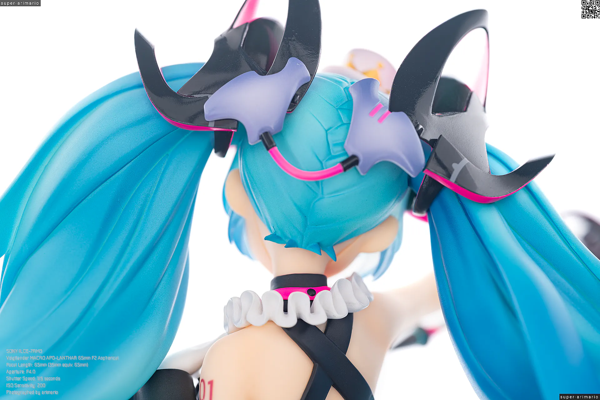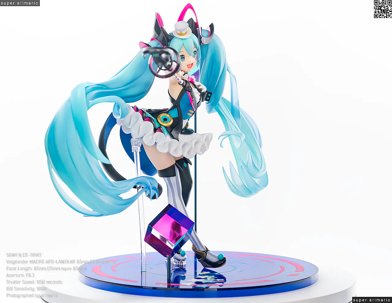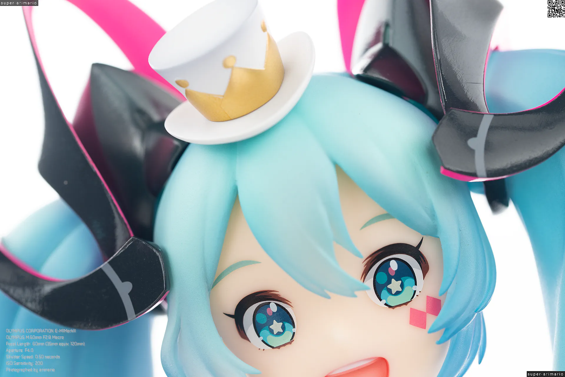 頭部には白とゴールドのマジシャンハットに加えて、ツヤっとしたブラックとネオンピンクの髪飾りが付属。猫耳モチーフなのかな。これは3パーツに分割されており、左右パーツを本体に差し込んだあと、後頭部側パーツを磁石で固定するという面白い構造になっています。ただ、このパーツはイマイチ据わりが良くないのと、塗装に値段なりのチープさを感じますね😓