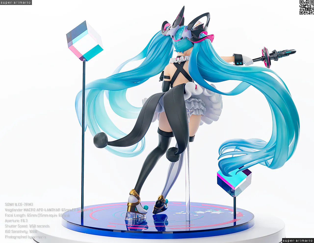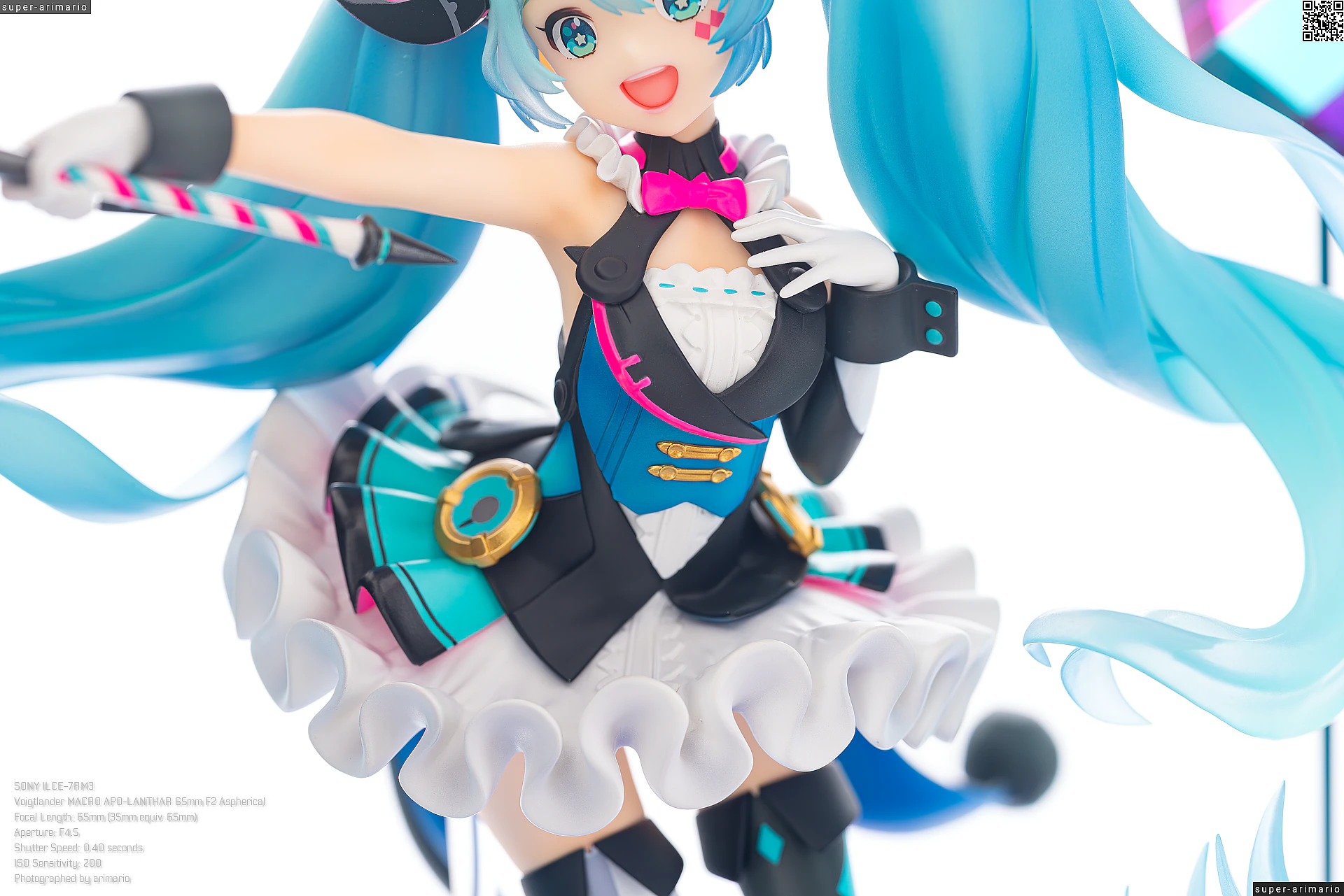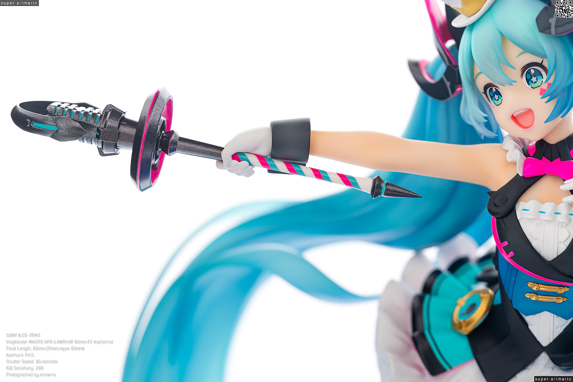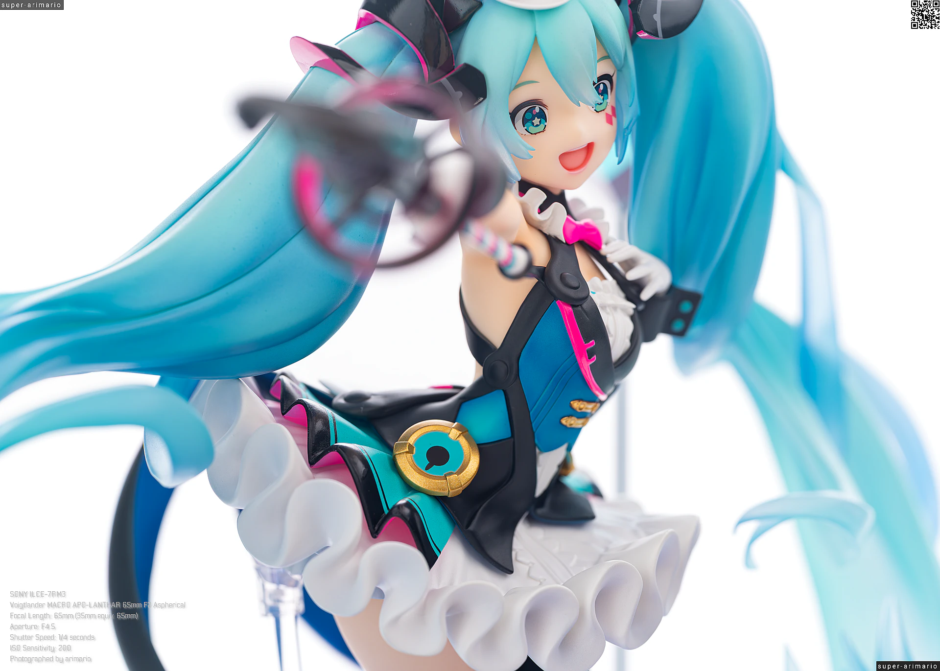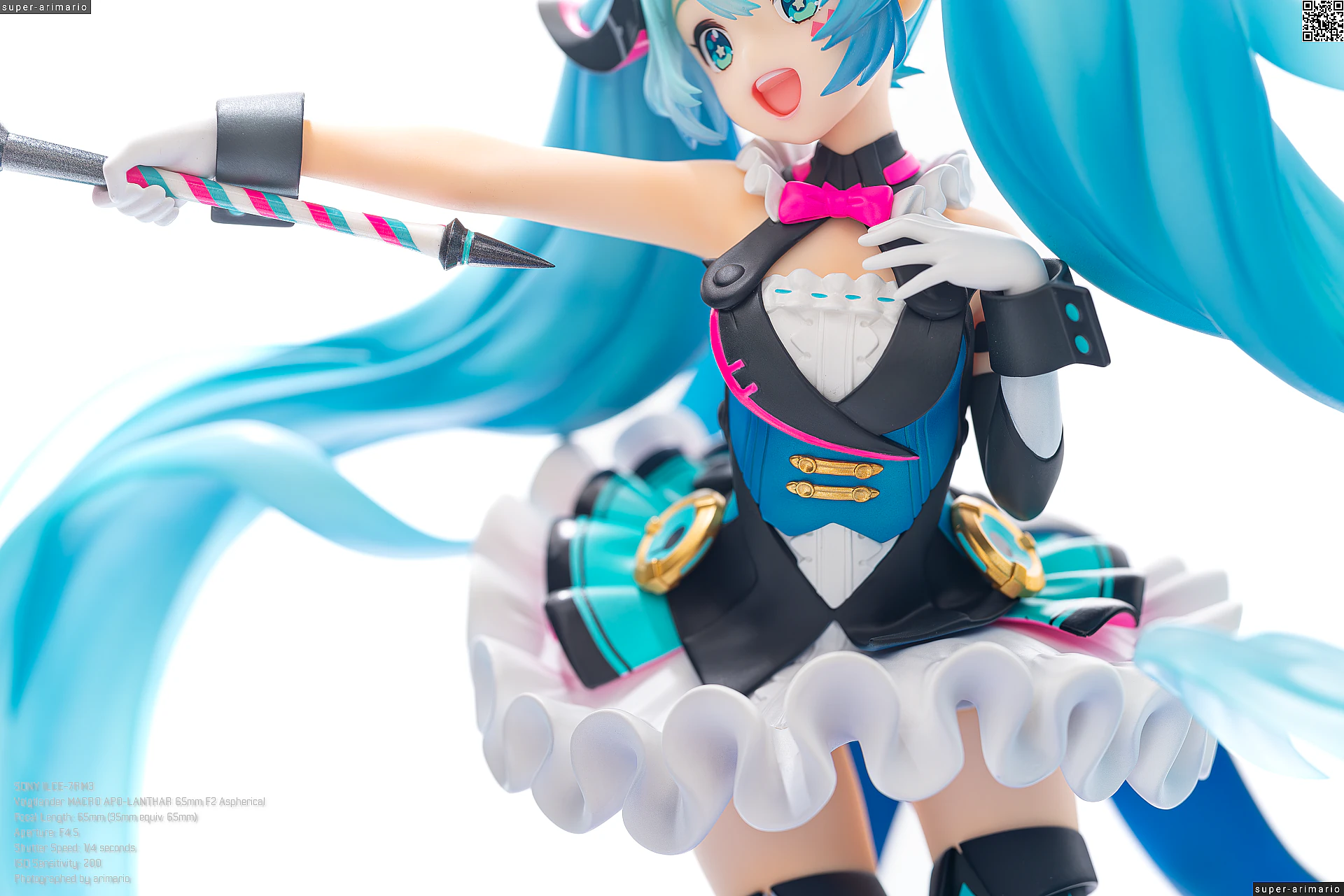 頭部には白とゴールドのマジシャンハットに加えて、ツヤっとしたブラックとネオンピンクの髪飾りが付属。猫耳モチーフなのかな。これは3パーツに分割されており、左右パーツを本体に差し込んだあと、後頭部側パーツを磁石で固定するという面白い構造になっています。ただ、このパーツはイマイチ据わりが良くないのと、塗装に値段なりのチープさを感じますね😓