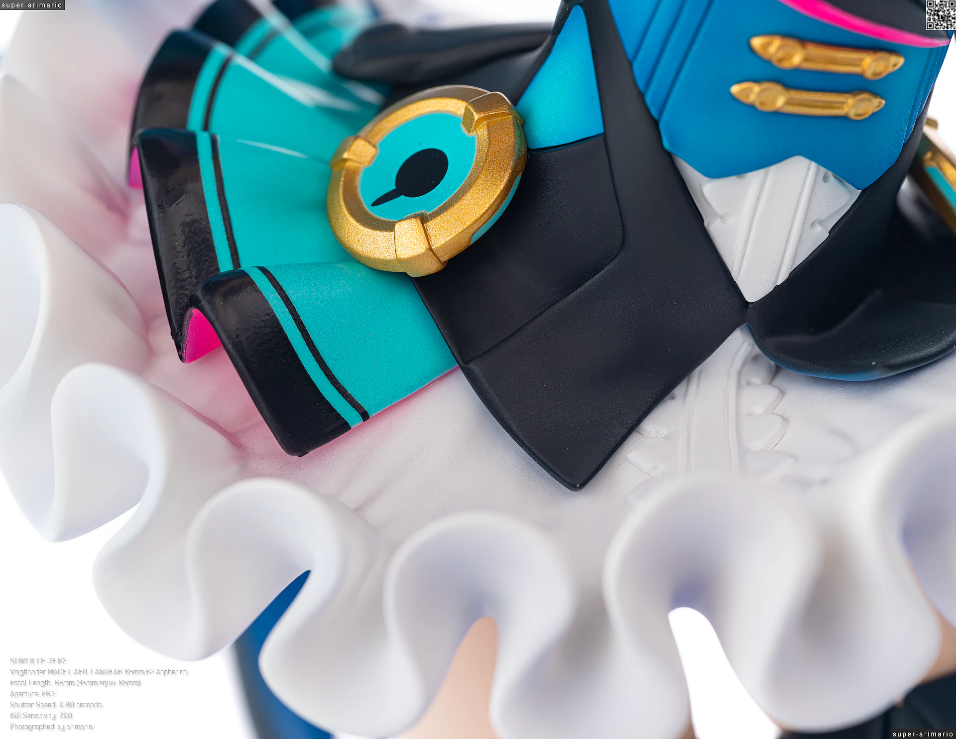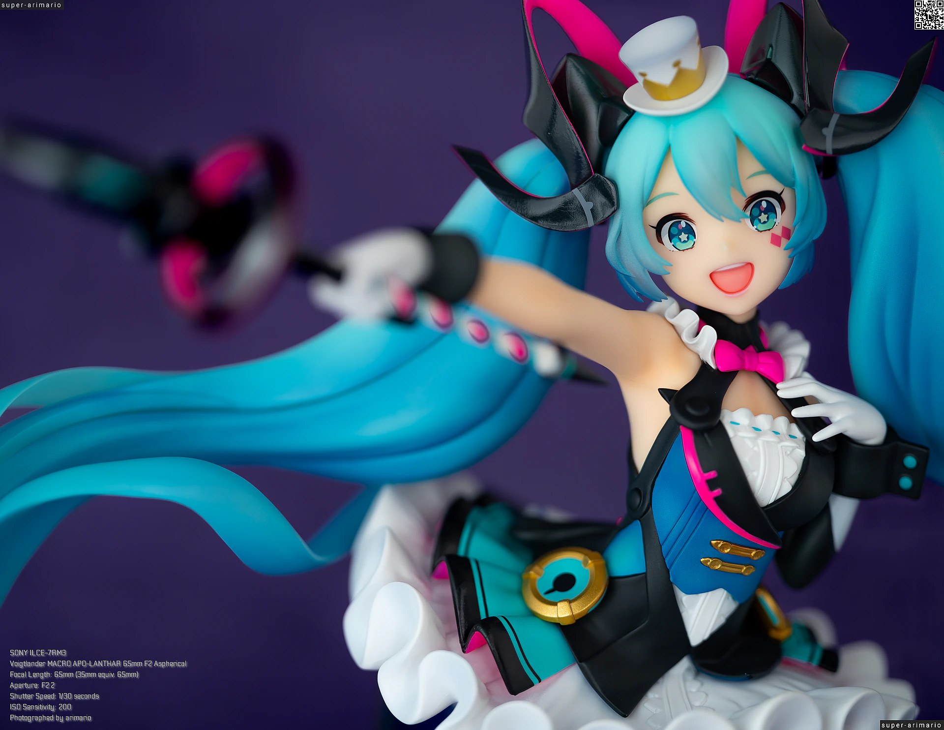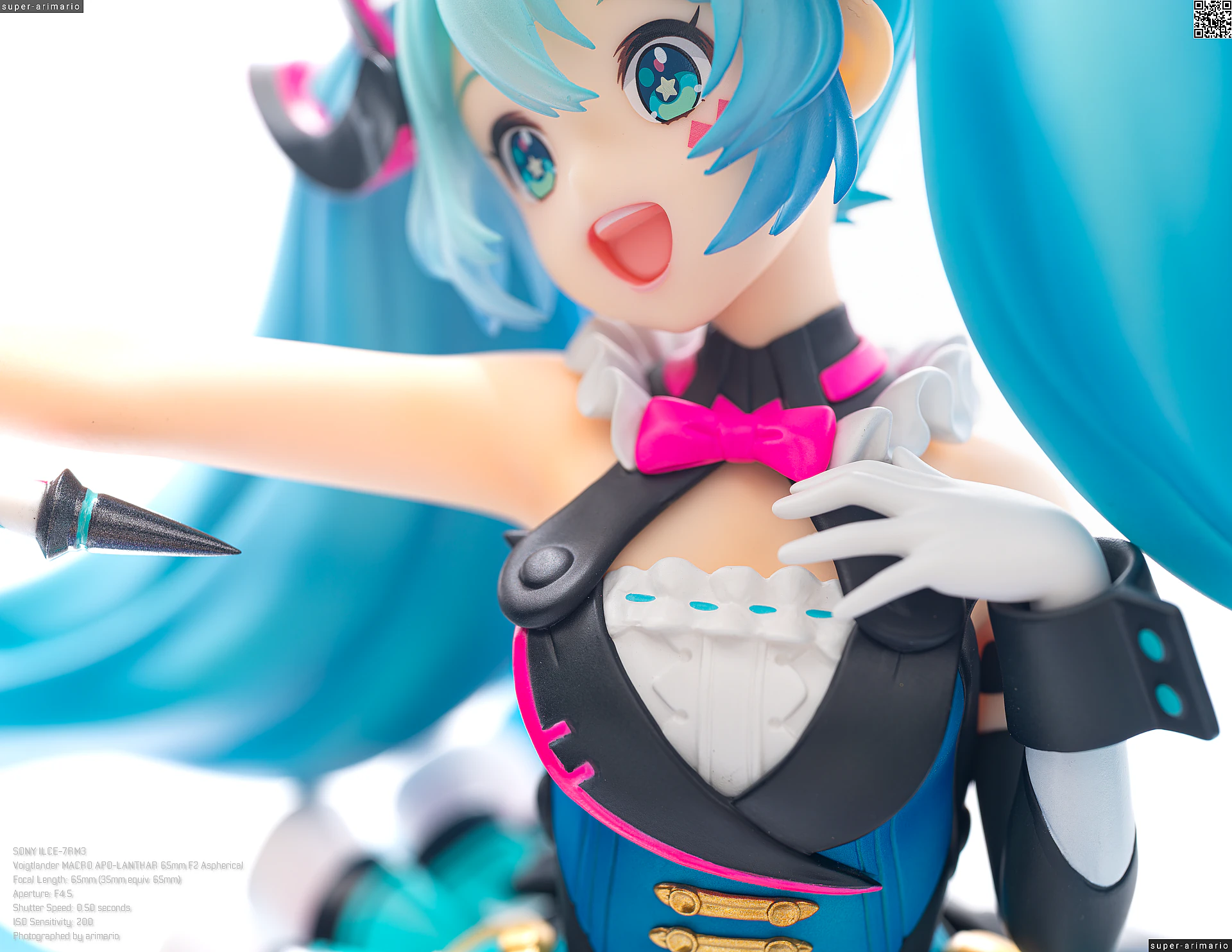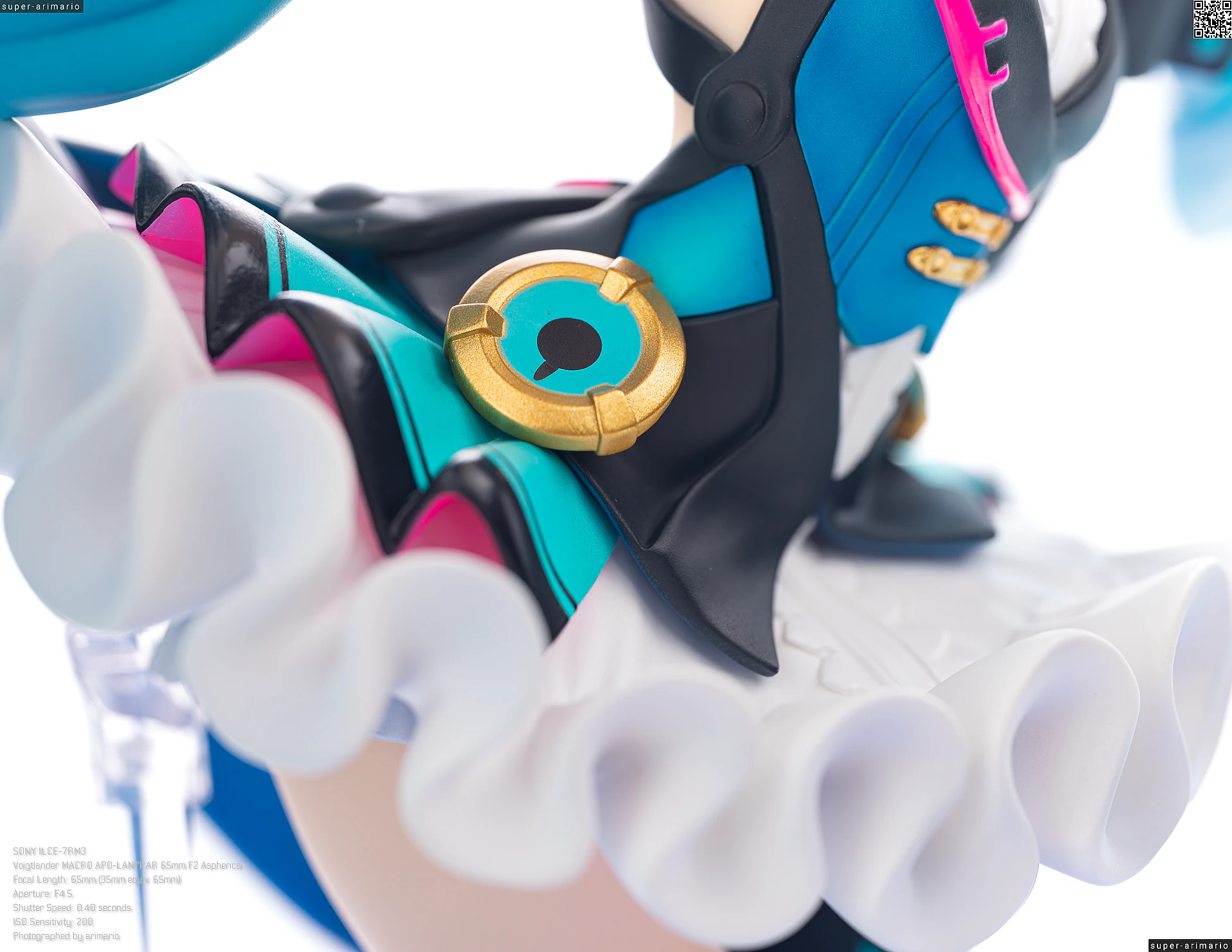 頭部には白とゴールドのマジシャンハットに加えて、ツヤっとしたブラックとネオンピンクの髪飾りが付属。猫耳モチーフなのかな。これは3パーツに分割されており、左右パーツを本体に差し込んだあと、後頭部側パーツを磁石で固定するという面白い構造になっています。ただ、このパーツはイマイチ据わりが良くないのと、塗装に値段なりのチープさを感じますね😓