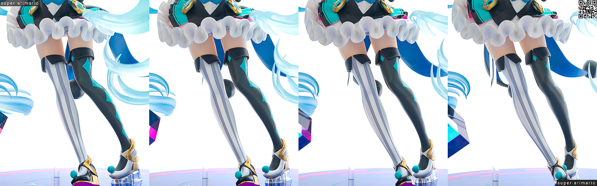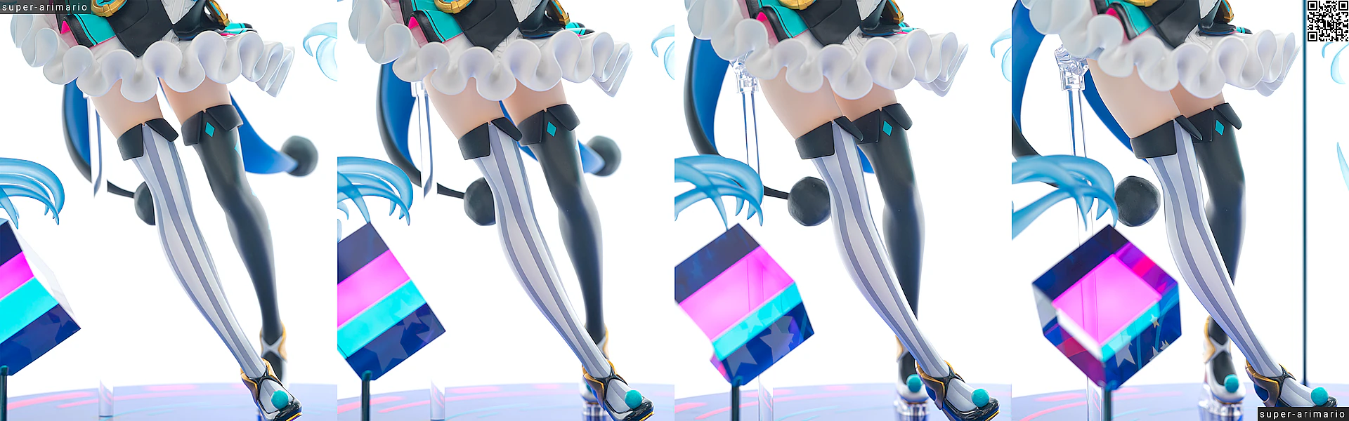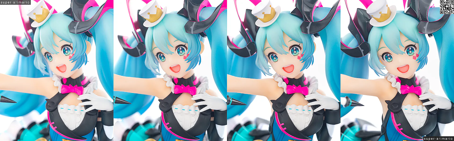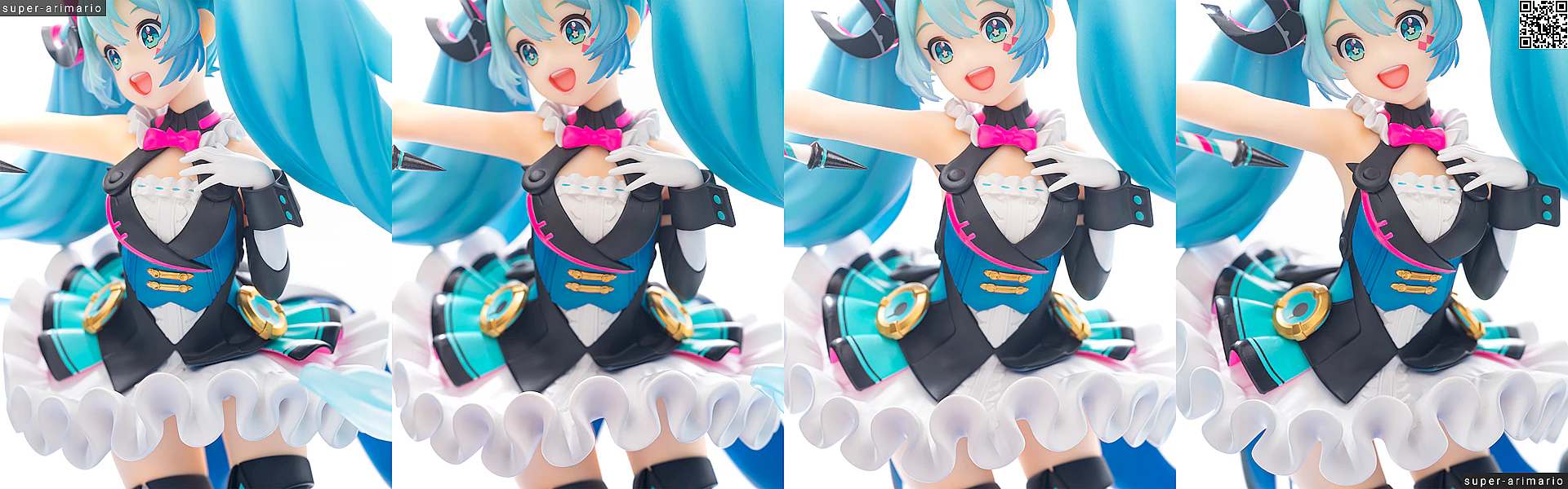 これはフィギュアというよりも元絵の功績ですが、差し色の入れ方が丁度いい塩梅。ピンクはベストの縁や蝶ネクタイのほか、ベストの裏側にも入れられています。白いスカートに反射するネオンピンクが美しい。ターコイズのようなブルー色も、胴部と腰部、さらにベストのテール裏とで濃淡がつけられているなど、芸が細かいです。このブルーの使い分けはフィギュア独自のアレンジ。塗り分けもしっかりしていますね。