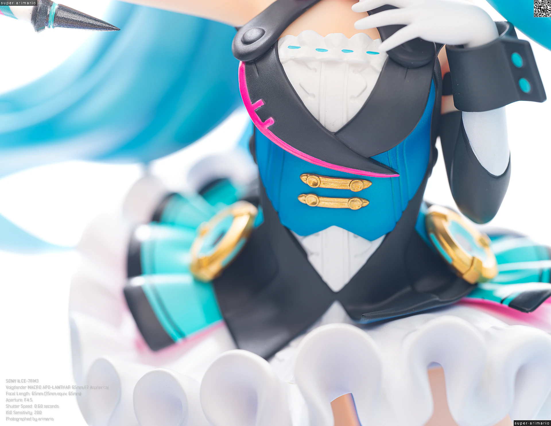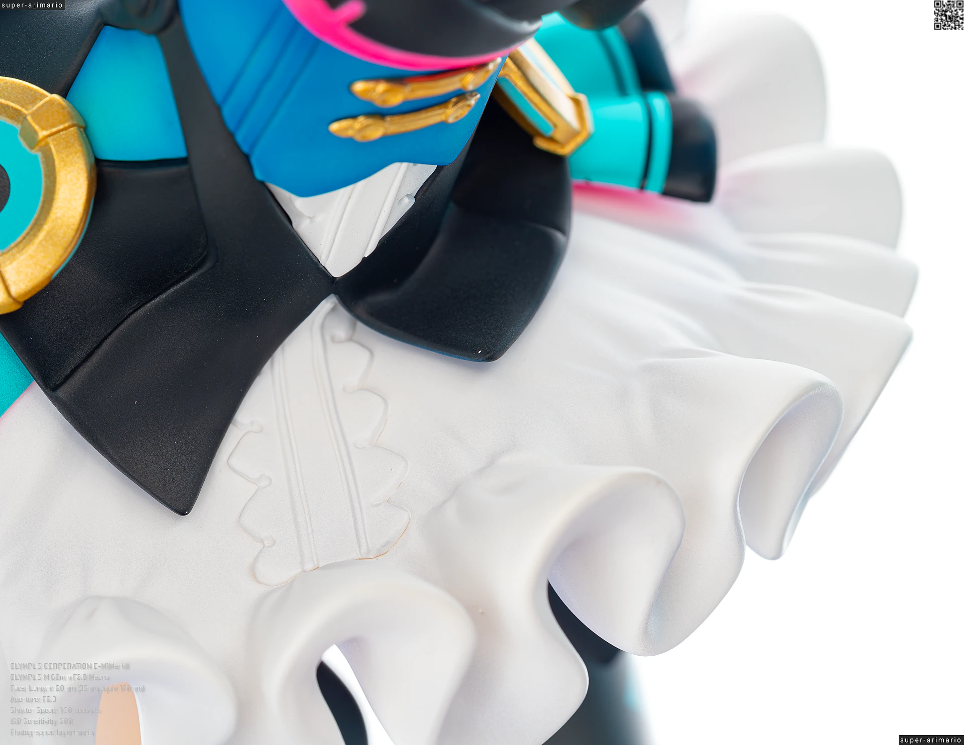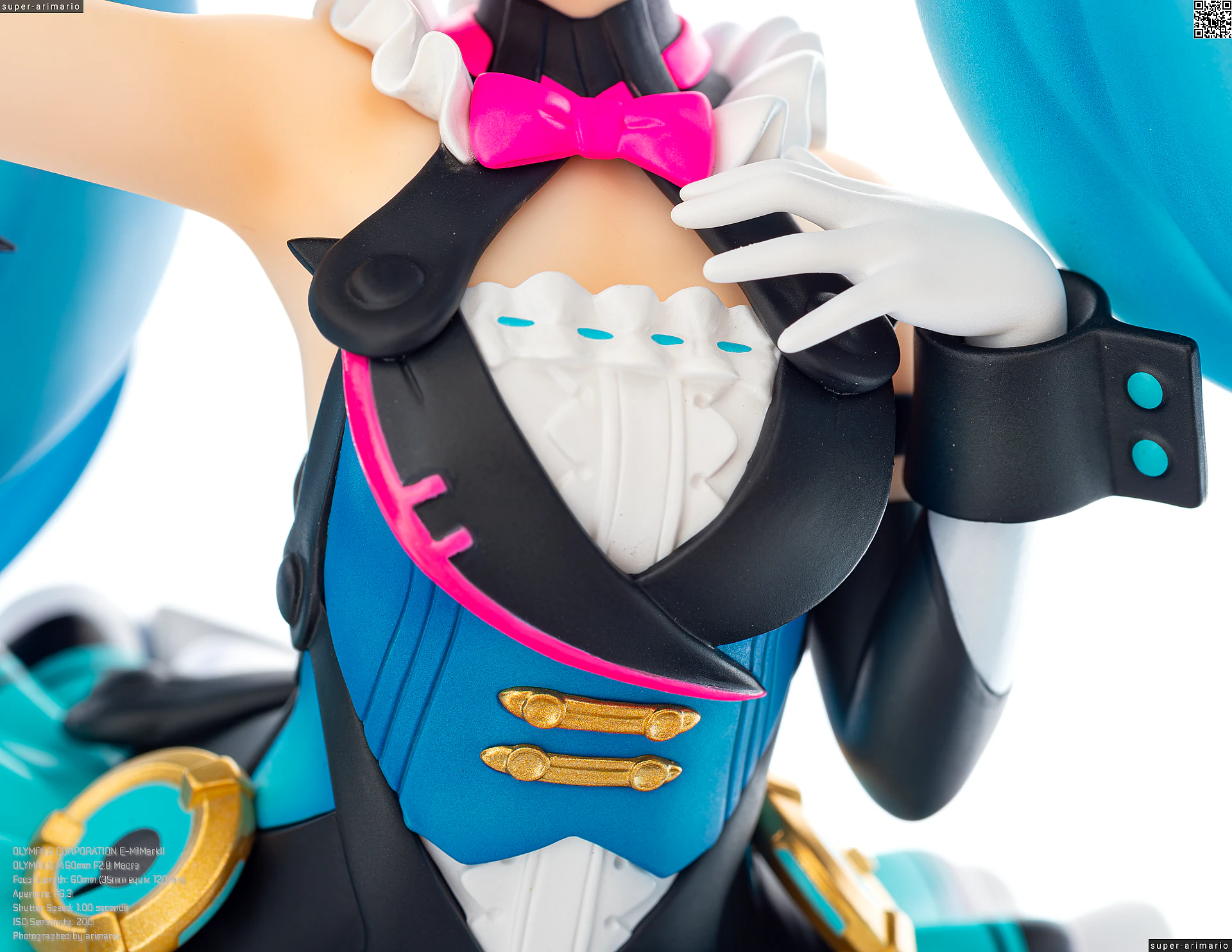 これはフィギュアというよりも元絵の功績ですが、差し色の入れ方が丁度いい塩梅。ピンクはベストの縁や蝶ネクタイのほか、ベストの裏側にも入れられています。白いスカートに反射するネオンピンクが美しい。ターコイズのようなブルー色も、胴部と腰部、さらにベストのテール裏とで濃淡がつけられているなど、芸が細かいです。このブルーの使い分けはフィギュア独自のアレンジ。塗り分けもしっかりしていますね。