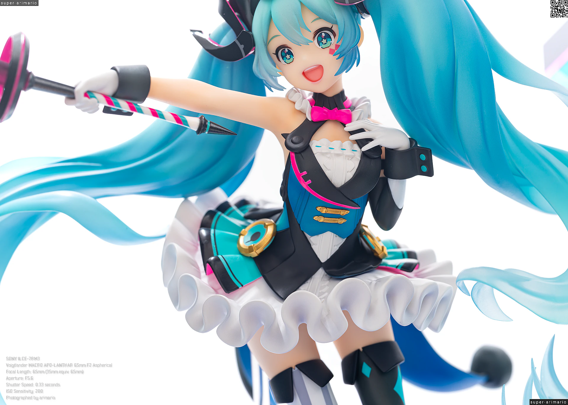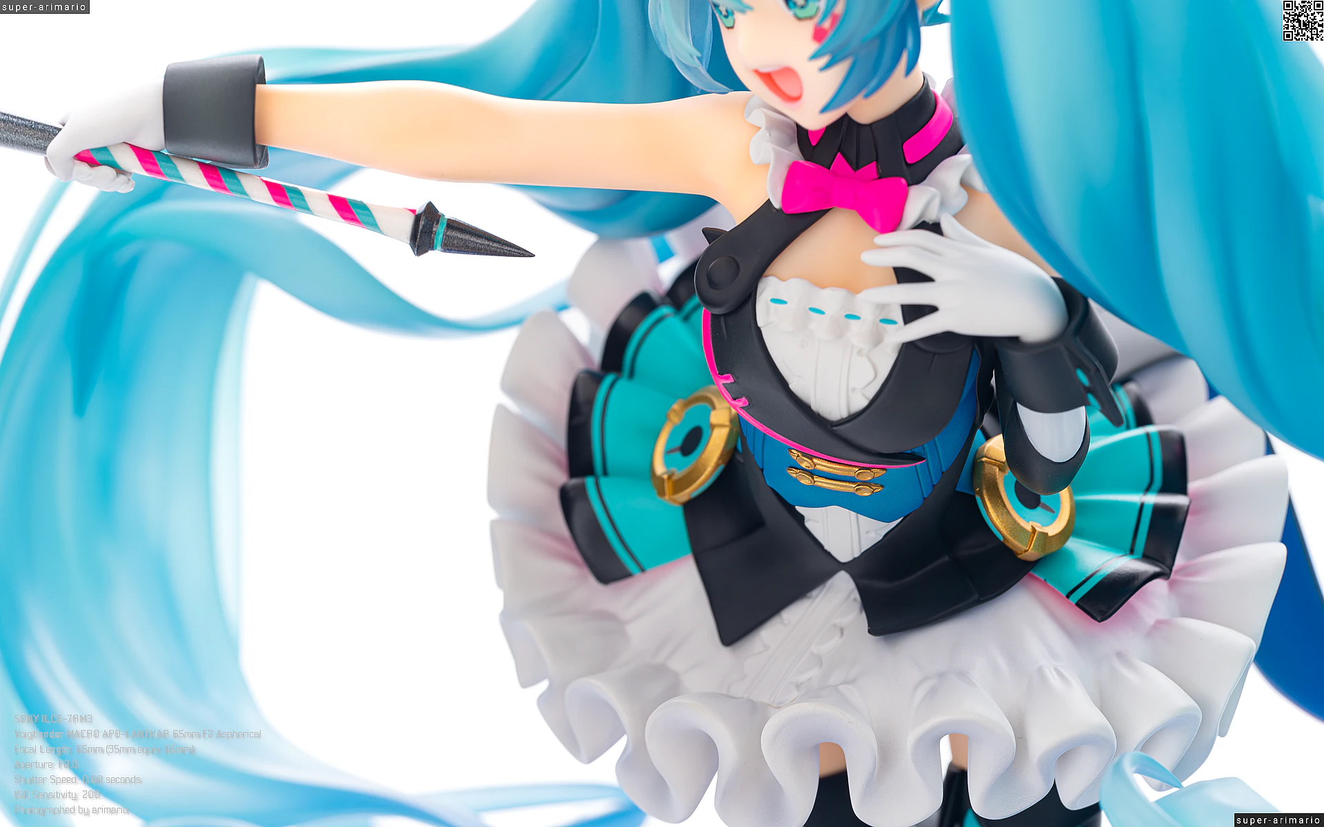 デザイナーさん曰く「ミクちゃんらしい未来感と、クラシカルになりすぎないサーカス感の両立を目指してデザイン」したとのこと。衣装デザインは奇術師をモチーフにしたものでしょうか。白黒基調の衣装ですが初音ミクのイメージカラーであるピンクとブルーも随所に散りばめられています。鮮やかな原色の差し色やマイク、髪飾りなどの小物は近未来的なデザイン。