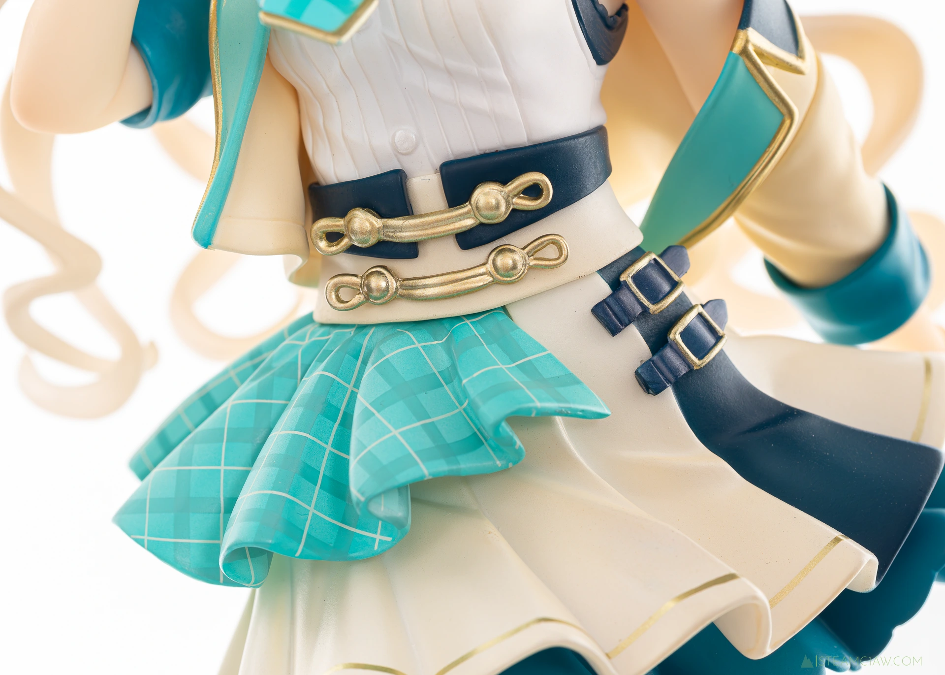 孔雀色のような青緑のアクセントカラーが特徴的。ネクタイと腰部の布はチェック柄になっているのですが、複雑な柄にもかかわらず綺麗な仕上げ。目立つパーツなので、ここの塗装がしっかりしているのは嬉しい。ゴールドの縁取りやバックルなど細かい装飾も含めて、塗装の目立つはみ出しやガタつきは見られませんが、細かいところはちょくちょく塗りムラなど見られます。この個体は一箇所、ジャケットのラペルにゴールド塗装が飛んでしまっていますね😕