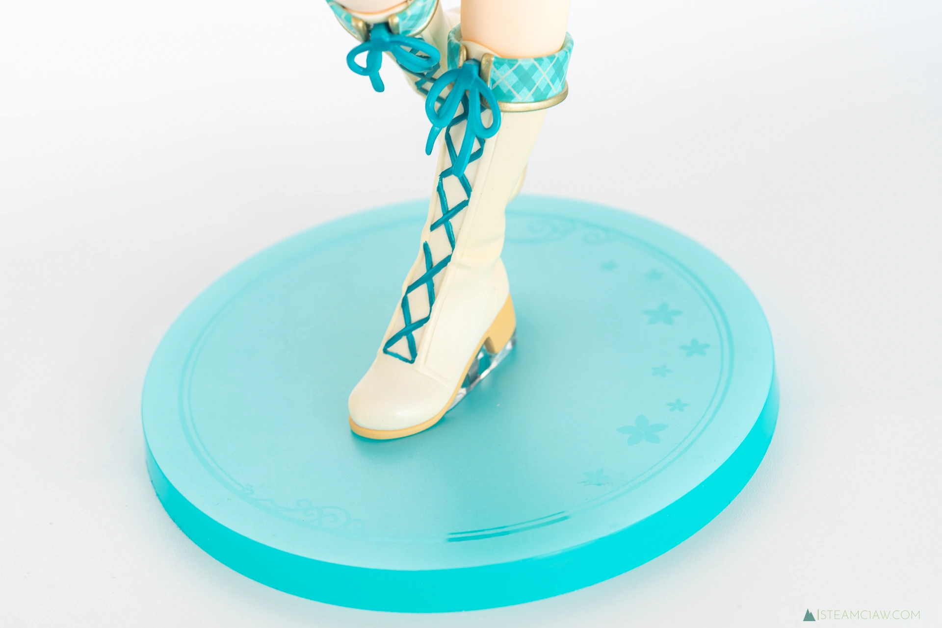 台座は本体のシンプルな造形にあわせてコンパクトなつくり。色はキャラクターのイメージカラーにあわせた翡翠色。花柄などの装飾も入っていますが、シンプルなプラスチック台座です。