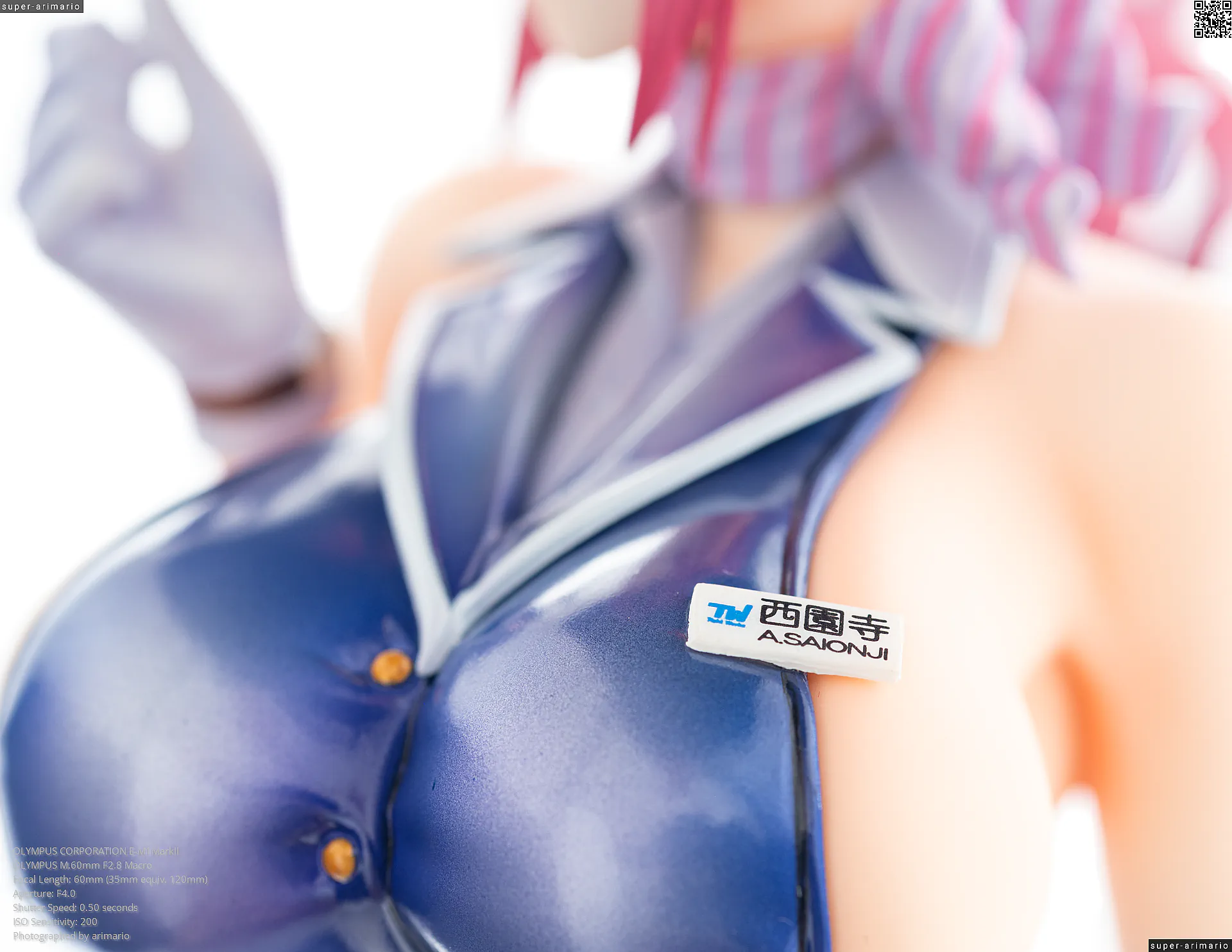 胸元のシャツは、元のイラストレーションでは白シャツとなっている一方で、フィギュアのほうではシルバーのような灰色で塗装されています。これは上着のメタリックブルー塗装にあわせたのかな。胸元には「A.SAIONJI 西園寺」と書かれた名札を着用。『タイトなおしごと』のロゴが入っているという遊び心がいいですね。