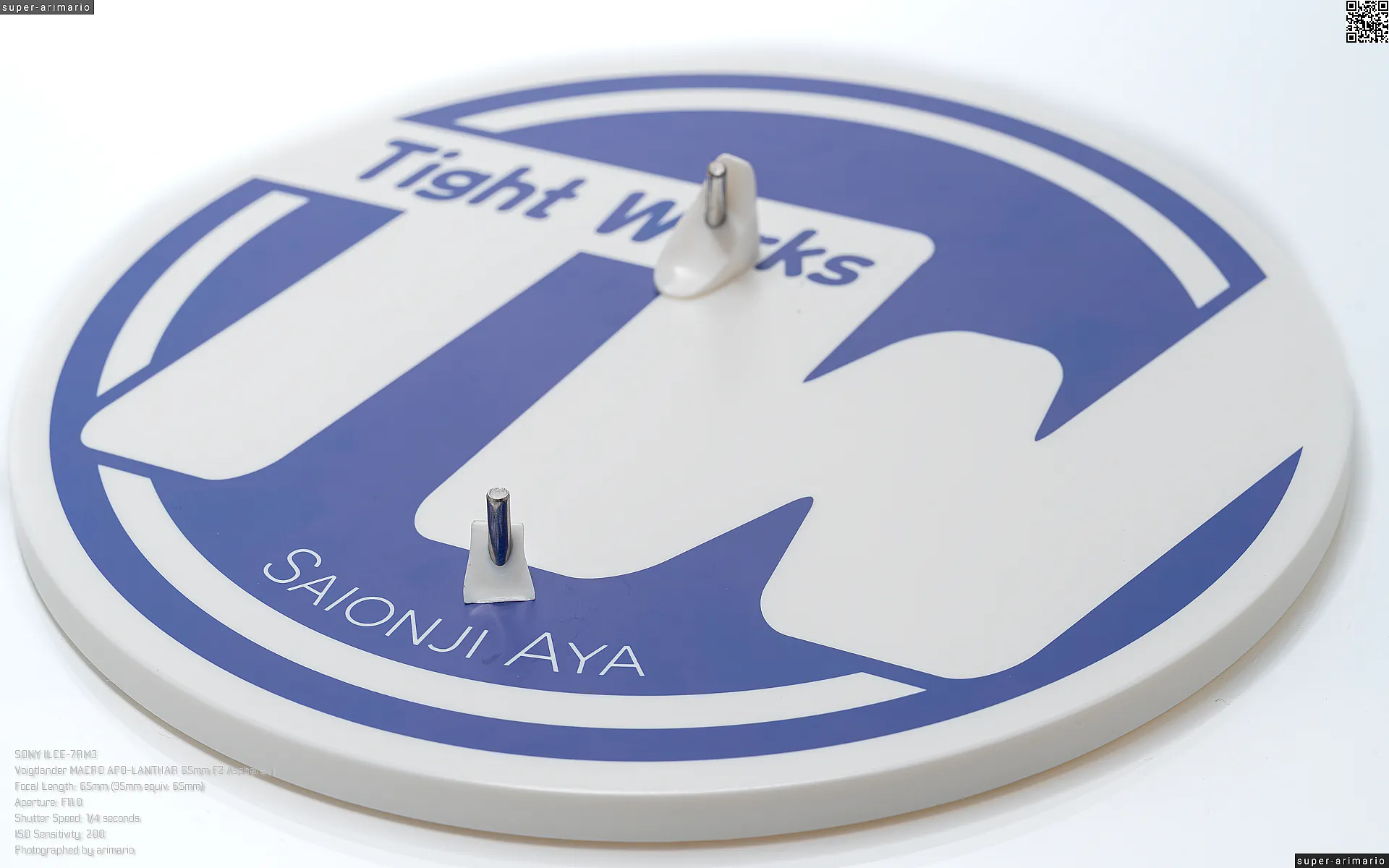台座には「Tight Works (= タイトなおしごと)」の文字とTWシリーズのロゴ、そしてCAさんの名前である「SAIONJI AYA」の文字があしらわれています。青と白のコンビカラーでフィギュア本体のカラーリングともしっかりマッチ。これ以前の同シリーズ商品では、台座はただの透明なアクリル円盤だったようなので、これは大きな進化です。